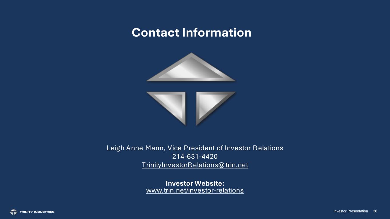 36Investor Presentation Leigh Anne Mann, Vice President of Investor R elations 214-631-4420 TrinityInvestorR elations@ trin.net Investor Website: www.trin.net/investor-relations Contact Information