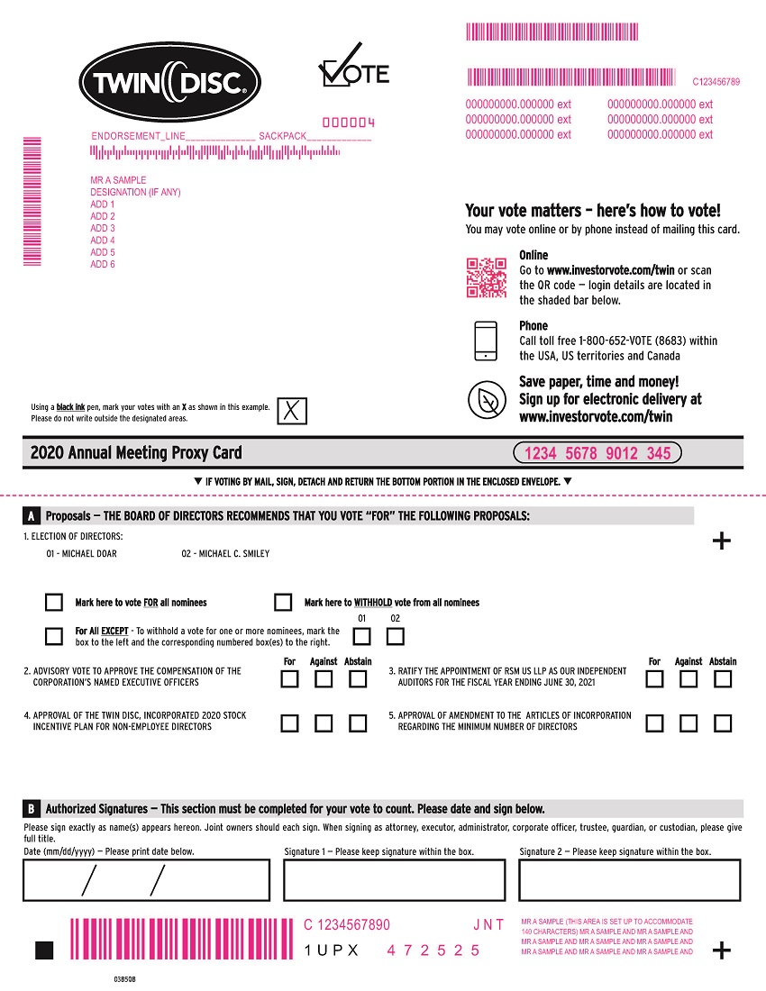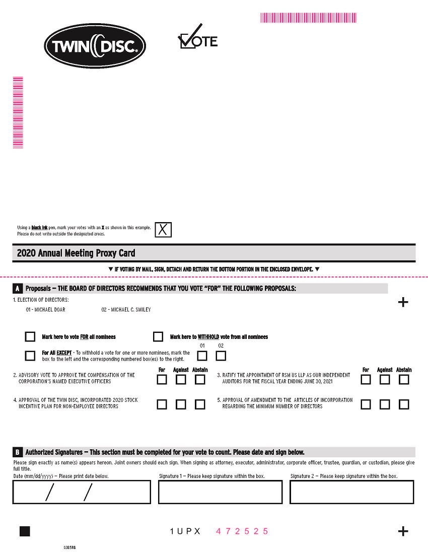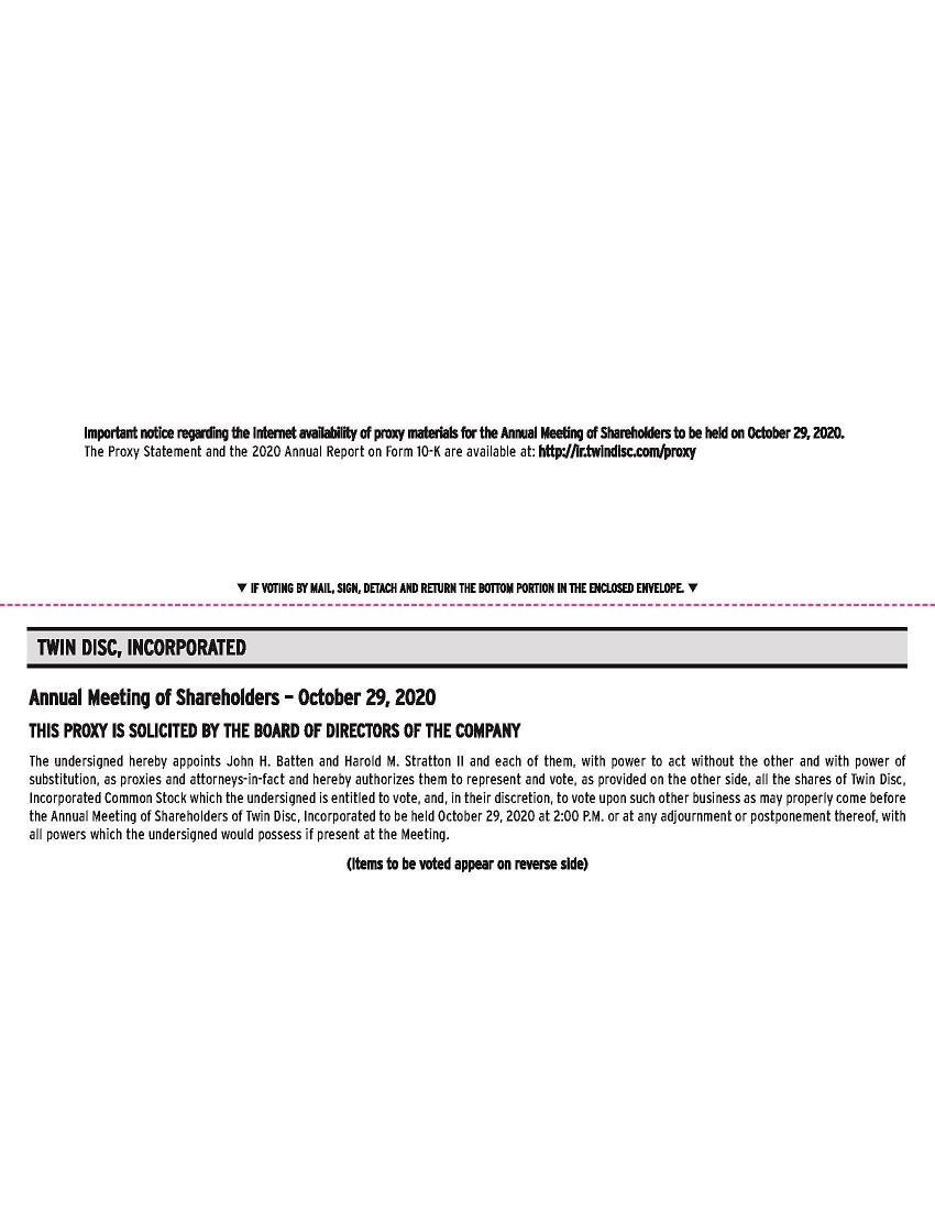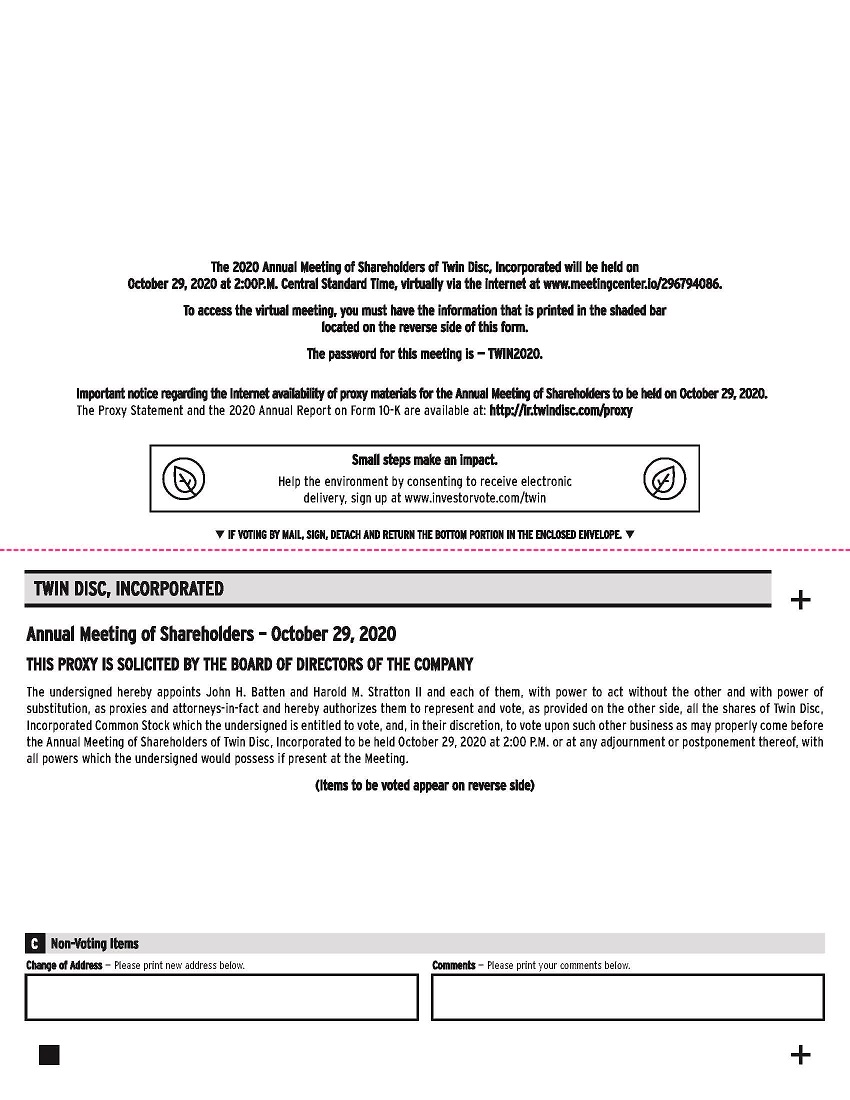 Our proxy materials, including the Proxy Statement and 2020 Annual Report on Form 10-K, are available over the internet at http://ir.twindisc.com/proxy, and most of our stockholders will receive only a notice (“Notice”) containing instructions on how to access the proxy materials over the internet and vote online. If you receive this Notice but would still like to receive paper copies of the proxy materials, please follow the instructions on the Notice or on the website referred to on the Notice.