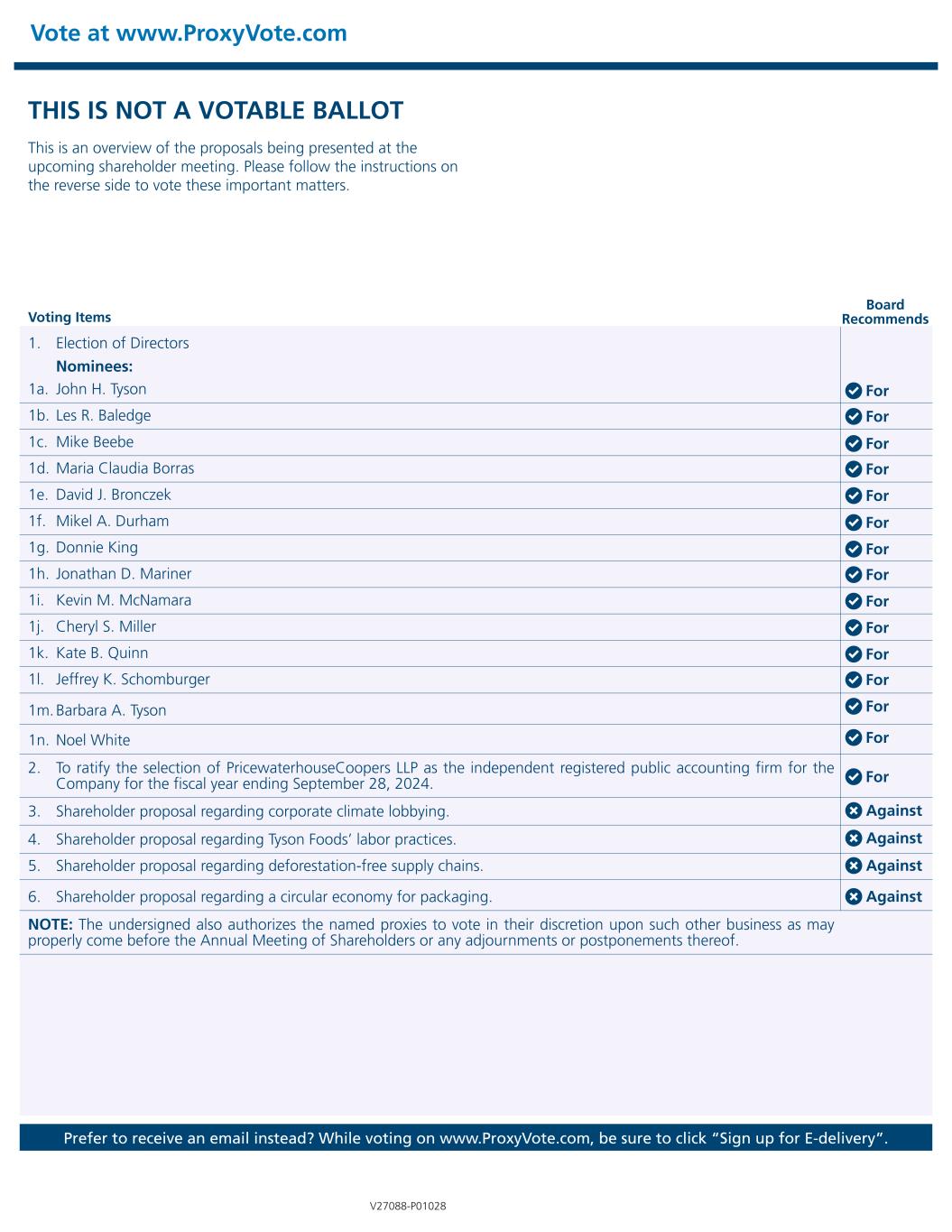 THIS IS NOT A VOTABLE BALLOT This is an overview of the proposals being presented at the upcoming shareholder meeting. Please follow the instructions on the reverse side to vote these important matters. Vote at www.ProxyVote.com Prefer to receive an email instead? While voting on www.ProxyVote.com, be sure to click “Sign up for E-delivery”. Voting Items Board Recommends V27088-P01028 1. Election of Directors Nominees: 1a. John H. Tyson 1c. Mike Beebe 1b. Les R. Baledge 1d. Maria Claudia Borras 1e. David J. Bronczek 1f. Mikel A. Durham 1g. Donnie King 1h. Jonathan D. Mariner 1i. Kevin M. McNamara 1j. Cheryl S. Miller 1k. Kate B. Quinn 1l. Jeffrey K. Schomburger 1n. Noel White 2. To ratify the selection of PricewaterhouseCoopers LLP as the independent registered public accounting firm for the Company for the fiscal year ending September 28, 2024. 3. Shareholder proposal regarding corporate climate lobbying. 4. Shareholder proposal regarding Tyson Foods’ labor practices. 5. Shareholder proposal regarding deforestation-free supply chains. 6. Shareholder proposal regarding a circular economy for packaging. NOTE: The undersigned also authorizes the named proxies to vote in their discretion upon such other business as may properly come before the Annual Meeting of Shareholders or any adjournments or postponements thereof. For For For For For For For For For For For For For For For 1m. Barbara A. Tyson Against Against Against Against