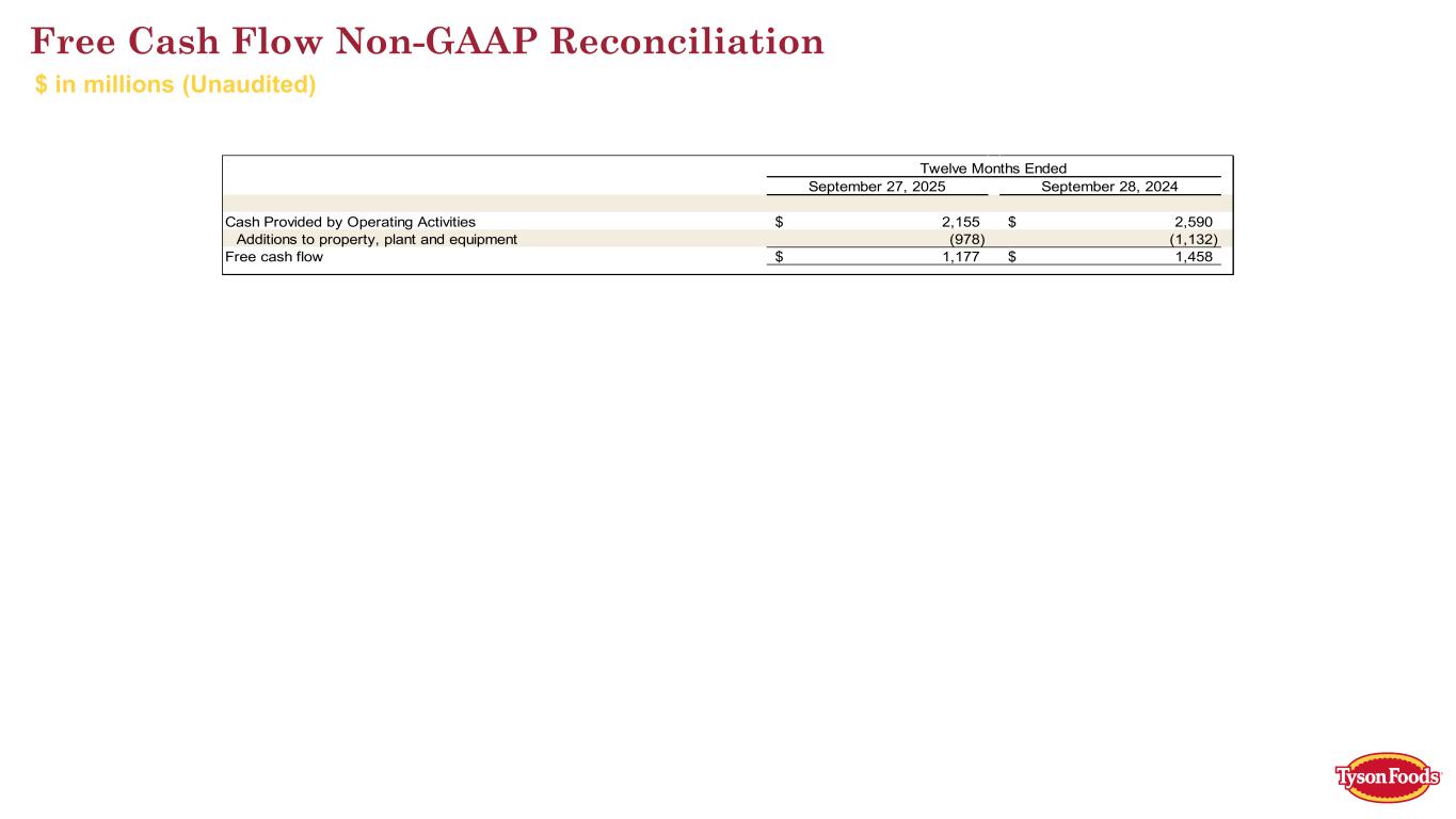 Certain information in this presentation constitutes forward-looking statements as contemplated by the Private Securities Litigation Reform Act of 1995. Such forward-looking statements include, but are not limited to, current views and estimates of our outlook for fiscal 2026, other future economic circumstances, industry conditions in domestic and international markets, our performance and financial results (e.g., debt levels, return on invested capital, value-added product growth, capital expenditures, tax rates, access to foreign markets and dividend policy). These forward-looking statements are subject to a number of factors and uncertainties that could cause our actual results and experiences to differ materially from anticipated results and expectations expressed in such forward-looking statements. We wish to caution readers not to place undue reliance on any forward-looking statements, which are expressly qualified in their entirety by this cautionary statement and speak only as of the date made. We undertake no obligation to update any forward-looking statements, whether as a result of new information, future events or otherwise. Among the factors that may cause actual results and experiences to differ from anticipated results and expectations expressed in such forward-looking statements are the following: (i) the effectiveness of financial excellence programs or operational optimization plans; (ii) access to, and inputs from, foreign markets, together with foreign economic conditions, including currency fluctuations, import/export restrictions and foreign politics; (iii) global pandemics have had, and may in the future have, an adverse impact on our business and operations; (iv) cyber attacks, other cyber incidents, security breaches or other disruptions of our information technology systems; (v) risks associated with our failure to consummate favorable acquisition transactions or integrate certain acquisitions' operations; (vi) the Tyson Limited Partnership’s ability to exercise significant control over the Company; (vii) fluctuations in the cost and availability of inputs and raw materials, such as live cattle, live swine, feed grains (including corn and soybean meal) and energy; (viii) market conditions for finished products, including competition from other global and domestic food processors, supply and pricing of competing products and alternative proteins and demand for alternative proteins; (ix) outbreak of a livestock disease (such as African swine fever (ASF), avian influenza (AI), New World screwworm or bovine spongiform encephalopathy (BSE)), which could have an adverse effect on livestock we own, the availability of livestock we purchase, consumer perception of certain protein products or our ability to conduct our operations; (x) changes in consumer preference and diets and our ability to identify and react to consumer trends; (xi) effectiveness of advertising and marketing programs; (xii) significant marketing plan changes by large customers or loss of one or more large customers; (xiii) our ability to leverage brand value propositions; (xiv) changes in availability and relative costs of labor and contract farmers and our ability to maintain good relationships with team members, labor unions, contract farmers and independent producers providing us livestock; (xv) issues related to food safety, including costs resulting from product recalls, regulatory compliance and any related claims or litigation; (xvi) compliance with and changes to regulations and laws (both domestic and foreign), including changes in accounting standards, tax laws, environmental laws, agricultural laws and occupational, health and safety laws; (xvii) the effect of climate change and any legal or regulatory response thereto; (xviii) adverse results from litigation; (xix) risks associated with leverage, including cost increases due to rising interest rates or changes in debt ratings or outlook; (xx) impairment in the carrying value of our goodwill or indefinite life intangible assets; (xxi) our participation in a multiemployer pension plan; (xxii) volatility in capital markets or interest rates; (xxiii) risks associated with our commodity purchasing activities; (xxiv) the effect of, or changes in, general economic conditions; (xxv) impacts on our operations caused by factors and forces beyond our control, such as natural disasters, fire, bioterrorism, pandemics, armed conflicts or extreme weather; (xxvi) failure to maximize or assert our intellectual property rights; (xxvii) effects related to changes in tax rates, valuation of deferred tax assets and liabilities, or tax laws and their interpretation; and (xxviii) the other risks and uncertainties detailed from time to time in our filings with the Securities and Exchange Commission, including those included under the captions “Risk Factors” and “Management's Discussion and Analysis of Financial Condition and Results of Operations” in our most recent Annual Report on Form 10-K and Quarterly reports on Form 10-Q. This presentation contains the financial measures “EBITDA,” “Adjusted EBITDA,” “Adjusted EPS”, “Adjusted Operating Income”, “Adjusted Operating Margin” and “Free Cash Flow” which are not calculated in accordance with U.S. GAAP. A reconciliation of non-GAAP financial measures to the most directly comparable GAAP financial measure has been provided in the Appendix. Non-GAAP financial measures should be considered in addition to, but not as a substitute for, the Company's reported GAAP results. Forward-Looking Statements Non-GAAP Financial Measures