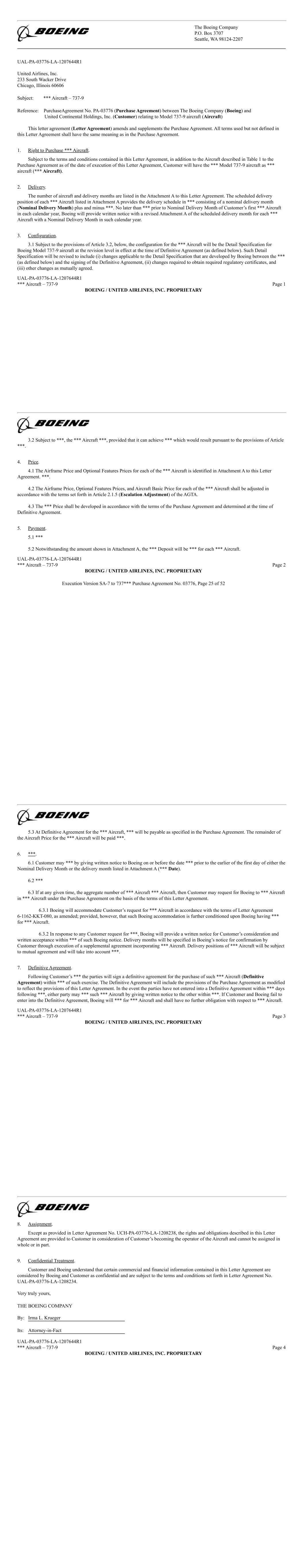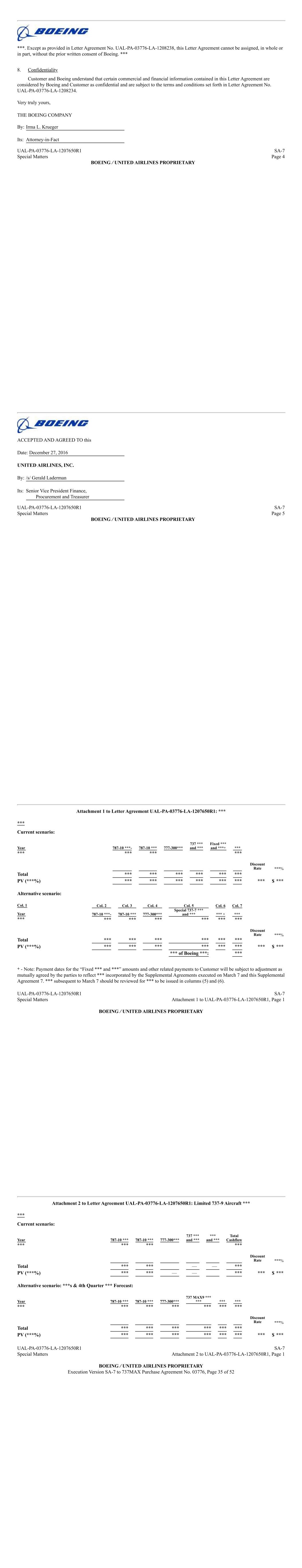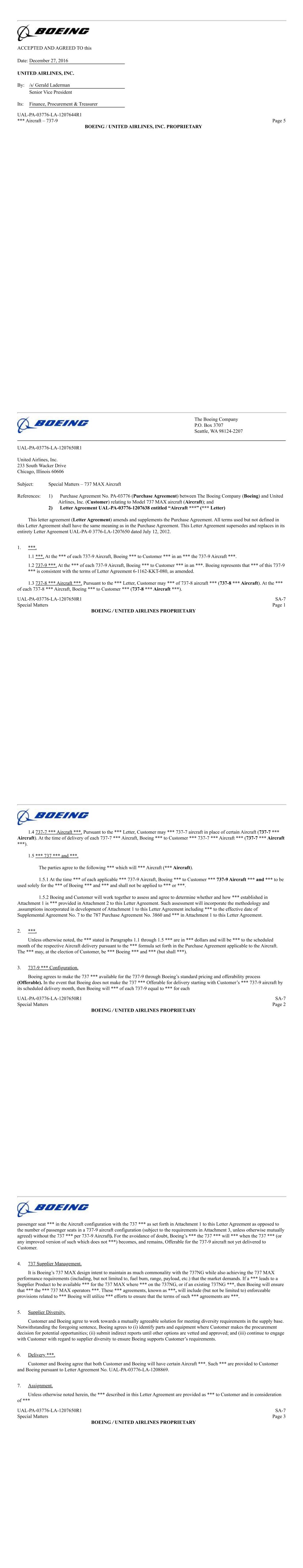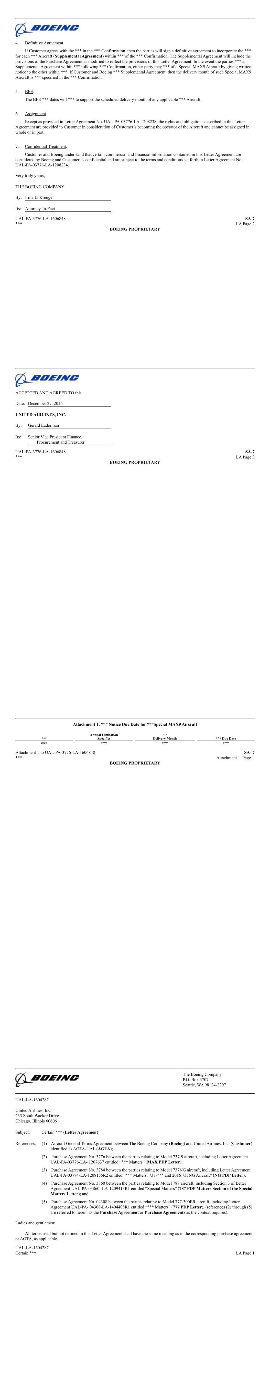 Exhibit 10.11 CERTAIN IDENTIFIED INFORMATION HAS BEEN EXCLUDED FROM THE EXHIBIT BECAUSE IT IS BOTH NOT MATERIAL AND IS THE TYPE THAT THE REGISTRANT TREATS AS PRIVATE OR CONFIDENTIAL. OMITTED INFORMATION HAS BEEN REPLACED WITH ASTERISKS. Supplemental Agreement No. 7 to Purchase Agreement No. 03776 between The Boeing Company and United Airlines, Inc. Relating to Boeing Model 737-9 Aircraft THIS SUPPLEMENTAL AGREEMENT, entered into as of December 27th, 2016, by and between THE BOEING COMPANY (Boeing) and UNITED AIRLINES, INC. (Customer); WHEREAS, the parties hereto entered into Purchase Agreement No. 3776 dated July 12, 2012, as amended and supplemented (Purchase Agreement), relating to the purchase and sale of Boeing model 737-9 aircraft (Aircraft). This Supplemental Agreement is an amendment to the Purchase Agreement; WHEREAS, Boeing and Customer agree to *** 737-9 Aircraft as follows: Manufacturer Original Delivery New Delivery Month Serial Number Month Prior to SA-7 Commencing With SA-7 *** *** *** *** UAL-PA-03776 SA-7 Page 1 BOEING / UNITED AIRLINES, INC. PROPRIETARY � � ! "! !#$% &'( % ! ) *! !#$% &'( %+ ! ) !)! "* ! ,! ' ! -. *! %+ ! ) "! ) /0123456 789: 84;3;5<=> ! ! " ?@4AB;2 C DE%% �% F GHIJKL M NKJOIP 8JQRJKI0S JKTU VQHVQJIO8QW 84;3;5<=OX12 5=08YCZ P264[2;X7\]=̂ 5=08YCZ 84;3;5<=OX12 5_\< 08YC̀ K2aP264[2;X7\]=̂C % bbb %+ bbbZ % bbb %+ bbb` % bbb %+ bbbc % bbb %+ bbbd % bbb %+ bbbe % bbb %+ bbbf % bbb %+ bbbg % bbb %+ bbb: % bbb %+ bbbCh % bbb %+ bbbCC % bbb %+ bbbCZ % bbb %+ bbbC̀ % bbb %+ bbbCc % bbb %+ bbbCd % bbb %+ bbbCe % bbb %+ bbbCf % bbb %+ bbbCg % bbb %+ bbbC: % bbb %+ bbbZh % bbb %+ bbbZC % bbb %+ bbbZZ % bbb %+ bbbZ̀ % bbb %+ bbbZc % bbb %+ bbbZd % bbb %+ bbbZe % bbb %+ bbbZf % bbb %+ bbbZg % bbb %+ bbbZ: % bbb %+ bbbh̀ % bbb %+ bbbC̀ % bbb %+ bbb 84;3;5<=OX12 5=08YCZ P264[2;X7\]=̂ 5=08YCZ 84;3;5<=OX12 5_\< 08YC̀ K2aP264[2;X7\]=̂Z̀ % bbb %+ bbb`̀ % bbb %+ bbbc̀ % bbb %+ bbbd̀ % bbb %+ bbbè % bbb %+ bbbf̀ % bbb %+ bbbg̀ % bbb %+ bbb:̀ % bbb %+ bbbch % bbb %+ bbbcC % bbb %+ bbbcZ % bbb %+ bbbc̀ % bbb %+ bbbcc % bbb %+ bbbcd % bbb %+ bbbce % bbb %+ bbbcf % bbb %+ bbbcg % bbb %+ bbbc: % bbb %+ bbbdh % bbb %+ bbbdC % bbb %+ bbbdZ % bbb %+ bbbd̀ % bbb %+ bbbdc % bbb %+ bbbdd % bbb %+ bbbde % bbb %+ bbbdf % bbb %+ bbbdg % bbb %+ bbbd: % bbb %+ bbbeh % bbb %+ bbbeC % bbb %+ bbb � ! !" ! # $ ! !" ! " #%& ' ( # ) * ( # )+ ! "" ! ! ! , " " %! " * ( # )+ -!"!#!" (, *�.+/ 0 ( ( ' !" *12134 567879:; <=>6?=7@A <=B876C;6DEA F768= 9EG HHH+ ! "" ! ! ! , " " %! "!! , !" * ( '+ -!"!#!" (, *�.+/ � I!(!� I!(! J' !" *J, !" K! L ! (+ ! "" ! ! ! , " " %! " !! , !" � I!(! J' -!"!#!" (, *�.+/ ! �! MNO ! # P Q P' Q RQ...Q.'0PP !" *SSS ! #+ ! "" ! ! ! , " " %! Q RQ...Q.'0PP' ! ! $!! "! K !, # SSS ! # " P0 Q RQ...Q.'0T !" *�! M + ! "" ! ! ! , " " %!Q RQ...Q.'0T' ! �! MNO ! #P Q RQ...Q.'0UTT !" *SSS+ ! "" ! ! ! , " " %! Q RQ...Q.'0UTT' ! �! MNO ! #PP Q RQ...Q.'UPU !" *SSS �! MNO ! #+ ! """ $!" ! "!$ , SSSPT Q RQ.Q.'P0U !" *) ! SSS+ ! (, ! " (, T M! T' V# J! ) " ! I!(! � I!(! Q " ( # "" ! �! MNO ! # J! " ) %! % W # , ( ! RQ.. �. XYZ[\] ̂ _\[̀Za b[cd[\Zef [\gh icYic[Z̀bcj � ! � " #$ %&'()* +,- .*./01 2 �3" 4 526 6 7 89 :;-<=>?@'A-@@B@CD/,E *.FG :;-<=>?@'A-@@B@CD/,E *..H :;-<=>?@'A-@@B@CD/,E *FHI :;-<=>?@'A-@@B@CD/,E G*IF JKJ'L �3 9%"1 3M N OPPP:>QB@CD'RRST<>DT,C U>D@ :>QB@CDU;@ U>D@ V 2 � " 4 N N N N OPPPV 2 � " 4 N N N OPPPV 2 � " 4 N N N N OPPPV 2 � " 4 N N N N OPPP J,D>S O O O O OPPP W 8 7 5 2 8 XYZ [Z\] ̂_ ]Ỳ\ abcZ ̀\ dZ_] ̀e]Ze]̀̂ebdf gdbehi jk33 �3 $ lKmn/0 o p/nJmU 'nqLn/m&r n/sE :qK:qnmJ'qt