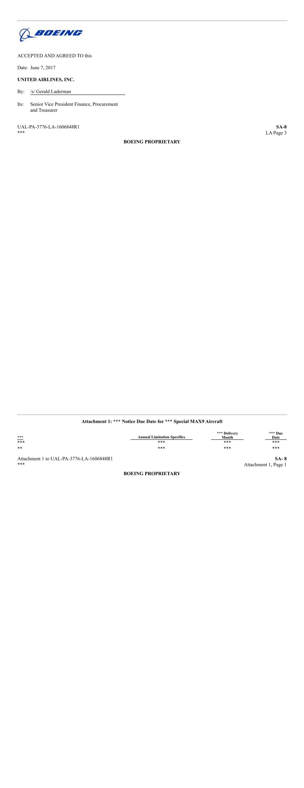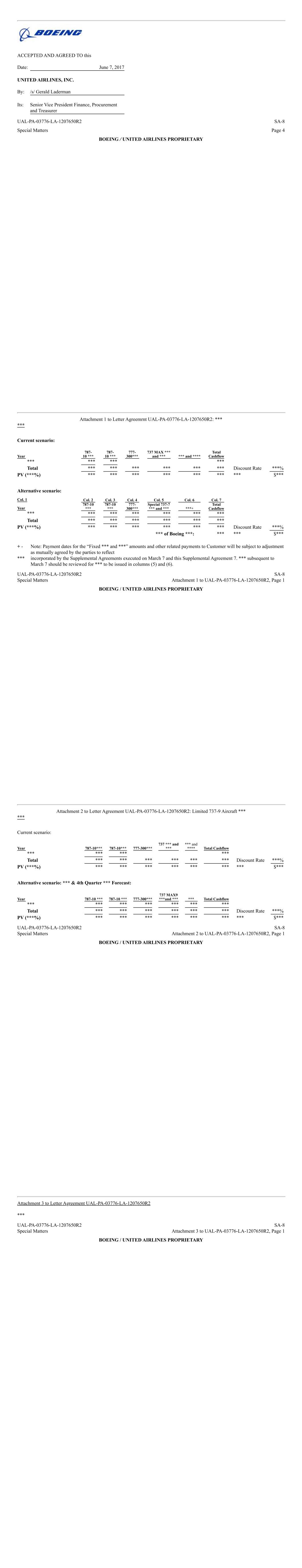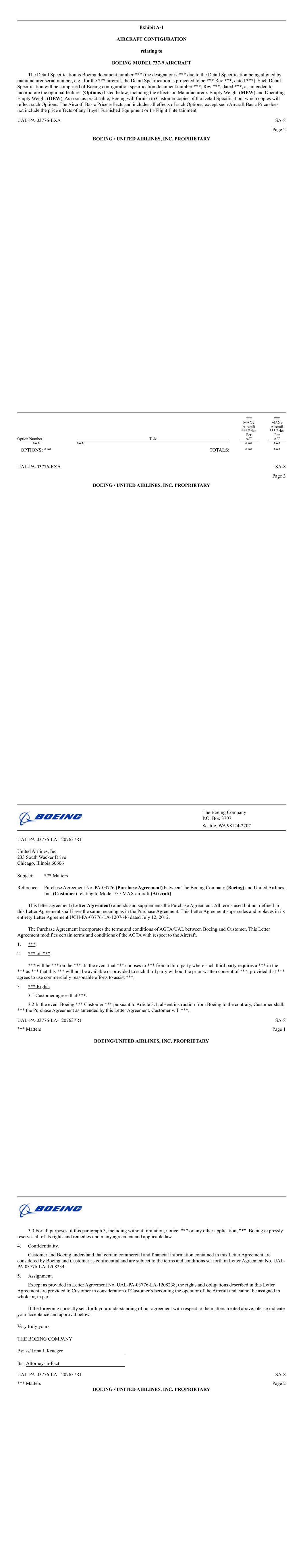 Exhibit 10.12 CERTAIN IDENTIFIED INFORMATION HAS BEEN EXCLUDED FROM THE EXHIBIT BECAUSE IT IS BOTH NOT MATERIAL AND IS THE TYPE THAT THE REGISTRANT TREATS AS PRIVATE OR CONFIDENTIAL. OMITTED INFORMATION HAS BEEN REPLACED WITH ASTERISKS. Supplemental Agreement No. 8 to Purchase Agreement No. 03776 between The Boeing Company and United Airlines, Inc. Relating to Boeing Model 737-9 Aircraft THIS SUPPLEMENTAL AGREEMENT, entered into as of June 7 , 2017, by and between THE BOEING COMPANY (Boeing) and UNITED AIRLINES, INC. (Customer); WHEREAS, the parties hereto entered into Purchase Agreement No. 3776 dated July 12, 2012, as amended and supplemented (Purchase Agreement), relating to the purchase and sale of Boeing model 737-9 aircraft (Aircraft). This Supplemental Agreement is an amendment to the Purchase Agreement; WHEREAS, Boeing and Customer agree to *** 737-9 Aircraft as follows Manufacturer Serial Number *** *** *** *** *** *** WHEREAS, Customer and Boeing have previously executed documents reflecting Customer Configuration Changes (as that term is defined in Letter Agreement UAL-PA-03776-LA-1207643 entitled "Open Matters" (Open Matters Letter)) effected through Customer's acceptance of Customer Specific Option Selection Packages A through E for specified Boeing Model 737-9 aircraft (Customer Configured Aircraft). WHEREAS, Customer and Boeing now desire to conform and further amend the Purchase Agreement to reflect the following: (i) all Customer Configuration Changes; (ii) revise Table 1 to reflect such Customer Configuration Changes; and (iii) replace existing Exhibit A-1 with a revised Exhibit A-1 reflecting the Customer Configuration Changes; WHEREAS, Customer and Boeing agree to incorporate certain *** into the Purchase Agreement; UAL-PA-03776 SA-8 Page 1 BOEING / UNITED AIRLINES, INC. PROPRIETARY � � !" " " #"" $ %$&&&$&'(" )*** �" +,- " ./ 0111 23435 675338394: " " *** 0 " ." " *** $ : ***; <=; " " " . # " " " .>? ' < @ . < )< @ . / " " " " A >" )< @ . / 0" "." @A )�&/: B < @< @ ' " )CDCEF GHIJIKLM NOPHQOIRS NOTJIHUMHVWS XIHJO KWY ZZZ/ " " " " A >" "" A " )< @ '/ 0" "." @A )�&/: ["@"["@" &' " " " " A >" #" ["@" &' 0" "." @A )�&: " ." " . ." " . ( $ (' $ %$&&&$&'B " )*** + / " " " " A >" $ %$&&&$&'B' 0" "." @A )�&/:(B $ %$&&&$&'B'\ " )***/ " " " " A >" $ %$&&&$&'B'\' 0" "." @A )�&/: ***( $ %$&&&$&'B\' " )�" + / " " " " A >"$ %$&&&$&'B'\' 0" "." @A )�&/: *** �" +, ***(( < *** $ " " " " A >" $ %$&&&$&'('0" "." @A )�&/: #" " " " " *** \ +" !" " @ . =" ' " *** *** " � � *** >" @ *** !" [" . " � ]̂_̀ab c *** *** %$&& �& Bdefghi j khglfm 6gn2ghfop ghqr snesngfl6nt � ! ! ! ! ! "#$ %$&' () '#*& +,-$ *& .$)' */'$/'*(/,.0 1.,/23 4566 �6 789:;< = >;:?9@ A:BC:;9DE :;FG HB8HB:9?ABI � ! " # $ # $ "% & % '( )*+ ,-+./0 1-234/5 6/.)+7 4.89./+:; ./1<== ! > == ? # ! # �% �% ! > ? # ! # %# %# $@%@A �% B% %# A% C # % % !@@ �@ D,-+./0 E 6/.)+7 4.89./+:; ./1< 38-38.+)485