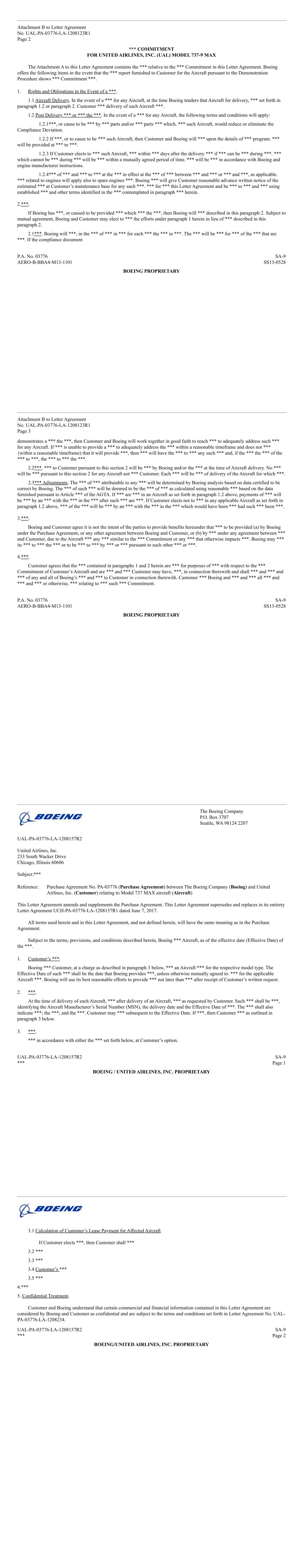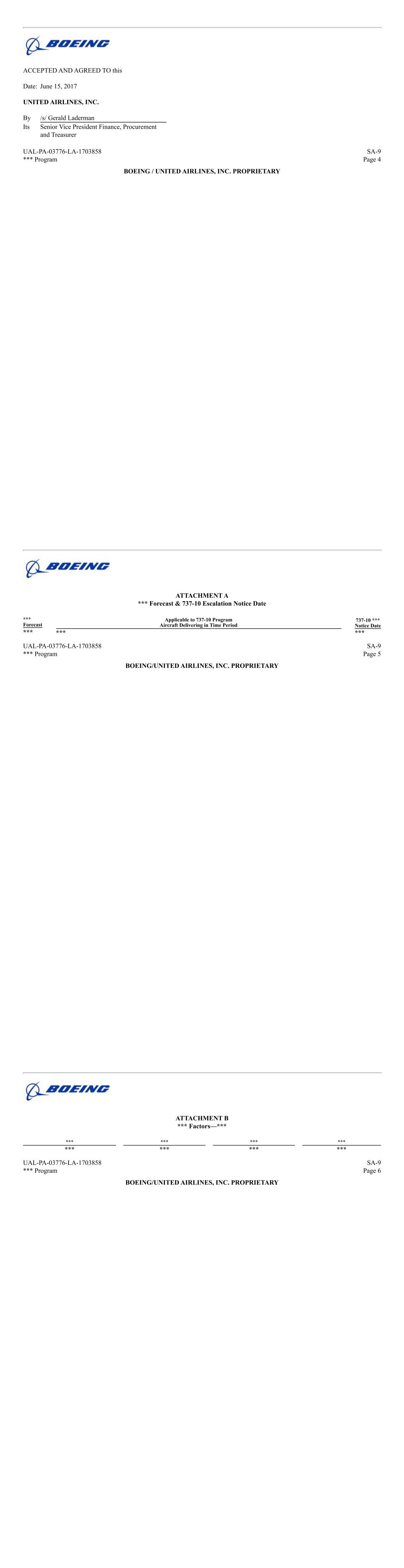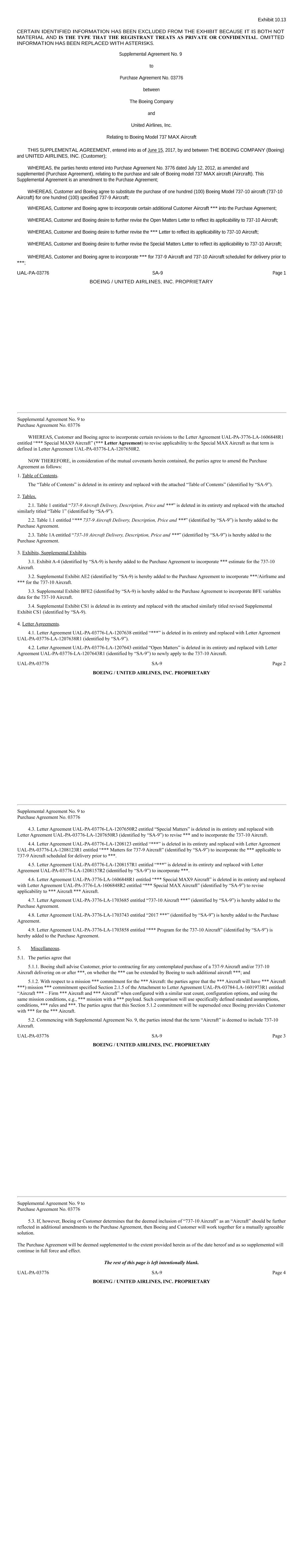 Exhibit 10.13 CERTAIN IDENTIFIED INFORMATION HAS BEEN EXCLUDED FROM THE EXHIBIT BECAUSE IT IS BOTH NOT MATERIAL AND IS THE TYPE THAT THE REGISTRANT TREATS AS PRIVATE OR CONFIDENTIAL. OMITTED INFORMATION HAS BEEN REPLACED WITH ASTERISKS. Supplemental Agreement No. 9 to Purchase Agreement No. 03776 between The Boeing Company and United Airlines, Inc. Relating to Boeing Model 737 MAX Aircraft THIS SUPPLEMENTAL AGREEMENT, entered into as of June 15, 2017, by and between THE BOEING COMPANY (Boeing) and UNITED AIRLINES, INC. (Customer); WHEREAS, the parties hereto entered into Purchase Agreement No. 3776 dated July 12, 2012, as amended and supplemented (Purchase Agreement), relating to the purchase and sale of Boeing model 737 MAX aircraft (Aircraft). This Supplemental Agreement is an amendment to the Purchase Agreement; WHEREAS, Customer and Boeing agree to substitute the purchase of one hundred (100) Boeing Model 737-10 aircraft (737-10 Aircraft) for one hundred (100) specified 737-9 Aircraft; WHEREAS, Customer and Boeing agree to incorporate certain additional Customer Aircraft *** into the Purchase Agreement; WHEREAS, Customer and Boeing desire to further revise the Open Matters Letter to reflect its applicability to 737-10 Aircraft; WHEREAS, Customer and Boeing desire to further revise the *** Letter to reflect its applicability to 737-10 Aircraft; WHEREAS, Customer and Boeing desire to further revise the Special Matters Letter to reflect its applicability to 737-10 Aircraft; WHEREAS, Customer and Boeing agree to incorporate *** for 737-9 Aircraft and 737-10 Aircraft scheduled for delivery prior to ***; UAL-PA-03776 SA-9 Page 1 BOEING / UNITED AIRLINES, INC. PROPRIETARY � � !" " " #"" $ %$&&&$&'()('" *+++ �" ,- " ./ 0111 23435 675338394: #" " ;""< �" ,- " . " ." " $ %$&&&$&'=>=? @A? " " " . # " " " .BC' @ ; . @ *@ ; . / " " " " < B" *@ ; . / 0" "." ;< *�&/:= @ ;=' @ ; ' " *DEDFG HIJKJLMN OPQIRPJST OPUKJIVNIWXT YJIKP LXZ [[[/ " " " " < B" "" < " *@ ; '/ 0" "." ;< *�&/:== @ ; '' " *[[[ DEDFG HIJKJLMN OPQIRPJST OPUKJIVNIWXT YJIKP LXZ [[[/ 0" "." ;< *�&/: " ;< = @ ; ' " *DEDF\] HIJKJLMN OPQIRPJST OPUKJIVNIWXT YJIKP LXZ [[[/ 0" "." ;< *�&/: " ;< ̂";" � ̂";"' ̂";" &) 0" "." ;< *�&: " ;< " +++ " . &'" .= � ̂";" = 0" "." ;< *�&: " ;< " +++_" . +++ . &' " . � ̂";" !A= 0" "." ;< *�&: " ;< " !A # " ; . &' " .) � ̂";" �' " " " " < B" "" < " #" � ̂";" �' 0" "." ;< *�&:) $ )' $ %$&&&$&'=( " *+++/ " " " " < B" $ %$&&&$&'=(' 0" "." ;< *�&/:)= $ %$&&&$&'=) " *? , / " " " " < B" $ %$&&&$&'=)' 0" "." ;< *�&/: B< < &' " . %$&& �& =àbcde f gdchbi 6cj2cdbkl cdmn ojaojcbh6jp � ! "# $�" % & " ## " " " ' # # (" ! )"#"*"# +' $�&, -" ... # " " * / "# $...& " ## " " " ' # # (" /! "# $... % * " *& )"#"*"# +' $�&, " ... " + " * ## * #"- ' " ... / ! "# $...& " ## " " " ' # # (" / ! )"#"*"# +' $�&, " ... //! "# $... �" %0 " *& " ## " " " ' # #(" //! "# $... �" %0 " *& )"#"*"# +' $�&, -" " +""' ... " * ... " * / "# $ " * ...& )"#"*"# +' $�&, " +' ### / "# $ ...& )"#"*"# +' $�&, " +' ### / / "# $... * " *& )"#"*"# +' $�&, " +' ### %" 1 " 2" #-" 3 4 " " * ' # * " * #5 " * #"- " * ...4 ( ... + 6## +' 2" ##"" " * ...7 # 8" "" ... " * ... " *9 " ... " * (" - ... " *..., "" ... " "*"# �" * /! "#$" * ... : ;" ... " * # ... " *& ( *" # (" "" 4 *" " "4 # " "" #""4 4 ... "" (" ... ' # � " (" "*" ' #*"# # # "4#""4 ... # ... 1 " " �" " (" + ## 2" -"# 3 (" ... * ... " * 3" (" � 4 " "# $" *& " ## "# " * � <=>?@A B C@?D>E F?GH?@>IJ ?@KL MG=MG?>DFGN � ! " # ! ## !! $%& ! ' $! ' # ( # ! ##!! # ! # " ! ) * (!+ ! ( ## # , !## ! # # # !! ! # -./ 0/12 34 2.51 678/ 51 9/42 5:2/:253:79; <97:=> ?@%% �% ABCDEFG H IFEJDK LEMNEFDOP EFQR SMCSMEDJLMT
