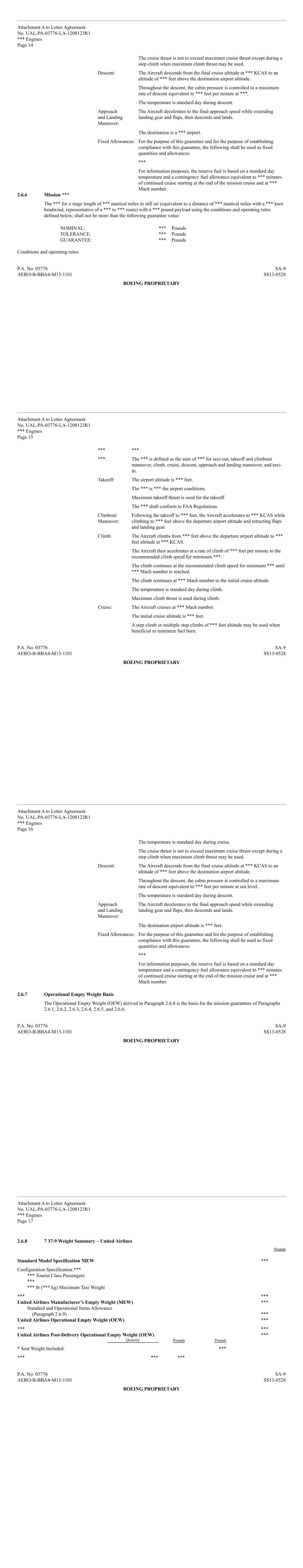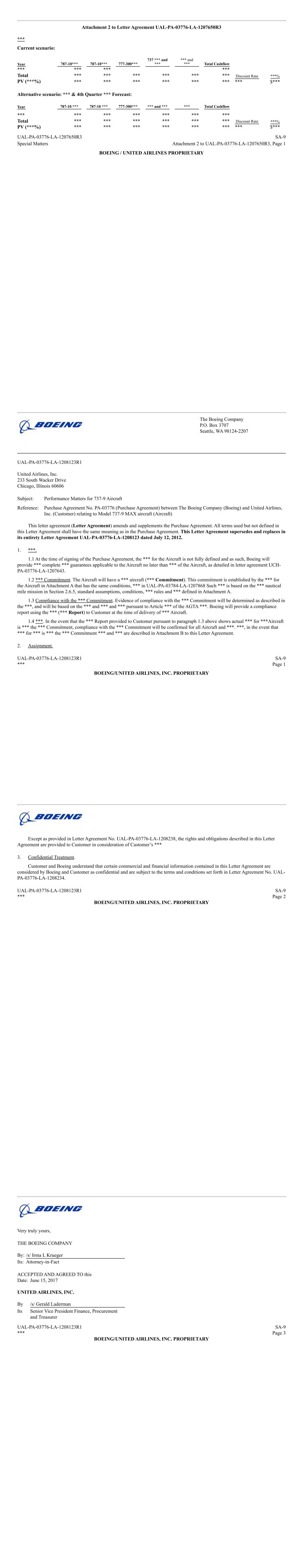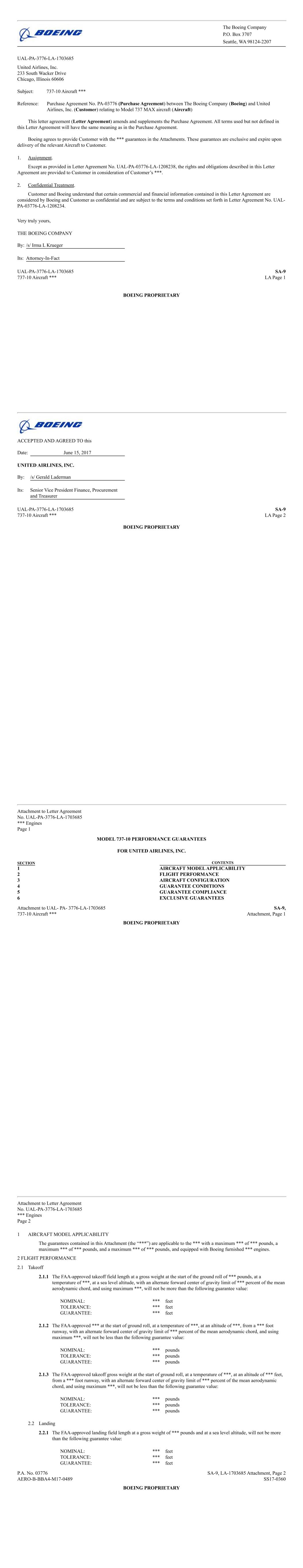 Exhibit 10.13 CERTAIN IDENTIFIED INFORMATION HAS BEEN EXCLUDED FROM THE EXHIBIT BECAUSE IT IS BOTH NOT MATERIAL AND IS THE TYPE THAT THE REGISTRANT TREATS AS PRIVATE OR CONFIDENTIAL. OMITTED INFORMATION HAS BEEN REPLACED WITH ASTERISKS. Supplemental Agreement No. 9 to Purchase Agreement No. 03776 between The Boeing Company and United Airlines, Inc. Relating to Boeing Model 737 MAX Aircraft THIS SUPPLEMENTAL AGREEMENT, entered into as of June 15, 2017, by and between THE BOEING COMPANY (Boeing) and UNITED AIRLINES, INC. (Customer); WHEREAS, the parties hereto entered into Purchase Agreement No. 3776 dated July 12, 2012, as amended and supplemented (Purchase Agreement), relating to the purchase and sale of Boeing model 737 MAX aircraft (Aircraft). This Supplemental Agreement is an amendment to the Purchase Agreement; WHEREAS, Customer and Boeing agree to substitute the purchase of one hundred (100) Boeing Model 737-10 aircraft (737-10 Aircraft) for one hundred (100) specified 737-9 Aircraft; WHEREAS, Customer and Boeing agree to incorporate certain additional Customer Aircraft *** into the Purchase Agreement; WHEREAS, Customer and Boeing desire to further revise the Open Matters Letter to reflect its applicability to 737-10 Aircraft; WHEREAS, Customer and Boeing desire to further revise the *** Letter to reflect its applicability to 737-10 Aircraft; WHEREAS, Customer and Boeing desire to further revise the Special Matters Letter to reflect its applicability to 737-10 Aircraft; WHEREAS, Customer and Boeing agree to incorporate *** for 737-9 Aircraft and 737-10 Aircraft scheduled for delivery prior to ***; UAL-PA-03776 SA-9 Page 1 BOEING / UNITED AIRLINES, INC. PROPRIETARY � � !" " " #"" $ %$&&&$&'()('" *+++ �" ,- " ./ 0111 23435 675338394: #" " ;""< �" ,- " . " ." " $ %$&&&$&'=>=? @A? " " " . # " " " .BC' @ ; . @ *@ ; . / " " " " < B" *@ ; . / 0" "." ;< *�&/:= @ ;=' @ ; ' " *DEDFG HIJKJLMN OPQIRPJST OPUKJIVNIWXT YJIKP LXZ [[[/ " " " " < B" "" < " *@ ; '/ 0" "." ;< *�&/:== @ ; '' " *[[[ DEDFG HIJKJLMN OPQIRPJST OPUKJIVNIWXT YJIKP LXZ [[[/ 0" "." ;< *�&/: " ;< = @ ; ' " *DEDF\] HIJKJLMN OPQIRPJST OPUKJIVNIWXT YJIKP LXZ [[[/ 0" "." ;< *�&/: " ;< ̂";" � ̂";"' ̂";" &) 0" "." ;< *�&: " ;< " +++ " . &'" .= � ̂";" = 0" "." ;< *�&: " ;< " +++_" . +++ . &' " . � ̂";" !A= 0" "." ;< *�&: " ;< " !A # " ; . &' " .) � ̂";" �' " " " " < B" "" < " #" � ̂";" �' 0" "." ;< *�&:) $ )' $ %$&&&$&'=( " *+++/ " " " " < B" $ %$&&&$&'=(' 0" "." ;< *�&/:)= $ %$&&&$&'=) " *? , / " " " " < B" $ %$&&&$&'=)' 0" "." ;< *�&/: B< < &' " . %$&& �& =àbcde f gdchbi 6cj2cdbkl cdmn ojaojcbh6jp � ! "# $�" % & " ## " " " ' # # (" ! )"#"*"# +' $�&, -" ... # " " * / "# $...& " ## " " " ' # # (" /! "# $... % * " *& )"#"*"# +' $�&, " ... " + " * ## * #"- ' " ... / ! "# $...& " ## " " " ' # # (" / ! )"#"*"# +' $�&, " ... //! "# $... �" %0 " *& " ## " " " ' # #(" //! "# $... �" %0 " *& )"#"*"# +' $�&, -" " +""' ... " * ... " * / "# $ " * ...& )"#"*"# +' $�&, " +' ### / "# $ ...& )"#"*"# +' $�&, " +' ### / / "# $... * " *& )"#"*"# +' $�&, " +' ### %" 1 " 2" #-" 3 4 " " * ' # * " * #5 " * #"- " * ...4 ( ... + 6## +' 2" ##"" " * ...7 # 8" "" ... " * ... " *9 " ... " * (" - ... " *..., "" ... " "*"# �" * /! "#$" * ... : ;" ... " * # ... " *& ( *" # (" "" 4 *" " "4 # " "" #""4 4 ... "" (" ... ' # � " (" "*" ' #*"# # # "4#""4 ... # ... 1 " " �" " (" + ## 2" -"# 3 (" ... * ... " * 3" (" � 4 " "# $" *& " ## "# " * � <=>?@A B C@?D>E F?GH?@>IJ ?@KL MG=MG?>DFGN � ! " # ! ## !! $%& ! ' $! ' # ( # ! ##!! # ! # " ! ) * (!+ ! ( ## # , !## ! # # # !! ! # -./ 0/12 34 2.51 678/ 51 9/42 5:2/:253:79; <97:=> ?@%% �% ABCDEFG H IFEJDK LEMNEFDOP EFQR SMCSMEDJLMT