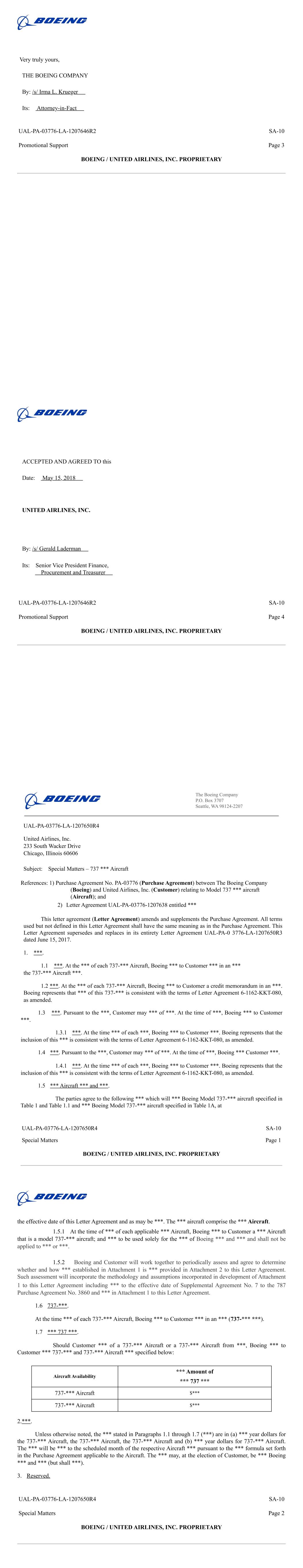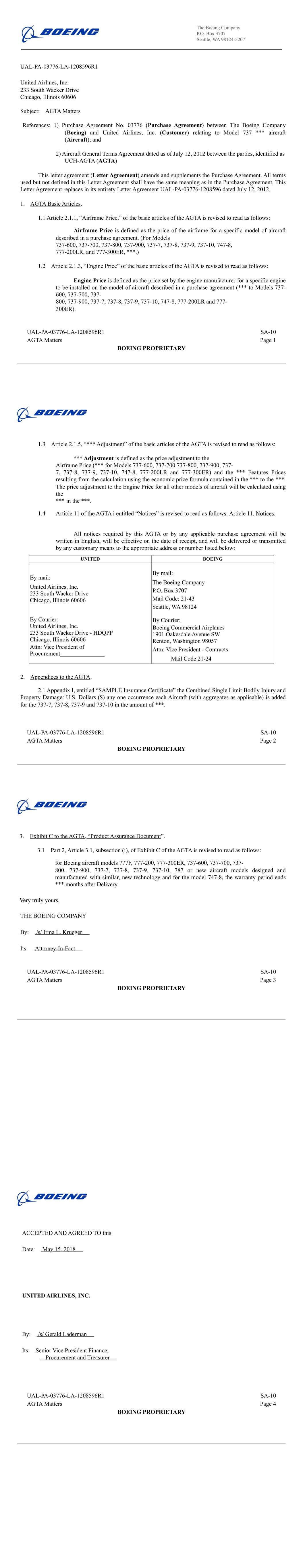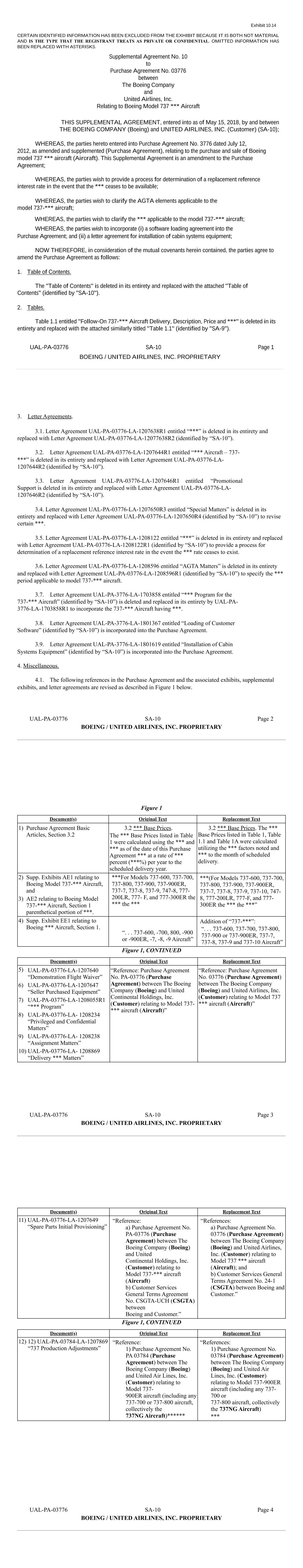 Exhibit 10.14 CERTAIN IDENTIFIED INFORMATION HAS BEEN EXCLUDED FROM THE EXHIBIT BECAUSE IT IS BOTH NOT MATERIAL AND IS THE TYPE THAT THE REGISTRANT TREATS AS PRIVATE OR CONFIDENTIAL. OMITTED INFORMATION HAS BEEN REPLACED WITH ASTERISKS. Supplemental Agreement No. 10 to Purchase Agreement No. 03776 between The Boeing Company and United Airlines, Inc. Relating to Boeing Model 737 *** Aircraft THIS SUPPLEMENTAL AGREEMENT, entered into as of May 15, 2018, by and between THE BOEING COMPANY (Boeing) and UNITED AIRLINES, INC. (Customer) (SA-10); WHEREAS, the parties hereto entered into Purchase Agreement No. 3776 dated July 12, 2012, as amended and supplemented (Purchase Agreement), relating to the purchase and sale of Boeing model 737 *** aircraft (Aircraft). This Supplemental Agreement is an amendment to the Purchase Agreement; WHEREAS, the parties wish to provide a process for determination of a replacement reference interest rate in the event that the *** ceases to be available; WHEREAS, the parties wish to clarify the AGTA elements applicable to the model 737-*** aircraft; WHEREAS, the parties wish to clarify the *** applicable to the model 737-*** aircraft; WHEREAS, the parties wish to incorporate (i) a software loading agreement into the Purchase Agreement; and (ii) a letter agreement for installation of cabin systems equipment; NOW THEREFORE, in consideration of the mutual covenants herein contained, the parties agree to amend the Purchase Agreement as follows: 1. Table of Contents. The "Table of Contents" is deleted in its entirety and replaced with the attached "Table of Contents" (identified by "SA-10"). 2. Tables. Table 1.1 entitled "Follow-On 737-*** Aircraft Delivery, Description, Price and ***" is deleted in its entirety and replaced with the attached similarly titled "Table 1.1" (identified by "SA-9"). UAL-PA-03776 SA-10 Page 1 BOEING / UNITED AIRLINES, INC. PROPRIETARY � � � � !" � �#$%& '� � (( $)� !" � ((#$%& '�� � ( * **&+* !" � (#$%& '�( � ,�& - !" � ,(#$%& '*. �, � !" � #$%& '**.* $* **$ $ "." */� � ,012- !" � ,0 #$%& '* $"* %* *� $� � �,* $*"� $#$%& ' %� �, * **"� $". � � �* *$3+* &*$!#$%& ' ***"+ " �0 � 04**$3%& 56+ #$%& ' ***"+ " (- *+( 2"$**! $ "+ " "* /"%7+ /"%7 . %8 + %*!� & 9:;<=>?@=<A;BC<DE<=;FG<=HIJD:JD<;ACDK � !"#$%&'()"''*'+,-%&.#(",.#/'&01'#,.2+345 345666-%&' ".#'&47$'666-%&' ".#'&/.&,'8.+7%9/':'"'#%/#!/%,'8!&.+),$'666%+8666%&2;,$'8%,'2;,$.& !"#$%&'()"''*'+,666%,%"%,'2;666<'"#'+,=666><'"?'%",2,$'&#$'8!/'88'/.@'"??'%"4 345666-%&' ".#'&47$'666-%&' ".#'&/.&,'8.+7%9/'07%9/'4%+87%9/'(:'"'#%/#!/%,'8!,./.A.+),$'666;%#,2"&+2,'8%+8666,2,$'*2+,$2;&#$'8!/'88'/.@'"?451!<<4BC$.9.,&(B"'/%,.+),2-2'.+)D28'/E3EF666(."#"%;,0%+8 666G2"D28'/&E3EFHII0E3EFEII0E3EFJII0E3EFKII0E3EFKIIBL0E3EFE0E3EFJ0E3EFK0EMEFJ0EEEF5IINL0EEEFG0%+8EEEF3IIBL,$'666,$'666 666=G2"D28'/&E3EFHII0E3EFEII0E3EFJII0E3EFKII0E3EFKIIBL0E3EFE0E3EFJ0E3EFK0E3EFI0EMEFJ0EEEF5IINL0EEEFG0%+8EEEF3IIBL,$'666,$'666O3(B5"'/%,.+),2-2'.+)D28'/E3EF666(."#"%;,01'#,.2+<%"'+,$',.#%/<2",.2+2;6664M1!<<4BC$.9.,BB"'/%,.+),2-2'.+)666(."#"%;,01'#,.2+4 P444E3EFHII0FEII0JII0FKII2"FKIIBL0FE0FJ0FK(."#"%;,O (88.,.2+2;PE3EF666OQP444E3EFHII0E3EFEII0E3EFJII0E3EFKII2"E3EFKIIBL0E3EFE0E3EFJ0E3EFK%+8E3EFI(."#"%;,O�RSTUVWUXYZ [\(NF (FI3EEHFN(F5IEHMIP]'*2+&,"%,.2+G/.)$,̂%.@'"O PL';'"'+#'Q !"#$%&'()"''*'+,_24 (FI3EEH=̀ab 9',:''+7$'-2'.+)c2*<%+?=d %+8\+.,'8c2+,.+'+,%/e2/8.+)&0f+#4=g "'/%,.+),2D28'/E3EF666%."#"%;,=bhO PL';'"'+#'Q !"#$%&'()"''*'+,_24I3EEH=̀ab 9',:''+7$'-2'.+)c2*<%+?=d %+8\+.,'8(."/.+'&0f+#4=g "'/%,.+),2D28'/E3E666%."#"%;,=bhOH\(NF (FI3EEHFN(F5IEHMEP1'/'" !"#$%&'8Bi!.<*'+,OE\(NF (FI3EEHFN(F5IJI[[LP666 "2)"%*OJ\(NF (FI3EEHFN(F5IJ53MP ".@./')'8%+8c2+;.8'+,.%/D%,'"&OK\(NF (FI3EEHFN(F5IJ53JP(&&.)+*'+,D%,'"&OI\(NF (FI3EEHFN(F5IJJHKP]'/.@'"?666D%,'"&O\(NF (FI3EEH 1(FI %)'3djklmnolkj bkpkljqrklgs̀̀ kjbt � !" !#$%&'()*()+,-./+/(0)12/,/1./.34 %5*6*)*.7*8(9)7:(,*3)**;*.+<1= !>? @ A B*+C**.D:*E1*/.3F1;'(.G>H(.I./+*IF1.+/.*.+(0J10I/.3,K-.7=>L )*0(+/.3+1M1I*0 NNN(/)7)(6+>A OBF9,+1;*)&*)2/7*,P*.*)(0D*);,3)**;*.+<1=F&PDFJ>LQRAB*+C**.E1*/.3(.IF9,+1;*)=4 %5*6*)*.7*,8(9)7:(,*3)**;*.+<1= !>? @ A B*+C**.D:*E1*/.3F1;'(.G>H(.I./+*I/)0/.*,K-.7=>L )*0(+/.3+1M1I*0 NNN(/)7)(6+>A OS(.IBF9,+1;*)&*)2/7*,P*.*)(0D*);,3)**;*.+<1="#>LQRAB*+C**.E1*/.3(.IF9,+1;*)=4TUVWXYZ[\]̂ _̀ âbc� "" d#" d!$% )1I97+/1.Ie9,+;*.+,4 %5*6*)*.7*89)7:(,*3)**;*.+<1= d#>? @ A B*+C**.D:*E1*/.3F1;'(.G>H(.I./+*I/)/.*,K-.7=>L )*0(+/.3+1M1I*0 $f5(/)7)(6+>/.709I/.3(.G 1) d(/)7)(6+K710*7+/2*0G+:*ghgiRA ONNNNNN %5*6*)*.7*,89)7:(,*3)**;*.+<1= d#>? @ A B*+C**.D:*E1*/.3F1;'(.G>H(.I./+*I/)/.*,K-.7=>L )*0(+/.3+1M1I*0 $f5(/)7)(6+>/.709I/.3(.G 1) d(/)7)(6+K710*7+/2*0G+:*ghgiRA ONNN ! & (3*#HjkiRlmikj�AknkijQokiLp??kjAq