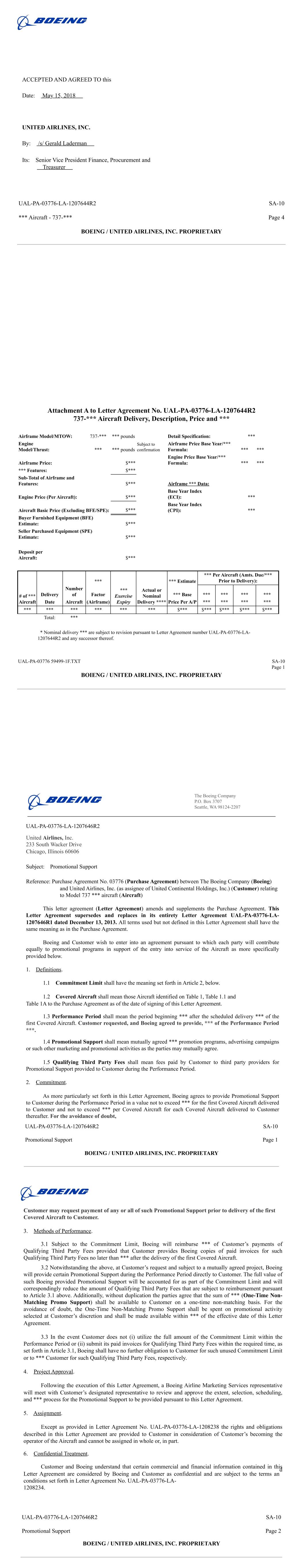� !" # $% $! %$$ $&'! (% % !$ !) $ *$'+ #%% &!% ,!!- . / ' % ! " % ! $ # & !" /' ! 0# &% 0# & / /" 1. / %/ 2 ! / 324235(25615325786991:2 4 $ % 32 / !;) 324235(25615325786989$ 32% $ $ ! 4235(256153257861-6<� 2576 (=>?@ABCDA@E?FG@HI@A?J+@AKLMH>MH@?EGHN � !!"#$�$ %& '()*+*,-+./011,2 ,0 3 !!"#$!"45% 6#67 . %89:;<=>?<;@:AB;CD;<:EF;<GHIC9IC;:@BCJ ��� !"#$%&'()) *+,-,*./01/2*34*,/5//4*246*.//,*6**7�-8�89::;8-�8:; < 1�81=4+* >?@AB !"#$%&'C"@C"!"D Attachment 1 to Letter Agreement UAL-PA-03776-LA-1207650R4: *** *** Current scenario: Year 787-*** 787-*** 777-300*** 737 *** and *** ***+ Total Cashflow *** *** *** *** *** *** *** *** *** *** *** *** *** *** *** *** *** *** *** *** *** *** *** *** *** *** *** *** *** *** *** *** Total *** *** *** *** *** *** PV (***%) *** *** *** *** *** *** Alternative scenario: Col. 1 Col. 2 Col. 3 Col. 4 Col. 5 Col. 6 Col. 7 Year 787-*** 787-*** 777-300*** *** 737-*** and *** *** Total Cashflow *** *** *** *** *** *** *** *** *** *** *** *** *** *** *** *** *** *** *** *** *** *** *** *** *** *** *** *** *** *** *** *** *** *** *** *** *** *** *** *** *** *** *** *** *** *** *** *** *** *** *** *** *** *** *** *** *** *** *** *** *** *** *** *** *** *** *** *** *** *** *** *** Total *** *** *** *** *** *** *** *** PV *** *** *** *** *** *** *** *** (***%) *** of Boeing ***: *** + - Note: Payment dates for the "Fixed *** and ***" amounts and other related payments to Customer will be subject to adjustment as mutually agreed by the parties to reflect *** incorporated by the Supplemental Agreements executed on March 7 and this Supplemental Agreement 7. *** subsequent to March 7 should be reviewed for *** to be issued in columns (5) and (6). UAL-PA-03776-LA-1207650R4 Special Matters BOEING / UNITED AIRLINES, INC. PROPRIETARY Discount Rate ***% *** $*** Discount Rate ***% *** $*** SA-10 Attachment 2 to UAL-PA-03776-LA- 1207650R4, Page 6