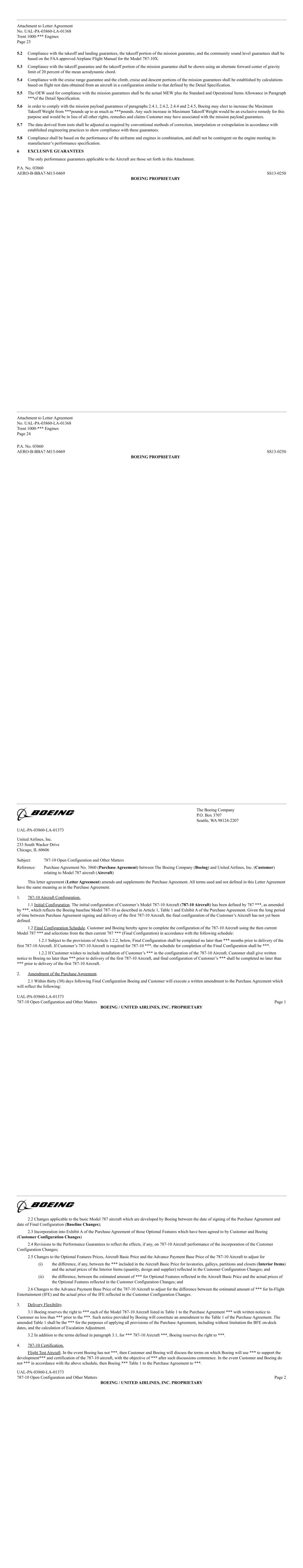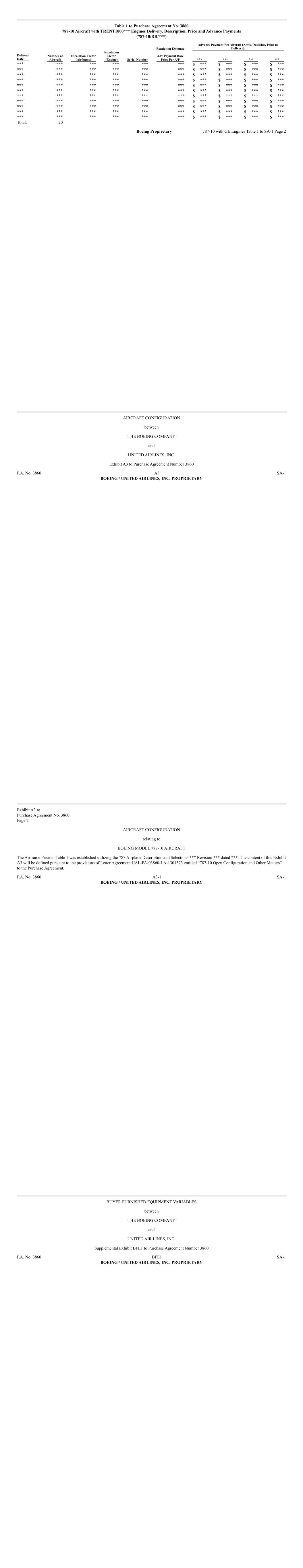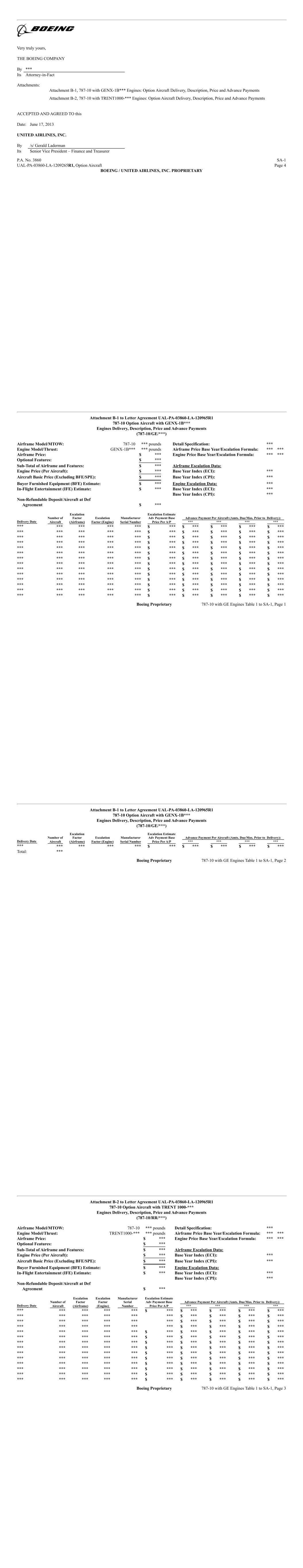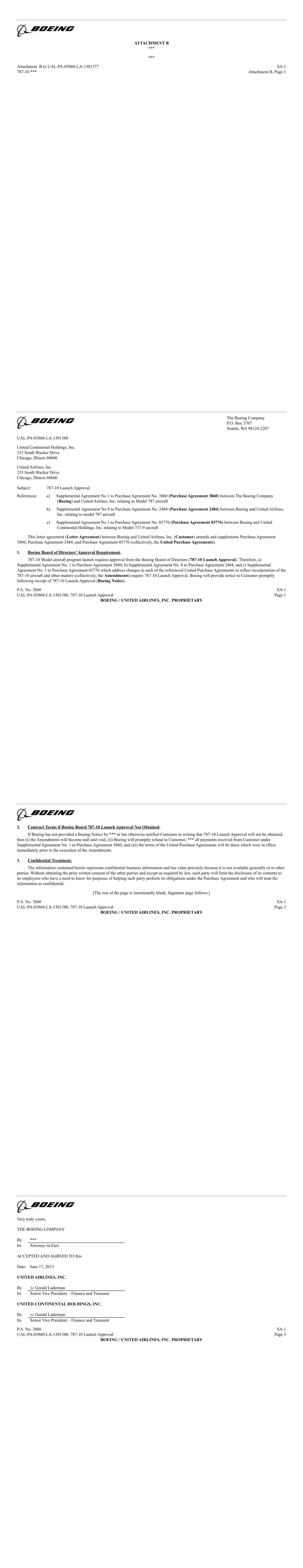 Exhibit 10.19 CERTAIN IDENTIFIED INFORMATION HAS BEEN EXCLUDED FROM THE EXHIBIT BECAUSE IT IS BOTH NOT MATERIAL AND IS THE TYPE THAT THE REGISTRANT TREATS AS PRIVATE OR CONFIDENTIAL. OMITTED INFORMATION HAS BEEN REPLACED WITH ASTERISKS. Supplemental Agreement No. 1 to Purchase Agreement No. 3860 between The Boeing Company and United Airlines, Inc. Relating to Boeing Model 787 Aircraft THIS SUPPLEMENTAL AGREEMENT, entered into as of June 17, 2013, by and between THE BOEING COMPANY (Boeing) and UNITED AIRLINES, INC. (a Delaware corporation formerly known as Continental Airlines, Inc. and successor by merger to United Air Lines, Inc.) (Customer); WHEREAS, the parties hereto entered into Purchase Agreement No. 3860 dated September 27, 2012, as amended and supplemented (Purchase Agreement), relating to the purchase and sale of Boeing Model 787 aircraft (Aircraft). This Supplemental Agreement is an amendment to the Purchase Agreement; WHEREAS, Boeing and Customer agree to revise the scheduled delivery of *** Model 787-8 Aircraft from ***: Manufacturer Serial Number Current Delivery Month Revised Delivery Month *** *** *** WHEREAS, Boeing and Customer agree to substitute *** Model 787-*** aircraft (787-*** Aircraft) in lieu of Model 787-*** aircraft (787-*** Aircraft) and to revise the scheduled delivery as follows: Manufacturer Serial Number 787-*** Aircraft Delivery Month 787-*** Aircraft Delivery Month *** *** *** *** *** *** *** *** *** *** *** *** *** *** *** *** *** *** UAL-PA-3860 SA-1, Page 1 BOEING / UNITED AIRLINES, INC. PROPRIETARY � !"#$#%&'()*+*,-. " ///!" 01!102" 34 5,67-,+.7*8*98*),:;7<=8* #$#%>>>()*+*,-.?8:)@8*A5B6.C #$#%&'()*+*,-.?8:)@8*A5B6.C/// /// ////// /// ////// /// ////// /// ////// /// ////// /// ////// /// ////// /// ////// /// ////// /// ///� /// /// !"/// 01!102" 34 #$#>>>()*+*,-.?8:)@8*A>>> #$#%&'()*+*,-.?8:)@8*A>>>/// ////// ////// ////// ////// ////// ////// ////// ////// ////// ///� !" 1D!1 0 1!!E1 F 0 G HG D IJ KLJM NOP " Q G HG D IJ G KLJ N ! Q "!1!1" !"! " ! R� /// ! OP !" #$#%&'ST.)B6()*+*,-.RHG D IJ DKUSVW;XYZ;W[V?(W\]W;V9̂W;_̀a\Sa\WV[(\b � ! "##!!"$ ! %& '(')***+,-.-/01234,53-6*** '(')789:1,;<+,-.-/01234,53-6*** � ##!!"$ =# $ >***9:1,;<+,-.-/01? # ! %& ***9:1,;<+,-.-/01234,53-6@;<1A '(')789:1,;<+,-.-/01234,53-6@;<1A � ## "B$ # %! B! #C ! !B "D� #" ! C ! E FEGHIEJKJHI !LC !B MFEGHIEJKNH !L!CM FEGHIEJKNN !L#!CMO� #"!$ E FEGHIEJKNPP !D� # # >#'(')78Q3-0;-R/<.3ST/-/<133UV # W #" %##G X D� #"# # Y%# # B$# %! %! #"! #FEGHI GHZ9[\]Ŝ_]\̀[2+\ab\][cd\]efQa9Qa\[̀ +ag �� � � � �� �� � � ! "# � � � ��� �� $%$&'("��$%$&'()"� ! "# �� "�* +��� ��� +�� � $%$&,"��� � � � - " ."-&/"&(0%1(&-"&'0('0$0 ! "# � � � $%$&'("� 2� ' / � " � $%$&'()"� � � # �" 3' / � " �� � ! "# � � �$%$&'(+ ���� 4 �� �5 3)2 ! *)! � � � � � � � / � " �6'2� �" ! � � 7 82� 9��� 2� ��� �� : �� � 7��7 �� $%$&'("�� � # �" 3' / � " ;2� 2 � / � " � � � < �$%$&)"�$%$&'("�� � 7 $%$&%"��6;'2� ' � 7 2� '�� � � � # �" + $%$&%��;;2� ' � 7 2� '�� � � � # �" + $%$&,��;02 ���� � � $%$&'(��6) ='>2� '� $%$&'("� ? 3@&' �) ='>2� '� $%$&'("� 2! 32'(((& ."-&/"&0%1( #"&'/� ABCDEFGHIFEJDKLEMNEFDOPEFQRSMCSMEDJLMT