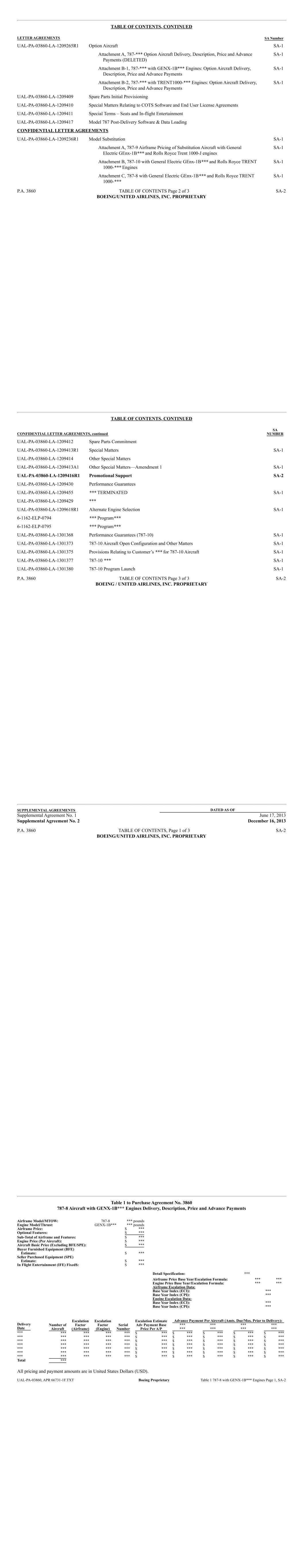 Exhibit 10.20 CERTAIN IDENTIFIED INFORMATION HAS BEEN EXCLUDED FROM THE EXHIBIT BECAUSE IT IS BOTH NOT MATERIAL AND IS THE TYPE THAT THE REGISTRANT TREATS AS PRIVATE OR CONFIDENTIAL. OMITTED INFORMATION HAS BEEN REPLACED WITH ASTERISKS. Supplemental Agreement No. 2 to Purchase Agreement No. 3860 between The Boeing Company and United Airlines, Inc. Relating to Boeing Model 787 Aircraft THIS SUPPLEMENTAL AGREEMENT, entered into as of December 16, 2013, by and between THE BOEING COMPANY (Boeing) and UNITED AIRLINES, INC. (a Delaware corporation formerly known as Continental Airlines, Inc. and successor by merger to United Air Lines, Inc.) (Customer); WHEREAS, the parties hereto entered into Purchase Agreement No. 3860 dated September 27, 2012, as amended and supplemented (Purchase Agreement), relating to the purchase and sale of Boeing Model 787 aircraft (Aircraft). This Supplemental Agreement is an amendment to the Purchase Agreement; WHEREAS, Boeing and Customer agree to substitute *** Model 787-*** aircraft (787-*** Aircraft) in lieu of Model 787-*** aircraft (787-*** Aircraft) and to revise the scheduled delivery for these Aircraft as follows: 787-*** Aircraft 787-*** Aircraft Manufacturer Serial Number Delivery Month Delivery Month *** *** *** *** *** *** *** WHEREAS, Boeing and Customer have previously agreed to accelerate the promotional support funds for the Aircraft so that such promotional support funds were made available Customer on ***; and WHEREAS, Customer has agreed to configure the Aircraft with engines provided by General Electric; UAL-PA-3860 SA-2, Page 1 BOEING / UNITED AIRLINES, INC. PROPRIETARY � !" #$ " % &#$ '#$ (�") ")" #")"!"#! %#! (*+,+-, ")")"#! %#! (*+,+-. ")"/"#! %#! (*+,+-!0 "/" 1 % 121--0/,30-1-!)0.4!3&('121--0/,30-1-!)0.4!3! " ##5 " 6%#7"("821--/,30 (-) )9:;<=>?@=<A;BC<DE<=;FG<=HIJD:JD<;ACDK ��� � !"#$%!&'(#) *#"+(",-"#./"#%0112 3 114 5 6 78 9 78 9::; < 7=< >; <? <96 95 5: :@ABC 7:D? 8@ !"#$E*#"+(",-"#./"#%0',!',"(,) � � �� !!"#$ %&' "(%)! %&* + %&, +- %&. !! /-# %&� 01 2324356789 :40;;;<=6<>?6@A@BC7 <CD@EB76D<�BFG> 4H01 2324I56789 :40;;;<=6<>?6@A@BC7 <CD@EB76D<�BFG> 4H01 23240J56789 :40;;;<=6<>?6@A@BC7 <CD@EB76D<�BFG> 4H:K � LML&MNO NP ' LML&QNO NP * LML&RNO NP %&S N"(TU-#!T#$ #V# WW �:K � X X# !Y#-ZN-![$ \# S\X S\X]V# %&O% O# -%$$ " - XX XPX# ZXP̂;;; %_+ %(_N+ O -$ # ��9 � ̀_&+&R*MaR&_&'RQ',L LML&XVP ̀_&+&R*MaR&_&'RQ'a, [$O NP # +*MaR /S_X[\O[b/Xb/%+P N* %& 9c �d e 1WW �f