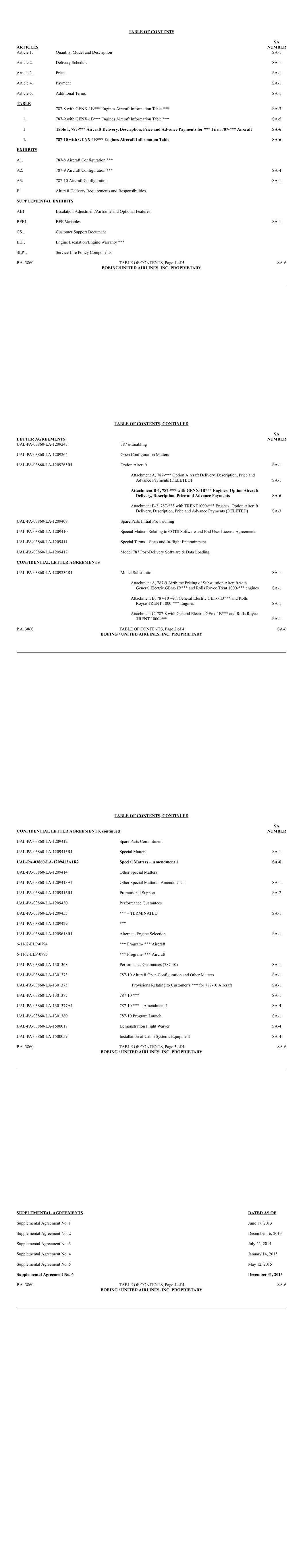 TABLE OF CONTENTS ARTICLES SA NUMBER Article 1. Quantity, Model and Description SA-1 Article 2. Delivery Schedule SA-1 Article 3. Price SA-1 Article 4. Payment SA-1 Article 5. Additional Terms SA-1 TABLE 1. 787-8 with GENX-1B*** Engines Aircraft Information Table *** SA-3 1. 787-9 with GENX-1B*** Engines Aircraft Information Table *** SA-5 1 Table 1, 787-*** Aircraft Delivery, Description, Price and Advance Payments for *** Firm 787-*** Aircraft SA-6 1. 787-10 with GENX-1B*** Engines Aircraft Information Table SA-6 EXHIBITS A1. 787-8 Aircraft Configuration *** A2. 787-9 Aircraft Configuration *** SA-4 A3. 787-10 Aircraft Configuration SA-1 B. Aircraft Delivery Requirements and Responsibilities SUPPLEMENTAL EXHIBITS AE1. Escalation Adjustment/Airframe and Optional Features BFE1. BFE Variables SA-1 CS1. Customer Support Document EE1. Engine Escalation/Engine Warranty *** SLP1. Service Life Policy Components P.A. 3860 TABLE OF CONTENTS, Page 1 of 5 SA-6 BOEING/UNITED AIRLINES, INC. PROPRIETARY TABLE OF CONTENTS, CONTINUED LETTER AGREEMENTS SA NUMBER UAL-PA-03860-LA-1209247 787 e-Enabling UAL-PA-03860-LA-1209264 Open Configuration Matters UAL-PA-03860-LA-1209265R1 Option Aircraft SA-1 Attachment A, 787-*** Option Aircraft Delivery, Description, Price and Advance Payments (DELETED) SA-1 Attachment B-1, 787-*** with GENX-1B*** Engines: Option Aircraft Delivery, Description, Price and Advance Payments SA-6 Attachment B-2, 787-*** with TRENT1000-*** Engines: Option Aircraft Delivery, Description, Price and Advance Payments (DELETED) SA-3 UAL-PA-03860-LA-1209409 Spare Parts Initial Provisioning UAL-PA-03860-LA-1209410 Special Matters Relating to COTS Software and End User License Agreements UAL-PA-03860-LA-1209411 Special Terms – Seats and In-flight Entertainment UAL-PA-03860-LA-1209417 Model 787 Post-Delivery Software & Data Loading CONFIDENTIAL LETTER AGREEMENTS UAL-PA-03860-LA-1209236R1 Model Substitution SA-1 Attachment A, 787-9 Airframe Pricing of Substitution Aircraft with General Electric GEnx-1B*** and Rolls Royce Trent 1000-*** engines SA-1 Attachment B, 787-10 with General Electric GEnx-1B*** and Rolls Royce TRENT 1000-*** Engines SA-1 Attachment C, 787-8 with General Electric GEnx-1B*** and Rolls Royce TRENT 1000-*** SA-1 P.A. 3860 TABLE OF CONTENTS, Page 2 of 4 SA-6 BOEING / UNITED AIRLINES, INC. PROPRIETARY TABLE OF CONTENTS, CONTINUED CONFIDENTIAL LETTER AGREEMENTS, continued SA NUMBER UAL-PA-03860-LA-1209412 Spare Parts Commitment UAL-PA-03860-LA-1209413R1 Special Matters SA-1 UAL-PA-03860-LA-1209413A1R2 Special Matters – Amendment 1 SA-6 UAL-PA-03860-LA-1209414 Other Special Matters UAL-PA-03860-LA-1209413A1 Other Special Matters - Amendment 1 SA-1 UAL-PA-03860-LA-1209416R1 Promotional Support SA-2 UAL-PA-03860-LA-1209430 Performance Guarantees UAL-PA-03860-LA-1209455 *** – TERMINATED SA-1 UAL-PA-03860-LA-1209429 *** UAL-PA-03860-LA-1209618R1 Alternate Engine Selection SA-1 6-1162-ELP-0794 *** Program- *** Aircraft 6-1162-ELP-0795 *** Program- *** Aircraft UAL-PA-03860-LA-1301368 Performance Guarantees (787-10) SA-1 UAL-PA-03860-LA-1301373 787-10 Aircraft Open Configuration and Other Matters SA-1 UAL-PA-03860-LA-1301375 Provisions Relating to Customer’s *** for 787-10 Aircraft SA-1 UAL-PA-03860-LA-1301377 787-10 *** SA-1 UAL-PA-03860-LA-1301377A1 787-10 *** – Amendment 1 SA-4 UAL-PA-03860-LA-1301380 787-10 Program Launch SA-1 UAL-PA-03860-LA-1500017 Demonstration Flight Waiver SA-4 UAL-PA-03860-LA-1500059 Installation of Cabin Systems Equipment SA-4 P.A. 3860 TABLE OF CONTENTS, Page 3 of 4 SA-6 BOEING / UNITED AIRLINES, INC. PROPRIETARY SUPPLEMENTAL AGREEMENTS DATED AS OF Supplemental Agreement No. 1 June 17, 2013 Supplemental Agreement No. 2 December 16, 2013 Supplemental Agreement No. 3 July 22, 2014 Supplemental Agreement No. 4 January 14, 2015 Supplemental Agreement No. 5 May 12, 2015 Supplemental Agreement No. 6 December 31, 2015 P.A. 3860 TABLE OF CONTENTS, Page 4 of 4 SA-6 BOEING / UNITED AIRLINES, INC. PROPRIETARY