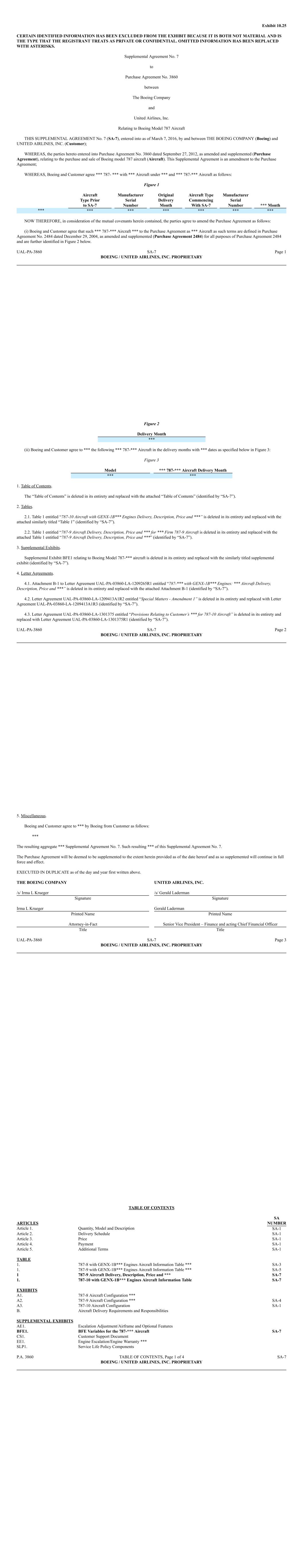 Exhibit 10.25 CERTAIN IDENTIFIED INFORMATION HAS BEEN EXCLUDED FROM THE EXHIBIT BECAUSE IT IS BOTH NOT MATERIAL AND IS THE TYPE THAT THE REGISTRANT TREATS AS PRIVATE OR CONFIDENTIAL. OMITTED INFORMATION HAS BEEN REPLACED WITH ASTERISKS. Supplemental Agreement No. 7 to Purchase Agreement No. 3860 between The Boeing Company and United Airlines, Inc. Relating to Boeing Model 787 Aircraft THIS SUPPLEMENTAL AGREEMENT No. 7 (SA-7), entered into as of March 7, 2016, by and between THE BOEING COMPANY (Boeing) and UNITED AIRLINES, INC. (Customer); WHEREAS, the parties hereto entered into Purchase Agreement No. 3860 dated September 27, 2012, as amended and supplemented (Purchase Agreement), relating to the purchase and sale of Boeing model 787 aircraft (Aircraft). This Supplemental Agreement is an amendment to the Purchase Agreement; WHEREAS, Boeing and Customer agree *** 787- *** with *** Aircraft under *** and *** 787-*** Aircraft as follows: Figure 1 Aircraft Type Prior to SA-7 Manufacturer Serial Number Original Delivery Month Aircraft Type Commencing With SA-7 Manufacturer Serial Number *** Month *** *** *** *** *** *** *** NOW THEREFORE, in consideration of the mutual covenants herein contained, the parties agree to amend the Purchase Agreement as follows: (i) Boeing and Customer agree that such *** 787-*** Aircraft *** to the Purchase Agreement as *** Aircraft as such terms are defined in Purchase Agreement No. 2484 dated December 29, 2004, as amended and supplemented (Purchase Agreement 2484) for all purposes of Purchase Agreement 2484 and are further identified in Figure 2 below. UAL-PA-3860 SA-7 Page 1 BOEING / UNITED AIRLINES, INC. PROPRIETARY Figure 2 Delivery Month *** (ii) Boeing and Customer agree to *** the following *** 787-*** Aircraft in the delivery months with *** dates as specified below in Figure 3: Figure 3 Model *** 787-*** Aircraft Delivery Month *** *** 1. Table of Contents. The “Table of Contents” is deleted in its entirety and replaced with the attached “Table of Contents” (identified by “SA-7”). 2. Tables. 2.1. Table 1 entitled “787-10 Aircraft with GENX-1B*** Engines Delivery, Description, Price and ***” is deleted in its entirety and replaced with the attached similarly titled “Table 1” (identified by “SA-7”). 2.2. Table 1 entitled “787-9 Aircraft Delivery, Description, Price and *** for *** Firm 787-9 Aircraft is deleted in its entirety and replaced with the attached Table 1 entitled “787-9 Aircraft Delivery, Description, Price and ***” (identified by “SA-7”). 3. Supplemental Exhibits. Supplemental Exhibit BFE1 relating to Boeing Model 787-*** aircraft is deleted in its entirety and replaced with the similarly titled supplemental exhibit (identified by “SA-7”). 4. Letter Agreements. 4.1. Attachment B-1 to Letter Agreement UAL-PA-03860-LA-1209265R1 entitled “787-*** with GENX-1B*** Engines: *** Aircraft Delivery, Description, Price and ***” is deleted in its entirety and replaced with the attached Attachment B-1 (identified by “SA-7”). 4.2. Letter Agreement UAL-PA-03860-LA-1209413A1R2 entitled “Special Matters - Amendment 1” is deleted in its entirety and replaced with Letter Agreement UAL-PA-03860-LA-1209413A1R3 (identified by “SA-7”). 4.3. Letter Agreement UAL-PA-03860-LA-1301375 entitled “Provisions Relating to Customer’s *** for 787-10 Aircraft” is deleted in its entirety and replaced with Letter Agreement UAL-PA-03860-LA-1301375R1 (identified by “SA-7”). UAL-PA-3860 SA-7 Page 2 BOEING / UNITED AIRLINES, INC. PROPRIETARY 5. Miscellaneous. Boeing and Customer agree to *** by Boeing from Customer as follows: *** The resulting aggregate *** Supplemental Agreement No. 7. Such resulting *** of this Supplemental Agreement No. 7. The Purchase Agreement will be deemed to be supplemented to the extent herein provided as of the date hereof and as so supplemented will continue in full force and effect. EXECUTED IN DUPLICATE as of the day and year first written above. THE BOEING COMPANY UNITED AIRLINES, INC. /s/ Irma L Krueger /s/ Gerald Laderman Signature Signature Irma L Krueger Gerald Laderman Printed Name Printed Name Attorney-in-Fact Senior Vice President – Finance and acting Chief Financial Officer Title Title UAL-PA-3860 SA-7 Page 3 BOEING / UNITED AIRLINES, INC. PROPRIETARY TABLE OF CONTENTS ARTICLES SA NUMBER Article 1. Quantity, Model and Description SA-1 Article 2. Delivery Schedule SA-1 Article 3. Price SA-1 Article 4. Payment SA-1 Article 5. Additional Terms SA-1 TABLE 1. 787-8 with GENX-1B*** Engines Aircraft Information Table *** SA-3 1. 787-9 with GENX-1B*** Engines Aircraft Information Table *** SA-5 1 787-9 Aircraft Delivery, Description, Price and *** SA-7 1. 787-10 with GENX-1B*** Engines Aircraft Information Table SA-7 EXHIBITS A1. 787-8 Aircraft Configuration *** A2. 787-9 Aircraft Configuration *** SA-4 A3. 787-10 Aircraft Configuration SA-1 B. Aircraft Delivery Requirements and Responsibilities SUPPLEMENTAL EXHIBITS AE1. Escalation Adjustment/Airframe and Optional Features BFE1. BFE Variables for the 787-*** Aircraft SA-7 CS1. Customer Support Document EE1. Engine Escalation/Engine Warranty *** SLP1. Service Life Policy Components P.A. 3860 TABLE OF CONTENTS, Page 1 of 4 SA-7 BOEING / UNITED AIRLINES, INC. PROPRIETARY