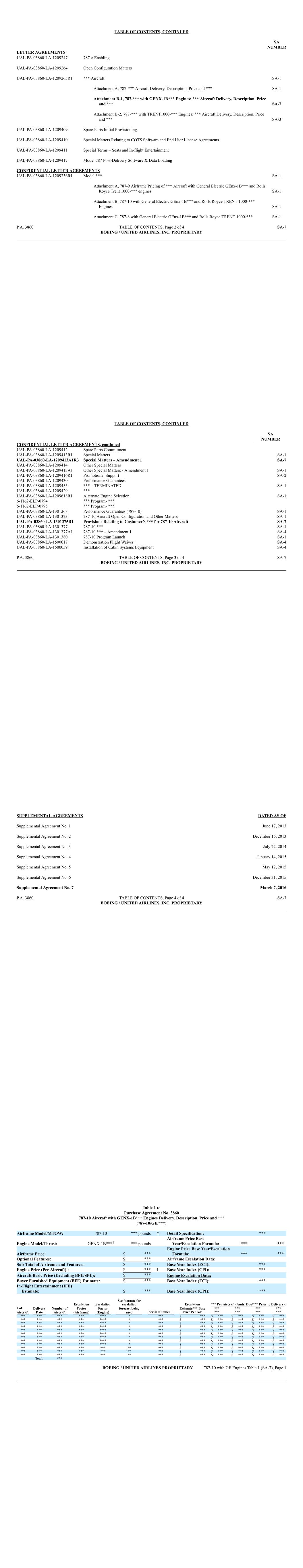 TABLE OF CONTENTS, CONTINUED SA NUMBER LETTER AGREEMENTS UAL-PA-03860-LA-1209247 787 e-Enabling UAL-PA-03860-LA-1209264 Open Configuration Matters UAL-PA-03860-LA-1209265R1 *** Aircraft SA-1 Attachment A, 787-*** Aircraft Delivery, Description, Price and *** SA-1 Attachment B-1, 787-*** with GENX-1B*** Engines: *** Aircraft Delivery, Description, Price and *** SA-7 Attachment B-2, 787-*** with TRENT1000-*** Engines: *** Aircraft Delivery, Description, Price and *** SA-3 UAL-PA-03860-LA-1209409 Spare Parts Initial Provisioning UAL-PA-03860-LA-1209410 Special Matters Relating to COTS Software and End User License Agreements UAL-PA-03860-LA-1209411 Special Terms – Seats and In-flight Entertainment UAL-PA-03860-LA-1209417 Model 787 Post-Delivery Software & Data Loading CONFIDENTIAL LETTER AGREEMENTS UAL-PA-03860-LA-1209236R1 Model *** SA-1 Attachment A, 787-9 Airframe Pricing of *** Aircraft with General Electric GEnx-1B*** and Rolls Royce Trent 1000-*** engines SA-1 Attachment B, 787-10 with General Electric GEnx-1B*** and Rolls Royce TRENT 1000-*** Engines SA-1 Attachment C, 787-8 with General Electric GEnx-1B*** and Rolls Royce TRENT 1000-*** SA-1 P.A. 3860 TABLE OF CONTENTS, Page 2 of 4 SA-7 BOEING / UNITED AIRLINES, INC. PROPRIETARY TABLE OF CONTENTS, CONTINUED SA NUMBER CONFIDENTIAL LETTER AGREEMENTS, continued UAL-PA-03860-LA-1209412 Spare Parts Commitment UAL-PA-03860-LA-1209413R1 Special Matters SA-1 UAL-PA-03860-LA-1209413A1R3 Special Matters – Amendment 1 SA-7 UAL-PA-03860-LA-1209414 Other Special Matters UAL-PA-03860-LA-1209413A1 Other Special Matters - Amendment 1 SA-1 UAL-PA-03860-LA-1209416R1 Promotional Support SA-2 UAL-PA-03860-LA-1209430 Performance Guarantees UAL-PA-03860-LA-1209455 *** – TERMINATED SA-1 UAL-PA-03860-LA-1209429 *** UAL-PA-03860-LA-1209618R1 Alternate Engine Selection SA-1 6-1162-ELP-0794 *** Program- *** 6-1162-ELP-0795 *** Program- *** UAL-PA-03860-LA-1301368 Performance Guarantees (787-10) SA-1 UAL-PA-03860-LA-1301373 787-10 Aircraft Open Configuration and Other Matters SA-1 UAL-PA-03860-LA-1301375R1 Provisions Relating to Customer’s *** for 787-10 Aircraft SA-7 UAL-PA-03860-LA-1301377 787-10 *** SA-1 UAL-PA-03860-LA-1301377A1 787-10 *** – Amendment 1 SA-4 UAL-PA-03860-LA-1301380 787-10 Program Launch SA-1 UAL-PA-03860-LA-1500017 Demonstration Flight Waiver SA-4 UAL-PA-03860-LA-1500059 Installation of Cabin Systems Equipment SA-4 P.A. 3860 TABLE OF CONTENTS, Page 3 of 4 SA-7 BOEING / UNITED AIRLINES, INC. PROPRIETARY SUPPLEMENTAL AGREEMENTS DATED AS OF Supplemental Agreement No. 1 June 17, 2013 Supplemental Agreement No. 2 December 16, 2013 Supplemental Agreement No. 3 July 22, 2014 Supplemental Agreement No. 4 January 14, 2015 Supplemental Agreement No. 5 May 12, 2015 Supplemental Agreement No. 6 December 31, 2015 Supplemental Agreement No. 7 March 7, 2016 P.A. 3860 TABLE OF CONTENTS, Page 4 of 4 SA-7 BOEING / UNITED AIRLINES, INC. PROPRIETARY Table 1 to Purchase Agreement No. 3860 787-10 Aircraft with GENX-1B*** Engines Delivery, Description, Price and *** (787-10/GE/***) Airframe Model/MTOW: 787-10 *** pounds # Detail Specification: *** Engine Model/Thrust: GENX-1B***1 *** pounds Airframe Price Base Year/Escalation Formula: *** *** Airframe Price: $ *** Engine Price Base Year/Escalation Formula: *** *** Optional Features: $ *** Airframe Escalation Data: Sub-Total of Airframe and Features: $ *** Base Year Index (ECI): *** Engine Price (Per Aircraft) : $ *** 1 Base Year Index (CPI): *** Aircraft Basic Price (Excluding BFE/SPE): $ *** Engine Escalation Data: Buyer Furnished Equipment (BFE) Estimate: $ *** Base Year Index (ECI): *** In-Flight Entertainment (IFE) Estimate: $ *** Base Year Index (CPI): *** Escalation Escalation See footnote for escalation Escalation *** Per Aircraft (Amts. Due/*** Prior to Delivery): # of Delivery Number of Factor Factor forecast being Estimate*** Base *** *** *** *** Aircraft Date Aircraft (Airframe) (Engine) used Serial Number + Price Per A/P *** *** *** *** *** *** *** *** **** * *** $ *** $ *** $ *** $ *** $ *** *** *** *** *** **** * *** $ *** $ *** $ *** $ *** $ *** *** *** *** *** **** * *** $ *** $ *** $ *** $ *** $ *** *** *** *** *** **** * *** $ *** $ *** $ *** $ *** $ *** *** *** *** *** **** * *** $ *** $ *** $ *** $ *** $ *** *** *** *** *** **** * *** $ *** $ *** $ *** $ *** $ *** *** *** *** *** **** * *** $ *** $ *** $ *** $ *** $ *** *** *** *** *** **** * *** $ *** $ *** $ *** $ *** $ *** *** *** *** *** **** * *** $ *** $ *** $ *** $ *** $ *** *** *** *** *** *** ** *** $ *** $ *** $ *** $ *** $ *** *** *** *** *** *** ** *** $ *** $ *** $ *** $ *** $ *** *** *** *** *** *** ** *** $ *** $ *** $ *** $ *** $ *** Total: *** BOEING / UNITED AIRLINES PROPRIETARY 787-10 with GE Engines Table 1 (SA-7), Page 1