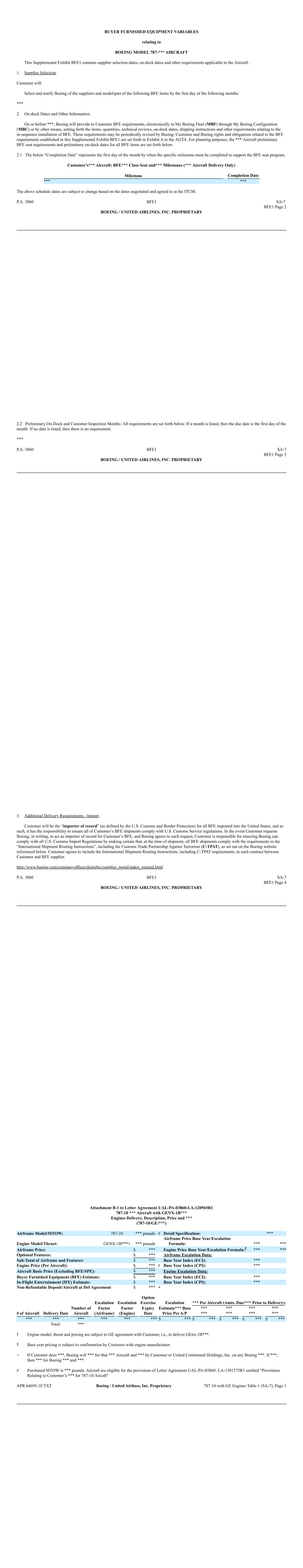 BUYER FURNISHED EQUIPMENT VARIABLES relating to BOEING MODEL 787-*** AIRCRAFT This Supplemental Exhibit BFE1 contains supplier selection dates, on-dock dates and other requirements applicable to the Aircraft. 1. Supplier Selection. Customer will: Select and notify Boeing of the suppliers and model/part of the following BFE items by the first day of the following months: *** 2. On-dock Dates and Other Information. On or before ***, Boeing will provide to Customer BFE requirements, electronically in My Boeing Fleet (MBF) through My Boeing Configuration (MBC) or by other means, setting forth the items, quantities, technical reviews, on-dock dates, shipping instructions and other requirements relating to the in-sequence installation of BFE. These requirements may be periodically revised by Boeing. Customer and Boeing rights and obligations related to the BFE requirements established in this Supplemental Exhibit BFE1 are set forth in Exhibit A to the AGTA. For planning purposes, the *** Aircraft preliminary BFE seat requirements and preliminary on-dock dates for all BFE items are set forth below. 2.1 The below “Completion Date” represents the first day of the month by when the specific milestone must be completed to support the BFE seat program. Customer’s*** Aircraft: BFE*** Class Seat and*** Milestones (*** Aircraft Delivery Only) Milestone Completion Date *** *** The above schedule dates are subject to change based on the dates negotiated and agreed to at the ITCM. P.A. 3860 BFE1 SA-7 BFE1 Page 2 BOEING / UNITED AIRLINES, INC. PROPRIETARY 2.2 Preliminary On-Dock and Customer Inspection Months: All requirements are set forth below. If a month is listed, then the due date is the first day of the month. If no date is listed, then there is no requirement. *** P.A. 3860 BFE1 SA-7 BFE1 Page 3 BOEING / UNITED AIRLINES, INC. PROPRIETARY 3. Additional Delivery Requirements - Import. Customer will be the “importer of record” (as defined by the U.S. Customs and Border Protection) for all BFE imported into the United States, and as such, it has the responsibility to ensure all of Customer’s BFE shipments comply with U.S. Customs Service regulations. In the event Customer requests Boeing, in writing, to act as importer of record for Customer’s BFE, and Boeing agrees to such request, Customer is responsible for ensuring Boeing can comply with all U.S. Customs Import Regulations by making certain that, at the time of shipment, all BFE shipments comply with the requirements in the “International Shipment Routing Instructions”, including the Customs Trade Partnership Against Terrorism (C-TPAT), as set out on the Boeing website referenced below. Customer agrees to include the International Shipment Routing Instructions, including C-TPAT requirements, in each contract between Customer and BFE supplier. http://www.boeing.com/companyoffices/doingbiz/supplier_portal/index_general.html P.A. 3860 BFE1 SA-7 BFE1 Page 4 BOEING / UNITED AIRLINES, INC. PROPRIETARY Attachment B-1 to Letter Agreement UAL-PA-03860-LA-120965R1 787-10 *** Aircraft with GENX-1B*** Engines Delivery, Description, Price and *** (787-10/GE/***) Airframe Model/MTOW: 787-10 *** pounds # Detail Specification: *** Engine Model/Thrust: GENX-1B***1 *** pounds Airframe Price Base Year/Escalation Formula: *** *** Airframe Price: $ *** Engine Price Base Year/Escalation Formula:2 *** *** Optional Features: $ *** Airframe Escalation Data: Sub-Total of Airframe and Features: $ *** Base Year Index (ECI): *** Engine Price (Per Aircraft): $ *** 1 Base Year Index (CPI): *** Aircraft Basic Price (Excluding BFE/SPE): $ *** Engine Escalation Data: Buyer Furnished Equipment (BFE) Estimate: $ *** Base Year Index (ECI): *** In-Flight Entertainment (IFE) Estimate: $ *** Base Year Index (CPI): *** Non-Refundable Deposit/Aircraft at Def Agreement $ *** + Escalation Escalation Option Exercise Escalation *** Per Aircraft (Amts. Due/*** Prior to Delivery): Number of Factor Factor Expiry Estimate*** Base *** *** *** *** # of Aircraft Delivery Date Aircraft (Airframe) (Engine) Date Price Per A/P *** *** *** *** *** *** *** *** *** *** $ *** $ *** $ *** $ *** $ *** Total: *** 1 Engine model, thrust and pricing are subject to GE agreement with Customer, i.e., to deliver GEnx-1B***. 2 Base year pricing is subject to confirmation by Customer with engine manufacturer. + If Customer does ***, Boeing will *** for that *** Aircraft and *** by Customer or United Continental Holdings, Inc. on any Boeing ***. If ***, then *** for Boeing *** and ***. # Purchased MTOW is *** pounds. Aircraft are eligible for the provisions of Letter Agreement UAL-PA-03860- LA-1301375R1 entitled “Provisions Relating to Customer’s *** for 787-10 Aircaft” APR 64695-1F.TXT Boeing / United Airlines, Inc. Proprietary 787-10 with GE Engines Table 1 (SA-7), Page 1
