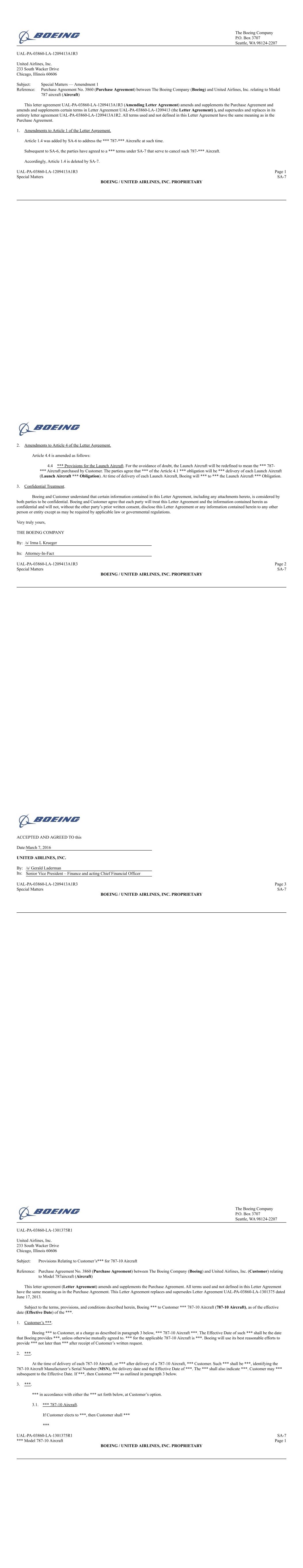 3.2 ***. 3.3 ***. 3.4 Customer’s ***. If Customer ***, the price for such *** shall be calculated as follows: *** 3.5 ***. UAL-PA-03860-LA-1301375R1 *** 787-10 Aircraft SA-7 Page 2 BOEING / UNITED AIRLINES, INC. PROPRIETARY 4. ***. 4.1 ***. 4.2 ***. 5. ***. 6. ***. 7. Confidential Treatment. Boeing and Customer understand that certain information contained in this Letter Agreement, including any attachments hereto, is considered by both parties to be confidential. Boeing and Customer agree that each party will treat this Letter Agreement and the information contained herein as confidential and will not, without the other party’s prior written consent, disclose this Letter Agreement or any information contained herein to any other person or entity except as may be required by applicable law or governmental regulations. Very truly yours, THE BOEING COMPANY By: /s/ Irma L Krueger Its: Attorney-in-Fact UAL-PA-03860-LA-1301375R1 *** 787-10 Aircraft SA-7 Page 3 BOEING / UNITED AIRLINES, INC. PROPRIETARY ACCEPTED AND AGREED TO this Date:March 7, 2016 UNITED AIRLINES, INC. By: /s/ Gerald Laderman Its: Senior Vice President – Finance and acting Chief Financial Officer UAL-PA-03860-LA-1301375R1 *** 787-10 Aircraft SA-7 Page 4 BOEING / UNITED AIRLINES, INC. PROPRIETARY Attachment A to Letter Agreement UAL-PA-03860-LA-1301375R1 Date: United Airlines, Inc. 233 South Wacker Drive Chicago, Illinois 60606 Attention: *** Reference: Letter Agreement UAL-PA-03860-LA-1301375R1 to Boeing/UAL Purchase Agreement 3860 Transmitted by email *** Very truly yours, THE BOEING COMPANY By: Its: UAL-PA-03860-LA-1301375R1, Attachment A *** 787-10 Aircraft SA-7 Page 5 BOEING / UNITED AIRLINES, INC. PROPRIETARY