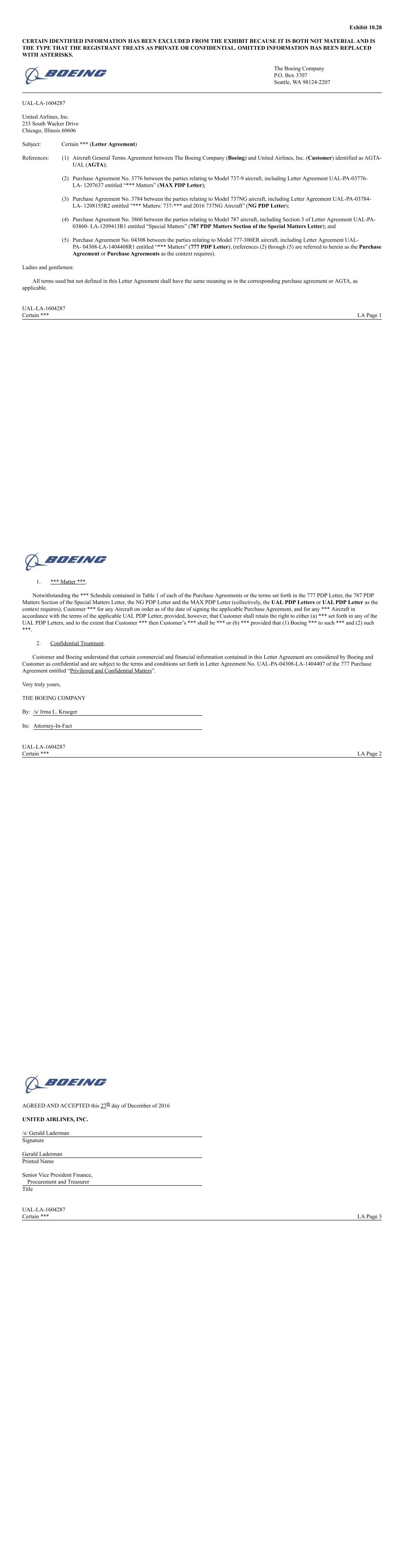 Exhibit 10.28 CERTAIN IDENTIFIED INFORMATION HAS BEEN EXCLUDED FROM THE EXHIBIT BECAUSE IT IS BOTH NOT MATERIAL AND IS THE TYPE THAT THE REGISTRANT TREATS AS PRIVATE OR CONFIDENTIAL. OMITTED INFORMATION HAS BEEN REPLACED WITH ASTERISKS. The Boeing Company P.O. Box 3707 Seattle, WA 98124-2207 UAL-LA-1604287 United Airlines, Inc. 233 South Wacker Drive Chicago, Illinois 60606 Subject: Certain *** (Letter Agreement) References: (1) Aircraft General Terms Agreement between The Boeing Company (Boeing) and United Airlines, Inc. (Customer) identified as AGTA- UAL (AGTA); (2) Purchase Agreement No. 3776 between the parties relating to Model 737-9 aircraft, including Letter Agreement UAL-PA-03776- LA- 1207637 entitled “*** Matters” (MAX PDP Letter); (3) Purchase Agreement No. 3784 between the parties relating to Model 737NG aircraft, including Letter Agreement UAL-PA-03784- LA- 1208155R2 entitled “*** Matters: 737-*** and 2016 737NG Aircraft” (NG PDP Letter); (4) Purchase Agreement No. 3860 between the parties relating to Model 787 aircraft, including Section 3 of Letter Agreement UAL-PA- 03860- LA-1209413R1 entitled “Special Matters” (787 PDP Matters Section of the Special Matters Letter); and (5) Purchase Agreement No. 04308 between the parties relating to Model 777-300ER aircraft, including Letter Agreement UAL- PA- 04308-LA-1404408R1 entitled “*** Matters” (777 PDP Letter), (references (2) through (5) are referred to herein as the Purchase Agreement or Purchase Agreements as the context requires). Ladies and gentlemen: All terms used but not defined in this Letter Agreement shall have the same meaning as in the corresponding purchase agreement or AGTA, as applicable. UAL-LA-1604287 Certain *** LA Page 1 1. *** Matter ***. Notwithstanding the *** Schedule contained in Table 1 of each of the Purchase Agreements or the terms set forth in the 777 PDP Letter, the 787 PDP Matters Section of the Special Matters Letter, the NG PDP Letter and the MAX PDP Letter (collectively, the UAL PDP Letters or UAL PDP Letter as the context requires), Customer *** for any Aircraft on order as of the date of signing the applicable Purchase Agreement, and for any *** Aircraft in accordance with the terms of the applicable UAL PDP Letter; provided, however, that Customer shall retain the right to either (a) *** set forth in any of the UAL PDP Letters, and to the extent that Customer *** then Customer’s *** shall be *** or (b) *** provided that (1) Boeing *** to such *** and (2) such ***. 2. Confidential Treatment. Customer and Boeing understand that certain commercial and financial information contained in this Letter Agreement are considered by Boeing and Customer as confidential and are subject to the terms and conditions set forth in Letter Agreement No. UAL-PA-04308-LA-1404407 of the 777 Purchase Agreement entitled “Privileged and Confidential Matters”. Very truly yours, THE BOEING COMPANY By: /s/ Irma L. Krueger Its: Attorney-In-Fact UAL-LA-1604287 Certain *** LA Page 2 AGREED AND ACCEPTED this 27th day of December of 2016 UNITED AIRLINES, INC. /s/ Gerald Laderman Signature Gerald Laderman Printed Name Senior Vice President Finance, Procurement and Treasurer Title UAL-LA-1604287 Certain *** LA Page 3