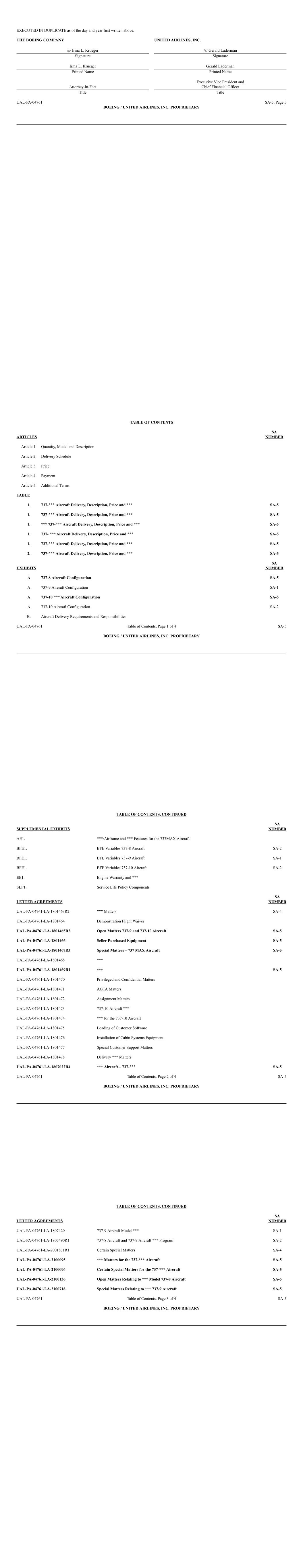 EXECUTED IN DUPLICATE as of the day and year first written above. THE BOEING COMPANY UNITED AIRLINES, INC. /s/ Irma L. Krueger /s/ Gerald Laderman Signature Signature Irma L. Krueger Gerald Laderman Printed Name Printed Name Attorney-in-Fact Executive Vice President and Chief Financial Officer Title Title UAL-PA-04761 SA-5, Page 5 BOEING / UNITED AIRLINES, INC. PROPRIETARY TABLE OF CONTENTS ARTICLES SA NUMBER Article 1. Quantity, Model and Description Article 2. Delivery Schedule Article 3. Price Article 4. Payment Article 5. Additional Terms TABLE 1. 737-*** Aircraft Delivery, Description, Price and *** SA-5 1. 737-*** Aircraft Delivery, Description, Price and *** SA-5 1. *** 737-*** Aircraft Delivery, Description, Price and *** SA-5 1. 737- *** Aircraft Delivery, Description, Price and *** SA-5 1. 737-*** Aircraft Delivery, Description, Price and *** SA-5 2. 737-*** Aircraft Delivery, Description, Price and *** SA-5 EXHIBITS SA NUMBER A 737-8 Aircraft Configuration SA-5 A 737-9 Aircraft Configuration SA-1 A 737-10 *** Aircraft Configuration SA-5 A 737-10 Aircraft Configuration SA-2 B. Aircraft Delivery Requirements and Responsibilities UAL-PA-04761 Table of Contents, Page 1 of 4 SA-5 BOEING / UNITED AIRLINES, INC. PROPRIETARY TABLE OF CONTENTS, CONTINUED SUPPLEMENTAL EXHIBITS SA NUMBER AE1. ***/Airframe and *** Features for the 737MAX Aircraft BFE1. BFE Variables 737-8 Aircraft SA-2 BFE1. BFE Variables 737-9 Aircraft SA-1 BFE1. BFE Variables 737-10 Aircraft SA-2 EE1. Engine Warranty and *** SLP1. Service Life Policy Components LETTER AGREEMENTS SA NUMBER UAL-PA-04761-LA-1801463R2 *** Matters SA-4 UAL-PA-04761-LA-1801464 Demonstration Flight Waiver UAL-PA-04761-LA-1801465R2 Open Matters 737-9 and 737-10 Aircraft SA-5 UAL-PA-04761-LA-1801466 Seller Purchased Equipment SA-5 UAL-PA-04761-LA-1801467R3 Special Matters – 737 MAX Aircraft SA-5 UAL-PA-04761-LA-1801468 *** UAL-PA-04761-LA-1801469R1 *** SA-5 UAL-PA-04761-LA-1801470 Privileged and Confidential Matters UAL-PA-04761-LA-1801471 AGTA Matters UAL-PA-04761-LA-1801472 Assignment Matters UAL-PA-04761-LA-1801473 737-10 Aircraft *** UAL-PA-04761-LA-1801474 *** for the 737-10 Aircraft UAL-PA-04761-LA-1801475 Loading of Customer Software UAL-PA-04761-LA-1801476 Installation of Cabin Systems Equipment UAL-PA-04761-LA-1801477 Special Customer Support Matters UAL-PA-04761-LA-1801478 Delivery *** Matters UAL-PA-04761-LA-1807022R4 *** Aircraft – 737-*** SA-5 UAL-PA-04761 Table of Contents, Page 2 of 4 SA-5 BOEING / UNITED AIRLINES, INC. PROPRIETARY TABLE OF CONTENTS, CONTINUED LETTER AGREEMENTS SA NUMBER UAL-PA-04761-LA-1807420 737-9 Aircraft Model *** SA-1 UAL-PA-04761-LA-1807490R1 737-8 Aircraft and 737-9 Aircraft *** Program SA-2 UAL-PA-04761-LA-2001831R1 Certain Special Matters SA-4 UAL-PA-04761-LA-2100095 *** Matters for the 737-*** Aircraft SA-5 UAL-PA-04761-LA-2100096 Certain Special Matters for the 737-*** Aircraft SA-5 UAL-PA-04761-LA-2100136 Open Matters Relating to *** Model 737-8 Aircraft SA-5 UAL-PA-04761-LA-2100718 Special Matters Relating to *** 737-9 Aircraft SA-5 UAL-PA-04761 Table of Contents, Page 3 of 4 SA-5 BOEING / UNITED AIRLINES, INC. PROPRIETARY
