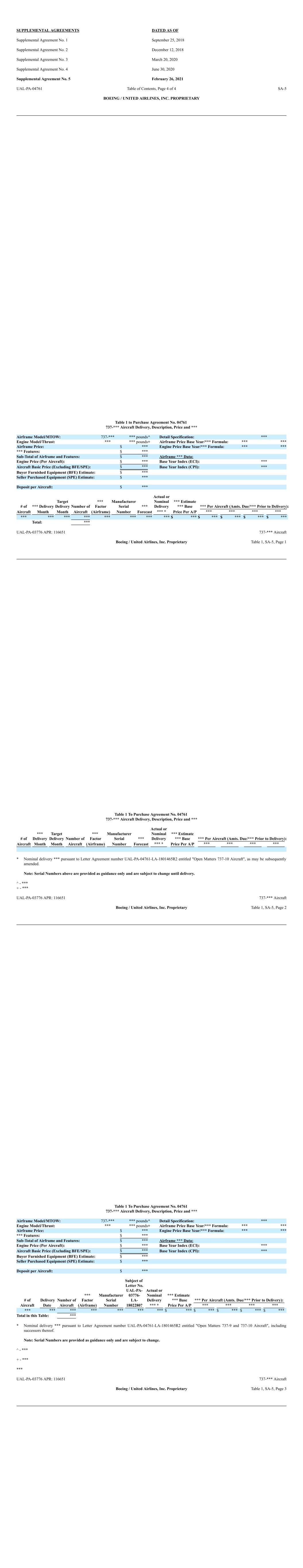 SUPPLEMENTAL AGREEMENTS DATED AS OF Supplemental Agreement No. 1 September 25, 2018 Supplemental Agreement No. 2 December 12, 2018 Supplemental Agreement No. 3 March 20, 2020 Supplemental Agreement No. 4 June 30, 2020 Supplemental Agreement No. 5 February 26, 2021 UAL-PA-04761 Table of Contents, Page 4 of 4 SA-5 BOEING / UNITED AIRLINES, INC. PROPRIETARY Table 1 to Purchase Agreement No. 04761 737-*** Aircraft Delivery, Description, Price and *** Airframe Model/MTOW: 737-*** *** pounds^ Detail Specification: *** Engine Model/Thrust: *** *** pounds+ Airframe Price Base Year/*** Formula: *** *** Airframe Price: $ *** Engine Price Base Year/*** Formula: *** *** *** Features: $ *** Sub-Total of Airframe and Features: $ *** Airframe *** Data: Engine Price (Per Aircraft): $ *** Base Year Index (ECI): *** Aircraft Basic Price (Excluding BFE/SPE): $ *** Base Year Index (CPI): *** Buyer Furnished Equipment (BFE) Estimate: $ *** Seller Purchased Equipment (SPE) Estimate: $ *** Deposit per Aircraft: $ *** # of *** Delivery Target Delivery Number of *** Factor Manufacturer Serial *** Actual or Nominal Delivery *** Estimate *** Base *** Per Aircraft (Amts. Due/*** Prior to Delivery): Aircraft Month Month Aircraft (Airframe) Number Forecast *** * Price Per A/P *** *** *** *** *** *** *** *** *** *** *** *** $ *** $ *** $ *** $ *** $ *** Total: *** UAL-PA-03776 APR: 116651 737-*** Aircraft Boeing / United Airlines, Inc. Proprietary Table 1, SA-5, Page 1 Table 1 To Purchase Agreement No. 04761 737-*** Aircraft Delivery, Description, Price and *** # of *** Delivery Target Delivery Number of *** Factor Manufacturer Serial *** Actual or Nominal Delivery *** Estimate *** Base *** Per Aircraft (Amts. Due/*** Prior to Delivery): Aircraft Month Month Aircraft (Airframe) Number Forecast *** * Price Per A/P *** *** *** *** * Nominal delivery *** pursuant to Letter Agreement number UAL-PA-04761-LA-1801465R2 entitled "Open Matters 737-10 Aircraft", as may be subsequently amended. Note: Serial Numbers above are provided as guidance only and are subject to change until delivery. ^ - *** + - *** UAL-PA-03776 APR: 116651 737-*** Aircraft Boeing / United Airlines, Inc. Proprietary Table 1, SA-5, Page 2 Table 1 To Purchase Agreement No. 04761 737-*** Aircraft Delivery, Description, Price and *** Airframe Model/MTOW: 737-*** *** pounds^ Detail Specification: *** Engine Model/Thrust: *** *** pounds+ Airframe Price Base Year/*** Formula: *** *** Airframe Price: $ *** Engine Price Base Year/*** Formula: *** *** *** Features: $ *** Sub-Total of Airframe and Features: $ *** Airframe *** Data: Engine Price (Per Aircraft): $ *** Base Year Index (ECI): *** Aircraft Basic Price (Excluding BFE/SPE): $ *** Base Year Index (CPI): *** Buyer Furnished Equipment (BFE) Estimate: $ *** Seller Purchased Equipment (SPE) Estimate: $ *** Deposit per Aircraft: $ *** # of Delivery Number of *** Factor Manufacturer Serial Subject of Letter No. UAL-PA- 03776- LA- Actual or Nominal Delivery *** Estimate *** Base *** Per Aircraft (Amts. Due/*** Prior to Delivery): Aircraft Date Aircraft (Airframe) Number 1802280? *** * Price Per A/P *** *** *** *** *** *** *** *** *** *** *** $ *** $ *** $ *** $ *** $ *** Total in this Table: *** * Nominal delivery *** pursuant to Letter Agreement number UAL-PA-04761-LA-1801465R2 entitled "Open Matters 737-9 and 737-10 Aircraft", including successors thereof. Note: Serial Numbers are provided as guidance only and are subject to change. ^ - *** + - *** *** UAL-PA-03776 APR: 116651 737-*** Aircraft Boeing / United Airlines, Inc. Proprietary Table 1, SA-5, Page 3