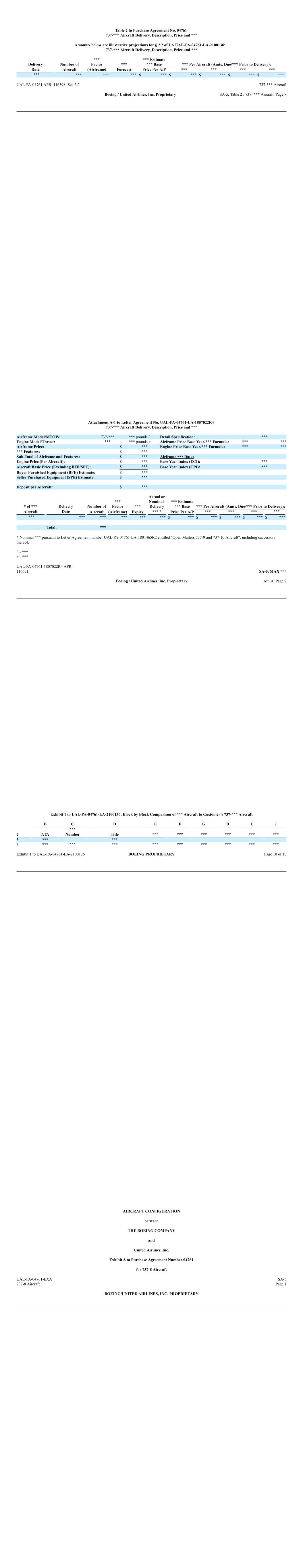 Table 2 to Purchase Agreement No. 04761 737-*** Aircraft Delivery, Description, Price and *** Amounts below are illustrative projections for § 2.2 of LA UAL-PA-04761-LA-2100136: 737-*** Aircraft Delivery, Description, Price and *** Delivery Number of *** Factor *** *** Estimate *** Base *** Per Aircraft (Amts. Due/*** Prior to Delivery): Date Aircraft (Airframe) Forecast Price Per A/P *** *** *** *** *** *** *** *** $ *** $ *** $ *** $ *** $ *** UAL-PA-04761 APR: 116598; Sec.2.2 737-*** Aircraft Boeing / United Airlines, Inc. Proprietary SA-5, Table 2 : 737- *** Aircraft, Page 8 Attachment A-1 to Letter Agreement No. UAL-PA-04761-LA-1807022R4 737-*** Aircraft Delivery, Description, Price and *** Airframe Model/MTOW: 737-*** *** pounds ^ Detail Specification: *** Engine Model/Thrust: *** *** pounds + Airframe Price Base Year/*** Formula: *** *** Airframe Price: $ *** Engine Price Base Year/*** Formula: *** *** *** Features: $ *** Sub-Total of Airframe and Features: $ *** Airframe *** Data: Engine Price (Per Aircraft): $ *** Base Year Index (ECI): *** Aircraft Basic Price (Excluding BFE/SPE): $ *** Base Year Index (CPI): *** Buyer Furnished Equipment (BFE) Estimate: $ *** Seller Purchased Equipment (SPE) Estimate: $ *** Deposit per Aircraft: $ *** # of *** Delivery Number of *** Factor *** Actual or Nominal Delivery *** Estimate *** Base *** Per Aircraft (Amts. Due/*** Prior to Delivery): Aircraft Date Aircraft (Airframe) Expiry *** * Price Per A/P *** *** *** *** *** *** *** *** *** *** $ *** $ *** $ *** $ *** $ *** Total: *** * Nominal *** pursuant to Letter Agreement number UAL-PA-04761-LA-1801465R2 entitled "Open Matters 737-9 and 737-10 Aircraft", including successors thereof. ^ - *** + - *** UAL-PA-04761-1807022R4 APR: 116651 SA-5, MAX *** Boeing / United Airlines, Inc. Proprietary Att. A, Page 9 Exhibit 1 to UAL-PA-04761-LA-2100136: Block by Block Comparison of *** Aircraft to Customer’s 737-*** Aircraft B C D E F G H I J 2 ATA *** Number Title *** *** *** *** *** *** 3 *** *** 4 *** *** *** *** *** *** *** *** *** Exhibit 1 to UAL-PA-04761-LA-2100136 BOEING PROPRIETARY Page 10 of 10 AIRCRAFT CONFIGURATION between THE BOEING COMPANY and United Airlines, Inc. Exhibit A to Purchase Agreement Number 04761 for 737-8 Aircraft UAL-PA-04761-EXA 737-8 Aircraft SA-5 Page 1 BOEING/UNITED AIRLINES, INC. PROPRIETARY