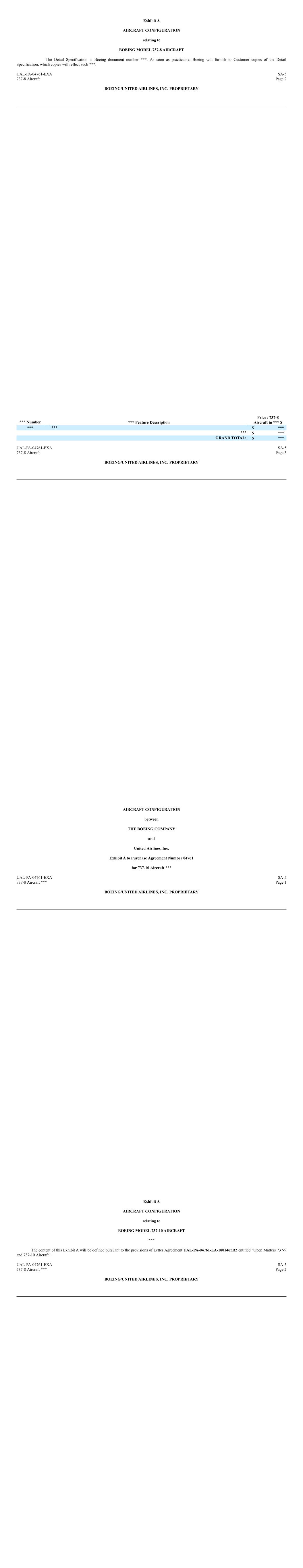 Exhibit A AIRCRAFT CONFIGURATION relating to BOEING MODEL 737-8 AIRCRAFT The Detail Specification is Boeing document number ***. As soon as practicable, Boeing will furnish to Customer copies of the Detail Specification, which copies will reflect such ***. UAL-PA-04761-EXA 737-8 Aircraft SA-5 Page 2 BOEING/UNITED AIRLINES, INC. PROPRIETARY *** Number *** Feature Description Price / 737-8 Aircraft in *** $ *** *** $ *** *** $ *** GRAND TOTAL: $ *** UAL-PA-04761-EXA 737-8 Aircraft SA-5 Page 3 BOEING/UNITED AIRLINES, INC. PROPRIETARY AIRCRAFT CONFIGURATION between THE BOEING COMPANY and United Airlines, Inc. Exhibit A to Purchase Agreement Number 04761 for 737-10 Aircraft *** UAL-PA-04761-EXA 737-8 Aircraft *** SA-5 Page 1 BOEING/UNITED AIRLINES, INC. PROPRIETARY Exhibit A AIRCRAFT CONFIGURATION relating to BOEING MODEL 737-10 AIRCRAFT *** The content of this Exhibit A will be defined pursuant to the provisions of Letter Agreement UAL-PA-04761-LA-1801465R2 entitled “Open Matters 737-9 and 737-10 Aircraft”. UAL-PA-04761-EXA 737-8 Aircraft *** SA-5 Page 2 BOEING/UNITED AIRLINES, INC. PROPRIETARY