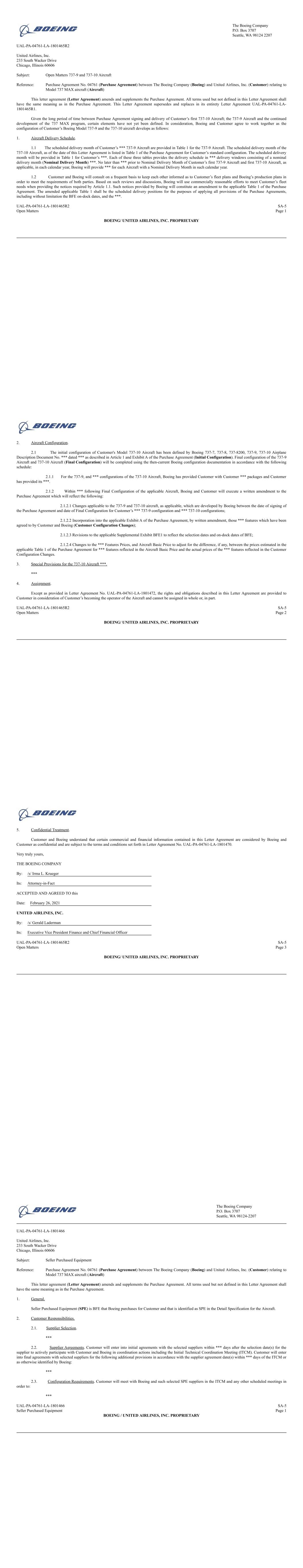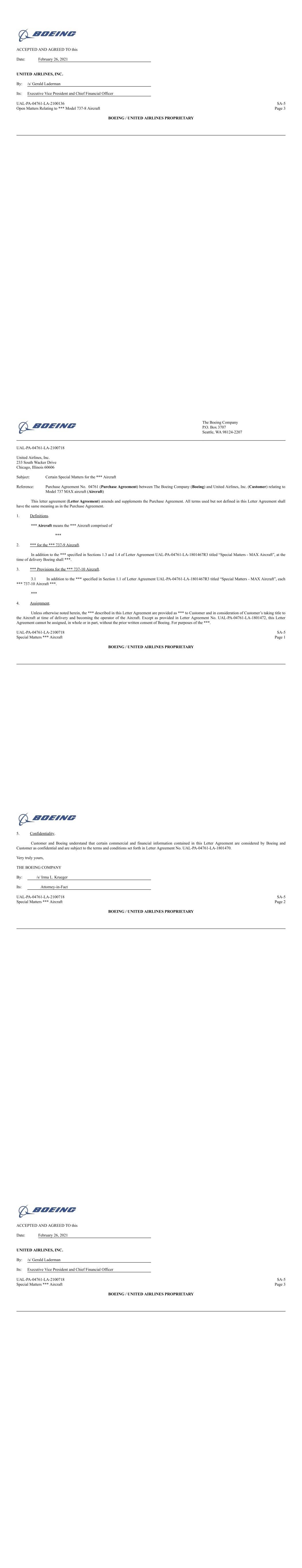 ACCEPTED AND AGREED TO this Date: February 26, 2021 UNITED AIRLINES, INC. By: /s/ Gerald Laderman Its: Executive Vice President and Chief Financial Officer UAL-PA-04761-LA-2100136 SA-5 Open Matters Relating to *** Model 737-8 Aircraft Page 3 BOEING / UNITED AIRLINES PROPRIETARY The Boeing Company P.O. Box 3707 Seattle, WA 98124-2207 UAL-PA-04761-LA-2100718 United Airlines, Inc. 233 South Wacker Drive Chicago, Illinois 60606 Subject: Certain Special Matters for the *** Aircraft Reference: Purchase Agreement No. 04761 (Purchase Agreement) between The Boeing Company (Boeing) and United Airlines, Inc. (Customer) relating to Model 737 MAX aircraft (Aircraft) This letter agreement (Letter Agreement) amends and supplements the Purchase Agreement. All terms used but not defined in this Letter Agreement shall have the same meaning as in the Purchase Agreement. 1. Definitions. *** Aircraft means the *** Aircraft comprised of *** 2. *** for the *** 737-9 Aircraft. In addition to the *** specified in Sections 1.3 and 1.4 of Letter Agreement UAL-PA-04761-LA-1801467R3 titled “Special Matters - MAX Aircraft”, at the time of delivery Boeing shall ***. 3. *** Provisions for the *** 737-10 Aircraft. 3.1 In addition to the *** specified in Section 1.1 of Letter Agreement UAL-PA-04761-LA-1801467R3 titled “Special Matters - MAX Aircraft”, each *** 737-10 Aircraft ***. *** 4. Assignment. Unless otherwise noted herein, the *** described in this Letter Agreement are provided as *** to Customer and in consideration of Customer’s taking title to the Aircraft at time of delivery and becoming the operator of the Aircraft. Except as provided in Letter Agreement No. UAL-PA-04761-LA-1801472, this Letter Agreement cannot be assigned, in whole or in part, without the prior written consent of Boeing. For purposes of the ***. UAL-PA-04761-LA-2100718 SA-5 Special Matters *** Aircraft Page 1 BOEING / UNITED AIRLINES PROPRIETARY 5. Confidentiality. Customer and Boeing understand that certain commercial and financial information contained in this Letter Agreement are considered by Boeing and Customer as confidential and are subject to the terms and conditions set forth in Letter Agreement No. UAL-PA-04761-LA-1801470. Very truly yours, THE BOEING COMPANY By: /s/ Irma L. Krueger Its: Attorney-in-Fact UAL-PA-04761-LA-2100718 SA-5 Special Matters *** Aircraft Page 2 BOEING / UNITED AIRLINES PROPRIETARY ACCEPTED AND AGREED TO this Date: February 26, 2021 UNITED AIRLINES, INC. By: /s/ Gerald Laderman Its: Executive Vice President and Chief Financial Officer UAL-PA-04761-LA-2100718 SA-5 Special Matters *** Aircraft Page 3 BOEING / UNITED AIRLINES PROPRIETARY
