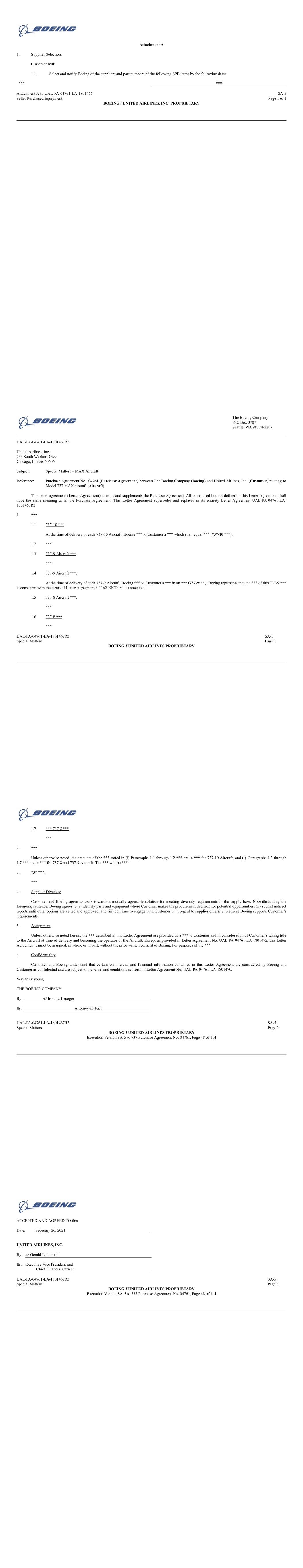 Attachment A 1. Supplier Selection. Customer will: 1.1. Select and notify Boeing of the suppliers and part numbers of the following SPE items by the following dates: *** *** Attachment A to UAL-PA-04761-LA-1801466 SA-5 Seller Purchased Equipment Page 1 of 1 BOEING / UNITED AIRLINES, INC. PROPRIETARY The Boeing Company P.O. Box 3707 Seattle, WA 98124-2207 UAL-PA-04761-LA-1801467R3 United Airlines, Inc. 233 South Wacker Drive Chicago, Illinois 60606 Subject: Special Matters – MAX Aircraft Reference: Purchase Agreement No. 04761 (Purchase Agreement) between The Boeing Company (Boeing) and United Airlines, Inc. (Customer) relating to Model 737 MAX aircraft (Aircraft) This letter agreement (Letter Agreement) amends and supplements the Purchase Agreement. All terms used but not defined in this Letter Agreement shall have the same meaning as in the Purchase Agreement. This Letter Agreement supersedes and replaces in its entirety Letter Agreement UAL-PA-04761-LA- 1801467R2. 1. *** 1.1 737-10 ***. At the time of delivery of each 737-10 Aircraft, Boeing *** to Customer a *** which shall equal *** (737-10 ***). 1.2 *** 1.3 737-9 Aircraft ***. *** 1.4 737-9 Aircraft ***. At the time of delivery of each 737-9 Aircraft, Boeing *** to Customer a *** in an *** (737-9***). Boeing represents that the *** of this 737-9 *** is consistent with the terms of Letter Agreement 6-1162-KKT-080, as amended. 1.5 737-8 Aircraft ***. *** 1.6 737-8 ***. *** UAL-PA-04761-LA-1801467R3 SA-5 Special Matters Page 1 BOEING I UNITED AIRLINES PROPRIETARY 1.7 *** 737-8 ***. *** 2. *** Unless otherwise noted, the amounts of the *** stated in (i) Paragraphs 1.1 through 1.2 *** are in *** for 737-10 Aircraft; and (i) Paragraphs 1.3 through 1.7 *** are in *** for 737-8 and 737-9 Aircraft. The *** will be *** 3. 737 ***. *** 4. Supplier Diversity. Customer and Boeing agree to work towards a mutually agreeable solution for meeting diversity requirements in the supply base. Notwithstanding the foregoing sentence, Boeing agrees to (i) identify parts and equipment where Customer makes the procurement decision for potential opportunities; (ii) submit indirect reports until other options are vetted and approved; and (iii) continue to engage with Customer with regard to supplier diversity to ensure Boeing supports Customer’s requirements. 5. Assignment. Unless otherwise noted herein, the *** described in this Letter Agreement are provided as a *** to Customer and in consideration of Customer’s taking title to the Aircraft at time of delivery and becoming the operator of the Aircraft. Except as provided in Letter Agreement No. UAL-PA-04761-LA-1801472, this Letter Agreement cannot be assigned, in whole or in part, without the prior written consent of Boeing. For purposes of the ***. 6. Confidentiality Customer and Boeing understand that certain commercial and financial information contained in this Letter Agreement are considered by Boeing and Customer as confidential and are subject to the terms and conditions set forth in Letter Agreement No. UAL-PA-04761-LA-1801470. Very truly yours, THE BOEING COMPANY By: /s/ Irma L. Krueger Its: Attorney-in-Fact UAL-PA-04761-LA-1801467R3 SA-5 Special Matters Page 2 BOEING I UNITED AIRLINES PROPRIETARY Execution Version SA-5 to 737 Purchase Agreement No. 04761, Page 48 of 114 ACCEPTED AND AGREED TO this Date: February 26, 2021 UNITED AIRLINES, INC. By: /s/ Gerald Laderman Its: Executive Vice President and Chief Financial Officer UAL-PA-04761-LA-1801467R3 SA-5 Special Matters Page 3 BOEING I UNITED AIRLINES PROPRIETARY Execution Version SA-5 to 737 Purchase Agreement No. 04761, Page 48 of 114