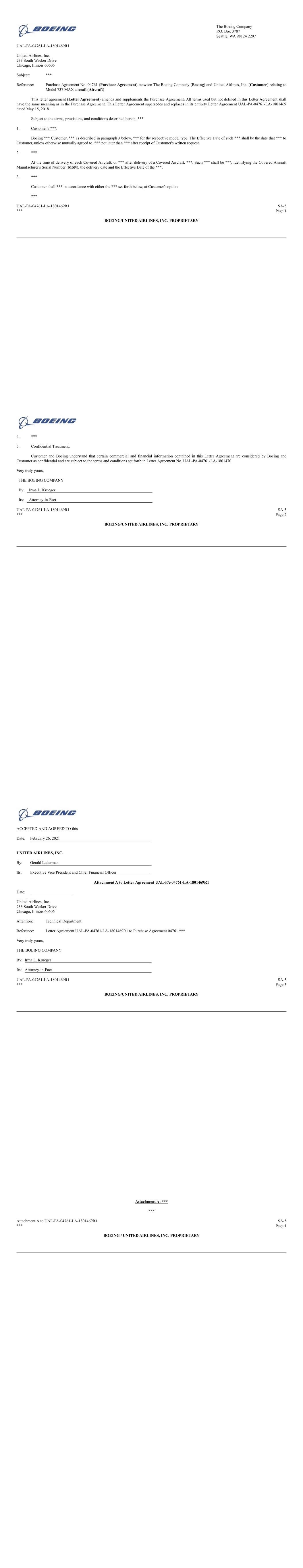 The Boeing Company P.O. Box 3707 Seattle, WA 98124 2207 UAL-PA-04761-LA-1801469R1 United Airlines, Inc. 233 South Wacker Drive Chicago, Illinois 60606 Subject: *** Reference: Purchase Agreement No. 04761 (Purchase Agreement) between The Boeing Company (Boeing) and United Airlines, Inc. (Customer) relating to Model 737 MAX aircraft (Aircraft) This letter agreement (Letter Agreement) amends and supplements the Purchase Agreement. All terms used but not defined in this Letter Agreement shall have the same meaning as in the Purchase Agreement. This Letter Agreement supersedes and replaces in its entirety Letter Agreement UAL-PA-04761-LA-1801469 dated May 15, 2018. Subject to the terms, provisions, and conditions described herein, *** 1. Customer's ***. Boeing *** Customer, *** as described in paragraph 3 below, *** for the respective model type. The Effective Date of such *** shall be the date that *** to Customer, unless otherwise mutually agreed to. *** not later than *** after receipt of Customer's written request. 2. *** At the time of delivery of each Covered Aircraft, or *** after delivery of a Covered Aircraft, ***. Such *** shall be ***, identifying the Covered Aircraft Manufacturer's Serial Number (MSN), the delivery date and the Effective Date of the ***. 3. *** Customer shall *** in accordance with either the *** set forth below, at Customer's option. *** UAL-PA-04761-LA-1801469R1 SA-5 *** Page 1 BOEING/UNITED AIRLINES, INC. PROPRIETARY 4. *** 5. Confidential Treatment. Customer and Boeing understand that certain commercial and financial information contained in this Letter Agreement are considered by Boeing and Customer as confidential and are subject to the terms and conditions set forth in Letter Agreement No. UAL-PA-04761-LA-1801470. Very truly yours, THE BOEING COMPANY By: Irma L. Krueger Its: Attorney-in-Fact UAL-PA-04761-LA-1801469R1 SA-5 *** Page 2 BOEING/UNITED AIRLINES, INC. PROPRIETARY ACCEPTED AND AGREED TO this Date: February 26, 2021 UNITED AIRLINES, INC. By: Gerald Laderman Its: Executive Vice President and Chief Financial Officer Attachment A to Letter Agreement UAL-PA-04761-LA-1801469R1 Date: ____________________ United Airlines, Inc. 233 South Wacker Drive Chicago, Illinois 60606 Attention: Technical Department Reference: Letter Agreement UAL-PA-04761-LA-1801469R1 to Purchase Agreement 04761 *** Very truly yours, THE BOEING COMPANY By: Irma L. Krueger Its: Attorney-in-Fact UAL-PA-04761-LA-1801469R1 SA-5 *** Page 3 BOEING/UNITED AIRLINES, INC. PROPRIETARY Attachment A: *** *** Attachment A to UAL-PA-04761-LA-1801469R1 SA-5 *** Page 1 BOEING / UNITED AIRLINES, INC. PROPRIETARY