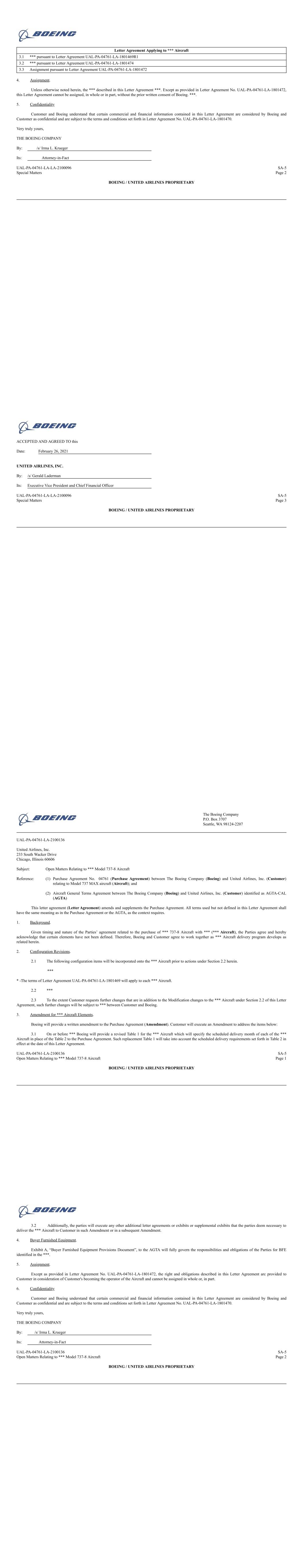 Letter Agreement Applying to *** Aircraft 3.1 *** pursuant to Letter Agreement UAL-PA-04761-LA-1801469R1 3.2 *** pursuant to Letter Agreement UAL-PA-04761-LA-1801474 3.3 Assignment pursuant to Letter Agreement UAL-PA-04761-LA-1801472 4. Assignment. Unless otherwise noted herein, the *** described in this Letter Agreement ***. Except as provided in Letter Agreement No. UAL-PA-04761-LA-1801472, this Letter Agreement cannot be assigned, in whole or in part, without the prior written consent of Boeing. ***. 5. Confidentiality Customer and Boeing understand that certain commercial and financial information contained in this Letter Agreement are considered by Boeing and Customer as confidential and are subject to the terms and conditions set forth in Letter Agreement No. UAL-PA-04761-LA-1801470. Very truly yours, THE BOEING COMPANY By: /s/ Irma L. Krueger Its: Attorney-in-Fact UAL-PA-04761-LA-LA-2100096 SA-5 Special Matters Page 2 BOEING / UNITED AIRLINES PROPRIETARY ACCEPTED AND AGREED TO this Date: February 26, 2021 UNITED AIRLINES, INC. By: /s/ Gerald Laderman Its: Executive Vice President and Chief Financial Officer UAL-PA-04761-LA-LA-2100096 SA-5 Special Matters Page 3 BOEING / UNITED AIRLINES PROPRIETARY The Boeing Company P.O. Box 3707 Seattle, WA 98124-2207 UAL-PA-04761-LA-2100136 United Airlines, Inc. 233 South Wacker Drive Chicago, Illinois 60606 Subject: Open Matters Relating to *** Model 737-8 Aircraft Reference: (1) Purchase Agreement No. 04761 (Purchase Agreement) between The Boeing Company (Boeing) and United Airlines, Inc. (Customer) relating to Model 737 MAX aircraft (Aircraft); and (2) Aircraft General Terms Agreement between The Boeing Company (Boeing) and United Airlines, Inc. (Customer) identified as AGTA-CAL (AGTA) This letter agreement (Letter Agreement) amends and supplements the Purchase Agreement. All terms used but not defined in this Letter Agreement shall have the same meaning as in the Purchase Agreement or the AGTA, as the context requires. 1. Background. Given timing and nature of the Parties’ agreement related to the purchase of *** 737-8 Aircraft with *** (*** Aircraft), the Parties agree and hereby acknowledge that certain elements have not been defined. Therefore, Boeing and Customer agree to work together as *** Aircraft delivery program develops as related herein. 2. Configuration Revisions. 2.1 The following configuration items will be incorporated onto the *** Aircraft prior to actions under Section 2.2 herein. *** * -The terms of Letter Agreement UAL-PA-04761-LA-1801469 will apply to each *** Aircraft. 2.2 *** 2.3 To the extent Customer requests further changes that are in addition to the Modification changes to the *** Aircraft under Section 2.2 of this Letter Agreement, such further changes will be subject to *** between Customer and Boeing. 3. Amendment for *** Aircraft Elements. Boeing will provide a written amendment to the Purchase Agreement (Amendment). Customer will execute an Amendment to address the items below: 3.1 On or before *** Boeing will provide a revised Table 1 for the *** Aircraft which will specify the scheduled delivery month of each of the *** Aircraft in place of the Table 2 to the Purchase Agreement. Such replacement Table 1 will take into account the scheduled delivery requirements set forth in Table 2 in effect at the date of this Letter Agreement. UAL-PA-04761-LA-2100136 SA-5 Open Matters Relating to *** Model 737-8 Aircraft Page 1 BOEING / UNITED AIRLINES PROPRIETARY 3.2 Additionally, the parties will execute any other additional letter agreements or exhibits or supplemental exhibits that the parties deem necessary to deliver the *** Aircraft to Customer in such Amendment or in a subsequent Amendment. 4. Buyer Furnished Equipment. Exhibit A, “Buyer Furnished Equipment Provisions Document”, to the AGTA will fully govern the responsibilities and obligations of the Parties for BFE identified in the ***. 5. Assignment. Except as provided in Letter Agreement No. UAL-PA-04761-LA-1801472, the right and obligations described in this Letter Agreement arc provided to Customer in consideration of Customer's becoming the operator of the Aircraft and cannot be assigned in whole or, in part. 6. Confidentiality Customer and Boeing understand that certain commercial and financial information contained in this Letter Agreement are considered by Boeing and Customer as confidential and are subject to the terms and conditions set forth in Letter Agreement No. UAL-PA-04761-LA-1801470. Very truly yours, THE BOEING COMPANY By: /s/ Irma L. Krueger Its: Attorney-in-Fact UAL-PA-04761-LA-2100136 SA-5 Open Matters Relating to *** Model 737-8 Aircraft Page 2 BOEING / UNITED AIRLINES PROPRIETARY
