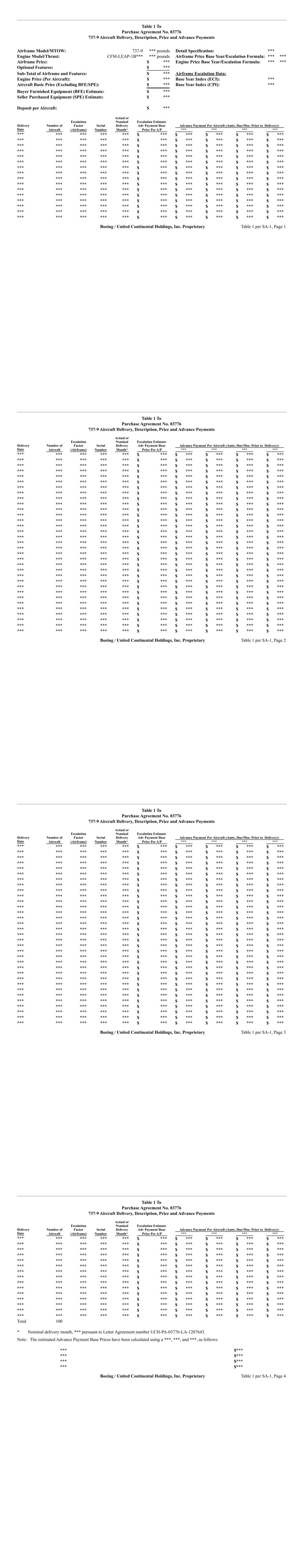 Exhibit 10.4 CERTAIN IDENTIFIED INFORMATION HAS BEEN EXCLUDED FROM THE EXHIBIT BECAUSE IT IS BOTH NOT MATERIAL AND IS THE TYPE THAT THE REGISTRANT TREATS AS PRIVATE OR CONFIDENTIAL. OMITTED INFORMATION HAS BEEN REPLACED WITH ASTERISKS. Supplemental Agreement No. 1 to Purchase Agreement No. 03776 between The Boeing Company and United Continental Holdings, Inc. Relating to Boeing Model 737-9 Aircraft THIS SUPPLEMENTAL AGREEMENT, entered into as of June 17, 2013, by and between THE BOEING COMPANY (Boeing) and UNITED CONTINENTAL HOLDINGS, INC. (Customer); WHEREAS, the parties hereto entered into Purchase Agreement No. 03776 dated July 12, 2012, as amended and supplemented (the Purchase Agreement), relating to the purchase and sale of Boeing Model 737-9 aircraft (Aircraft). This Supplemental Agreement is an amendment to the Purchase Agreement; WHEREAS, Boeing and Customer have agreed to *** Aircraft *** scheduled for delivery from *** through *** (MAX *** Aircraft); WHEREAS, Boeing and Customer agree that 787-10 Model aircraft program launch requires approval from the Boeing Board of Directors, pursuant to Letter Agreement as detailed in Letter Agreement UAL-PA-03860-LA-1301380. WHEREAS, Boeing and Customer agree that the MAX *** Aircraft will be ***; NOW THEREFORE, in consideration of the mutual covenants herein contained, the parties agree to amend the Purchase Agreement as follows: 1. Table of Contents and Tables: 1.1 Remove and replace, in its entirety, the “Table of Contents,” with the “Table of Contents” attached hereto, to reflect the changes made by this Supplemental Agreement No. 1. UCH-PA-03776 SA-1, Page 1 BOEING/UNITED CONTINENTAL HOLDINGS, INC. PROPRIETARY � � � � !" # $% ! &� %' ! ( )*+,-.-*+/01232,2+.4$"5%% ! &�6% ! &789:;! < =(>+-.2,4 !?@8@ (>AB0C13DE/2AF122G2+.4;! <H"5%% ! &86% ! &I8I()AB0C13DE/2AF122G2+.4;! < !;!?@8@ ;! <H"5%% ! &�6% ! H< J6 ! %5 %%% K ! ! % !L"M"J<"#=&#<6N=J" OPQRSQTUV)SW0AUX >UTOQY)SUOTUQUOABPSBYTUVZ[TU)\]]] ̂̂_ N ! % ! % ̀ a6 b̀ % <Jc6:7@@9 �6 ! RSQTUVd>UTOQY)SUOTUQUOABPSBYTUVZ[TU)\0eS0eTQOAeX � � � � !!"#$ % "&'(! ) * + *, - !! .,# � /0102345360724/65�289:;<=<>? >@AB� CD CE F C"&GH,#!G#$ #I# JJ �AB� K K# !L#,MC,!N$ O# FOK FOKPI# D' D# ,'$$ PI# KK KEQRRR 'S* '&SC* D ,$ # ��T � UDVW*WX)YYZWSW%XYZ)Y [[[ 24:0\ UDVW*WX)YYZWSW%XYZ)] RRR UDVW*WX)YYZWSW%XYZ+X ", # OE(Q& UDVW*WX)YYZWSW%XYZ+) N$# UDVW*WX)YYZWSW%XYZ++ N$ C UDVW*WX)YYZWSW%XYZ+Z * , '$$ UDVW*WX)YYZWSW%XYZ+Y '*(#!KH$, UDVW*WX)YYZWSW%XYZ+̂ '$*#_* &# E UDVW*WX)YYZWSW%XYZ-X '$# UDVW*WX)YYZWSW%X]X-- RRR UDVW*WX)YYZWSW%X]%% RRR UDVW*WX)YYZWSW%X]%) RRR# UDVW*WX)YYZWSW%X]-Y RRR UDVW*WX)YYZ 'W*E C% .FSKNODǸ .K̀ .' Ta �b � �Bb Tc dJJ�e � � � � �� � !"##$% &'!('") *+,+-./.0120324+0.25+1-615.*7 !"##$% &'!(89$ :; 615.*7 !"##$% &'!('"( 77+/2<.25615.*7 !"##$% &'!(($9 =.-+,.*>???615.*7 % !"#($% &'!#($9 #"#*30@A5+32 0B@75<.257 CC � � �DDEFGEHIF JKJJJJJJJJJJJJJ LKMNOKP !"##$ Q &R1/.'34' ; S%TUVUW;TW;Q X � � �Y JCC �Z