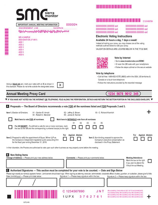 Only shareholders of record at the close of business on April 10, 2018 are entitled to vote at the Annual Meeting. If you attend the virtual Annual Meeting, you will be able to vote and submit questions during the meeting by following the instructions at http://www.meetingcenter.io/233228778 and using the password SRMC2018. The Annual Report on Form 10-K for the year ended December 31, 2017 was filed with the Securities Exchange Commission on April 2, 2018 and is available for review on the Sierra Monitor investor relations web site. This Notice and the Proxy Statement are first being mailed and made available to shareholders on or about April 16, 2018. Whether or not you plan to attend the virtual Annual Meeting, please vote at //www.investorvote.com/SRMC or by phone by calling toll free 1-800-652-VOTE (8683) within the USA, US territories & Canada on a touch tone telephone or complete, sign, date and return the accompanying proxy card in the enclosed postage-paid envelope. The Proxy Statement describes the proxy voting in more detail.