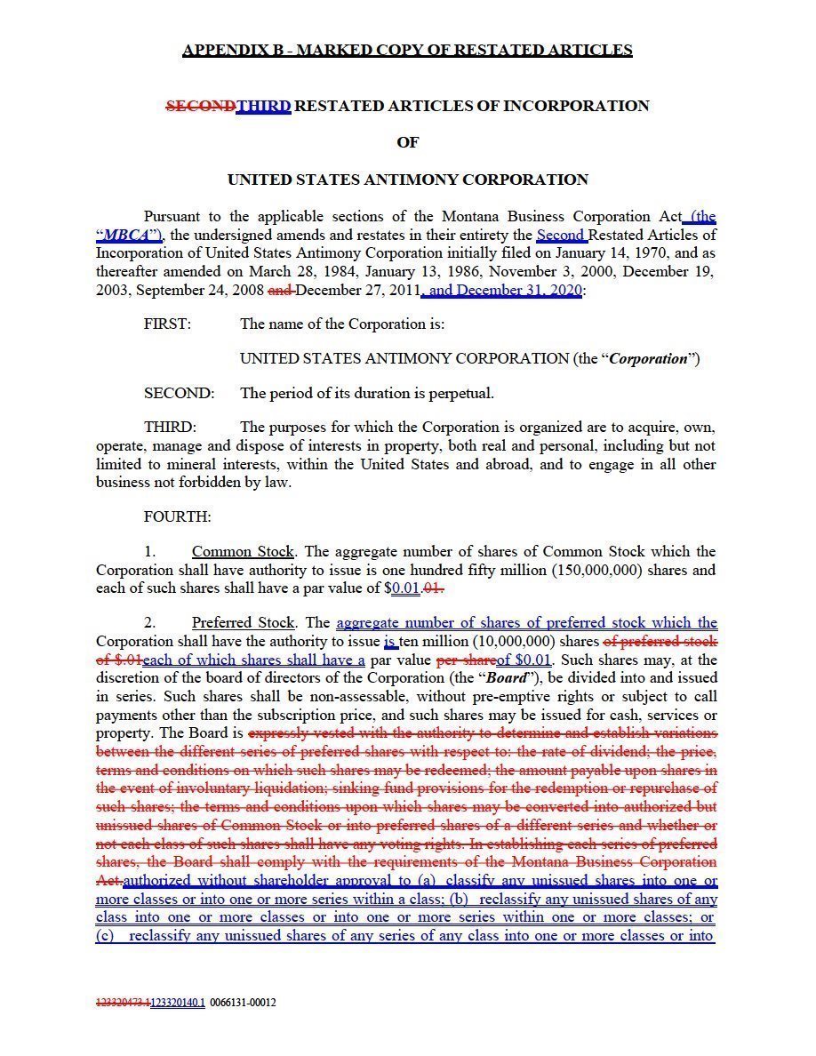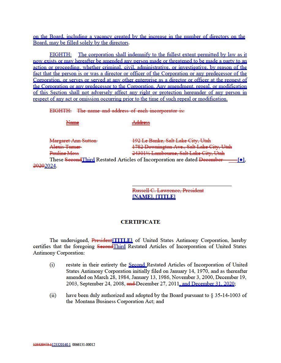 | (i) | restate in their entirety the Second Restated Articles of Incorporation of United States Antimony Corporation initially filed on January 14, 1970, and as thereafter amended on March 28, 1984, January 13, 1986, November 3, 2000, December 19, 2003, September 24, 2008, December 27, 2011, and December 31, 2020; |