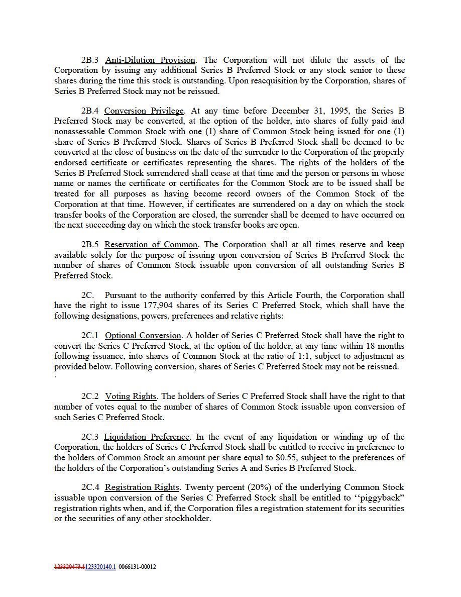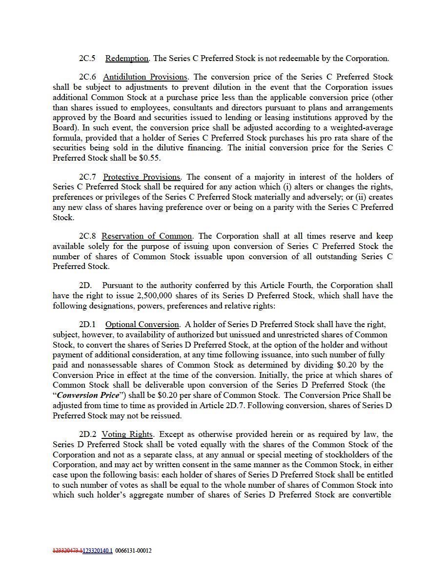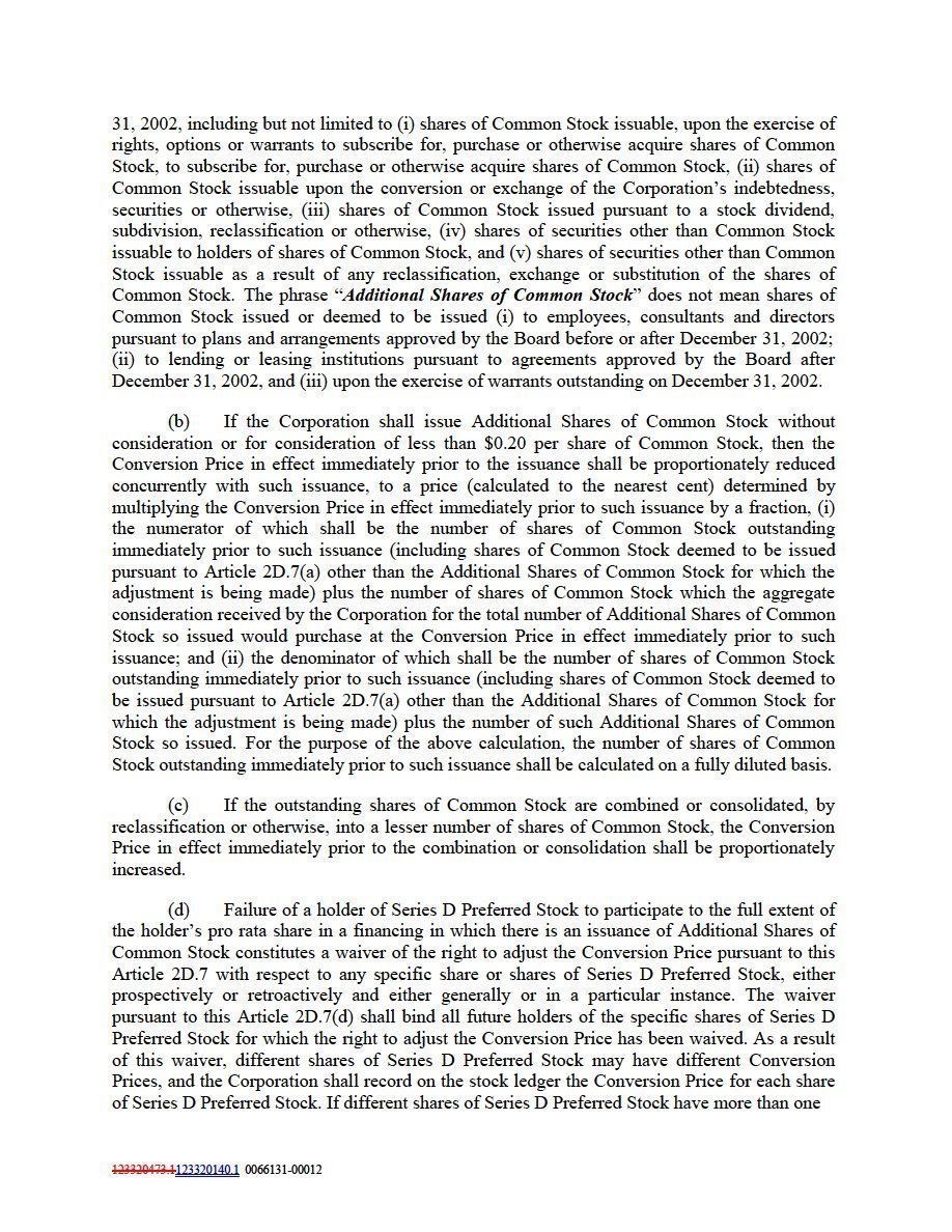 (a) The Conversion Price set forth in Article 2D.1 shall be adjusted if (i) the Corporation issues or is deemed to issue Additional Shares of Common Stock at a price less than $0.20 per share of Common Stock and (ii) the holder of the Series D Preferred Stock participates to the full extent of the holder’s pro rata share in the financing in which there is an issuance of Additional Shares of Common Stock. The phrase “Additional Shares of Common Stock” means all shares of Common Stock issued or deemed to be issued by the Corporation after December 31, 2002, including but not limited to (i) shares of Common Stock issuable, upon the exercise of rights, options or warrants to subscribe for, purchase or otherwise acquire shares of Common Stock, to subscribe for, purchase or otherwise acquire shares of Common Stock, (ii) shares of Common Stock issuable upon the conversion or exchange of the Corporation’s indebtedness, securities or otherwise, (iii) shares of Common Stock issued pursuant to a stock dividend, subdivision, reclassification or otherwise, (iv) shares of securities other than Common Stock issuable to holders of shares of Common Stock, and (v) shares of securities other than Common Stock issuable as a result of any reclassification, exchange or substitution of the shares of Common Stock. The phrase “Additional Shares of Common Stock” does not mean shares of Common Stock issued or deemed to be issued (i) to employees, consultants and directors pursuant to plans and arrangements approved by the Board before or after December 31, 2002; (ii) to lending or leasing institutions pursuant to agreements approved by the Board after December 31, 2002, and (iii) upon the exercise of warrants outstanding on December 31, 2002.