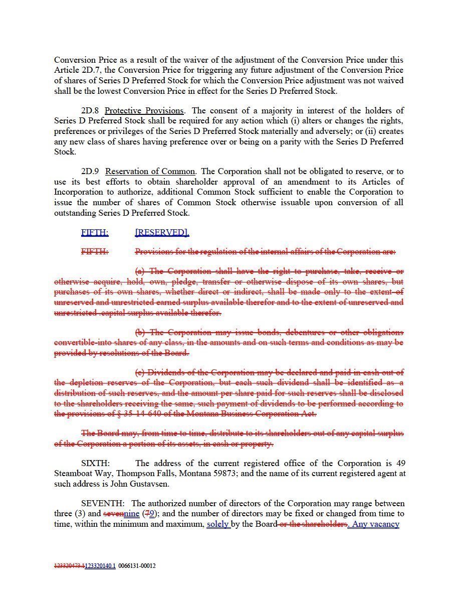 | 2. | To approve the amendment and restatement of our Second Amended and Restated Articles of Incorporation (the “Restated Articles”) to align with the Montana Business Corporation Act as currently constituted. |
