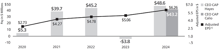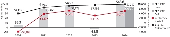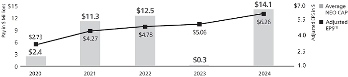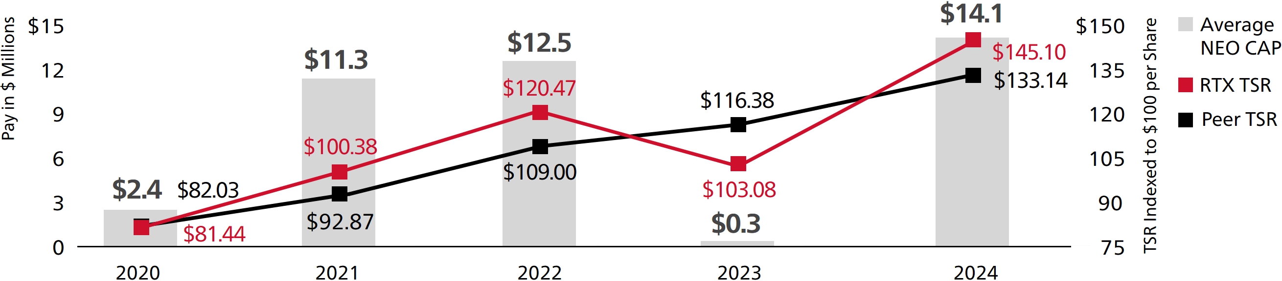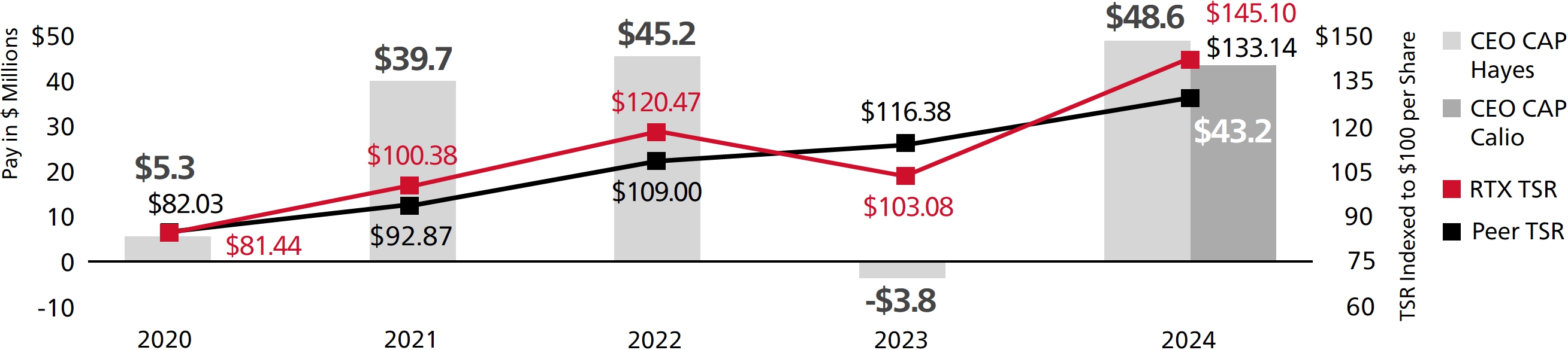 We continued to return value to our shareowners, completing the $10 billion accelerated share repurchase program we announced last year. The total capital we have returned to shareowners through dividends and share buybacks since the Merger(1)—over $33 billion—far surpasses our original goal of $20 billion by 2025 and positions us well to deliver toward the high end of our revised $36 to $37 billion goal. And we ended 2024 with a 41% total shareowner return (“TSR”)—ahead of both the S&P 500 Index and our Core Aerospace & Defense Peers (“Core A&D Peers”).(2)