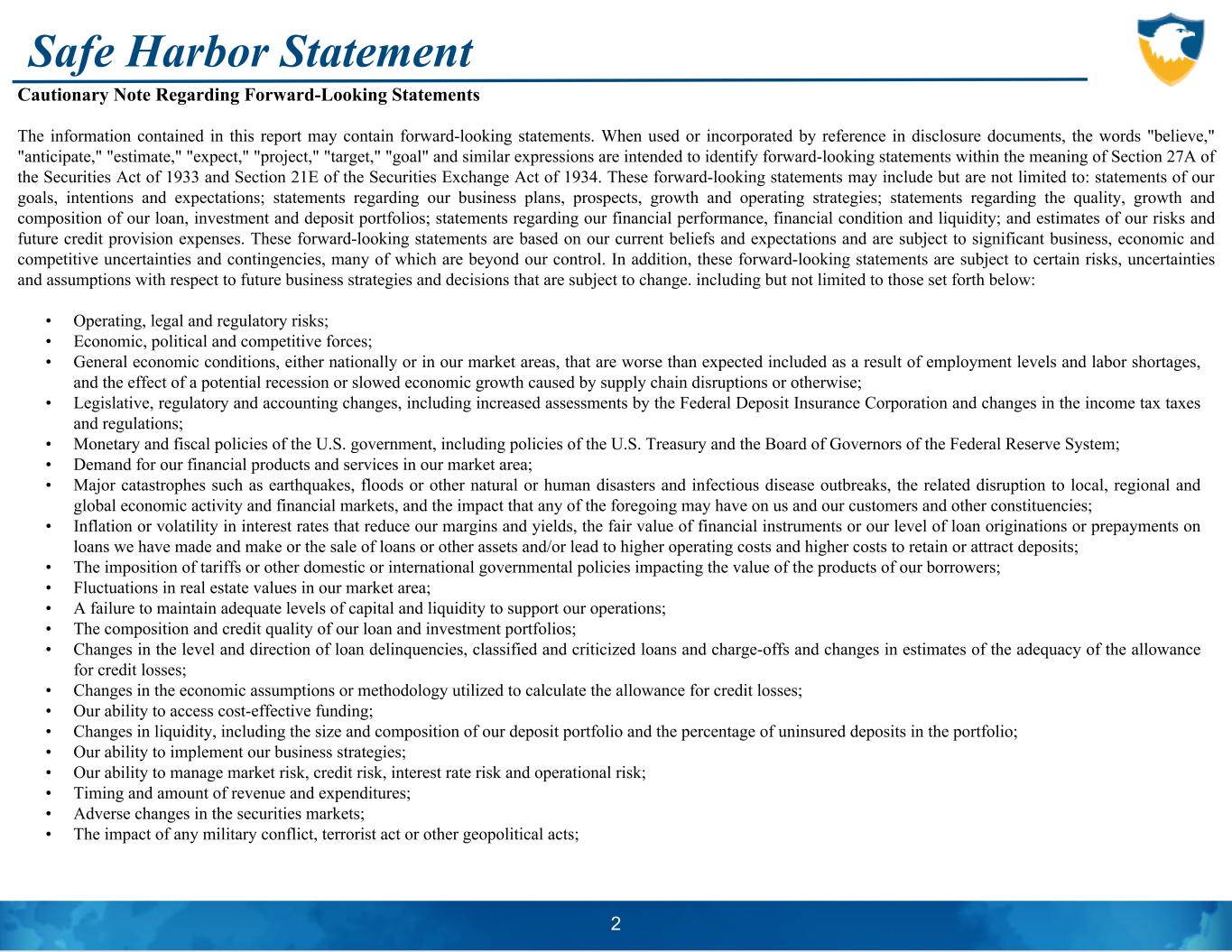 Safe Harbor Statement 2 Cautionary Note Regarding Forward-Looking Statements The information contained in this report may contain forward-looking statements. When used or incorporated by reference in disclosure documents, the words "believe," "anticipate," "estimate," "expect," "project," "target," "goal" and similar expressions are intended to identify forward-looking statements within the meaning of Section 27A of the Securities Act of 1933 and Section 21E of the Securities Exchange Act of 1934. These forward-looking statements may include but are not limited to: statements of our goals, intentions and expectations; statements regarding our business plans, prospects, growth and operating strategies; statements regarding the quality, growth and composition of our loan, investment and deposit portfolios; statements regarding our financial performance, financial condition and liquidity; and estimates of our risks and future credit provision expenses. These forward-looking statements are based on our current beliefs and expectations and are subject to significant business, economic and competitive uncertainties and contingencies, many of which are beyond our control. In addition, these forward-looking statements are subject to certain risks, uncertainties and assumptions with respect to future business strategies and decisions that are subject to change. including but not limited to those set forth below: • Operating, legal and regulatory risks; • Economic, political and competitive forces; • General economic conditions, either nationally or in our market areas, that are worse than expected included as a result of employment levels and labor shortages, and the effect of a potential recession or slowed economic growth caused by supply chain disruptions or otherwise; • Legislative, regulatory and accounting changes, including increased assessments by the Federal Deposit Insurance Corporation and changes in the income tax taxes and regulations; • Monetary and fiscal policies of the U.S. government, including policies of the U.S. Treasury and the Board of Governors of the Federal Reserve System; • Demand for our financial products and services in our market area; • Major catastrophes such as earthquakes, floods or other natural or human disasters and infectious disease outbreaks, the related disruption to local, regional and global economic activity and financial markets, and the impact that any of the foregoing may have on us and our customers and other constituencies; • Inflation or volatility in interest rates that reduce our margins and yields, the fair value of financial instruments or our level of loan originations or prepayments on loans we have made and make or the sale of loans or other assets and/or lead to higher operating costs and higher costs to retain or attract deposits; • The imposition of tariffs or other domestic or international governmental policies impacting the value of the products of our borrowers; • Fluctuations in real estate values in our market area; • A failure to maintain adequate levels of capital and liquidity to support our operations; • The composition and credit quality of our loan and investment portfolios; • Changes in the level and direction of loan delinquencies, classified and criticized loans and charge-offs and changes in estimates of the adequacy of the allowance for credit losses; • Changes in the economic assumptions or methodology utilized to calculate the allowance for credit losses; • Our ability to access cost-effective funding; • Changes in liquidity, including the size and composition of our deposit portfolio and the percentage of uninsured deposits in the portfolio; • Our ability to implement our business strategies; • Our ability to manage market risk, credit risk, interest rate risk and operational risk; • Timing and amount of revenue and expenditures; • Adverse changes in the securities markets; • The impact of any military conflict, terrorist act or other geopolitical acts;