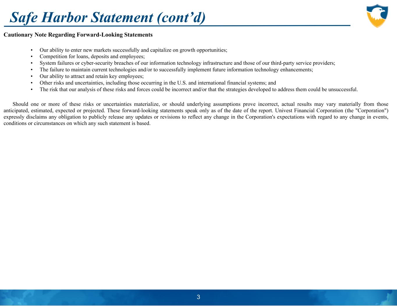 Safe Harbor Statement (cont’d) 3 Cautionary Note Regarding Forward-Looking Statements • Our ability to enter new markets successfully and capitalize on growth opportunities; • Competition for loans, deposits and employees; • System failures or cyber-security breaches of our information technology infrastructure and those of our third-party service providers; • The failure to maintain current technologies and/or to successfully implement future information technology enhancements; • Our ability to attract and retain key employees; • Other risks and uncertainties, including those occurring in the U.S. and international financial systems; and • The risk that our analysis of these risks and forces could be incorrect and/or that the strategies developed to address them could be unsuccessful. Should one or more of these risks or uncertainties materialize, or should underlying assumptions prove incorrect, actual results may vary materially from those anticipated, estimated, expected or projected. These forward-looking statements speak only as of the date of the report. Univest Financial Corporation (the "Corporation") expressly disclaims any obligation to publicly release any updates or revisions to reflect any change in the Corporation's expectations with regard to any change in events, conditions or circumstances on which any such statement is based.