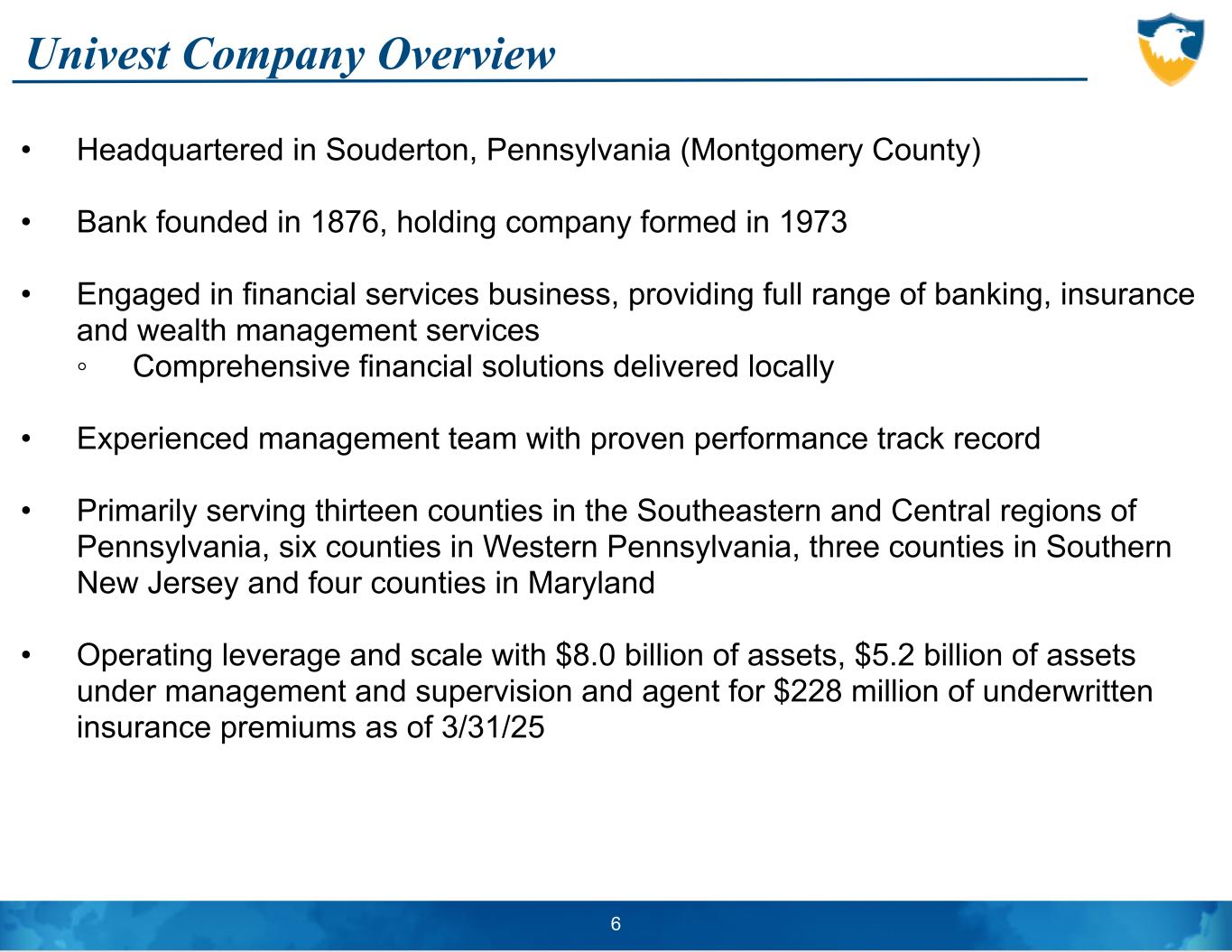 Univest Company Overview • Headquartered in Souderton, Pennsylvania (Montgomery County) • Bank founded in 1876, holding company formed in 1973 • Engaged in financial services business, providing full range of banking, insurance and wealth management services ◦ Comprehensive financial solutions delivered locally • Experienced management team with proven performance track record • Primarily serving thirteen counties in the Southeastern and Central regions of Pennsylvania, six counties in Western Pennsylvania, three counties in Southern New Jersey and four counties in Maryland • Operating leverage and scale with $8.0 billion of assets, $5.2 billion of assets under management and supervision and agent for $228 million of underwritten insurance premiums as of 3/31/25 6