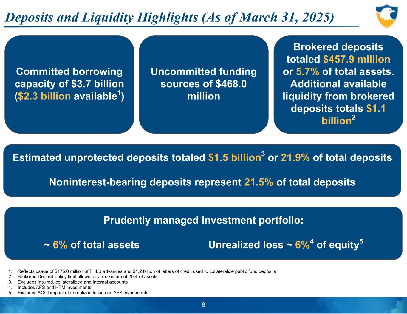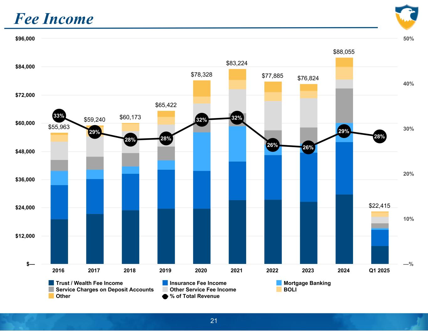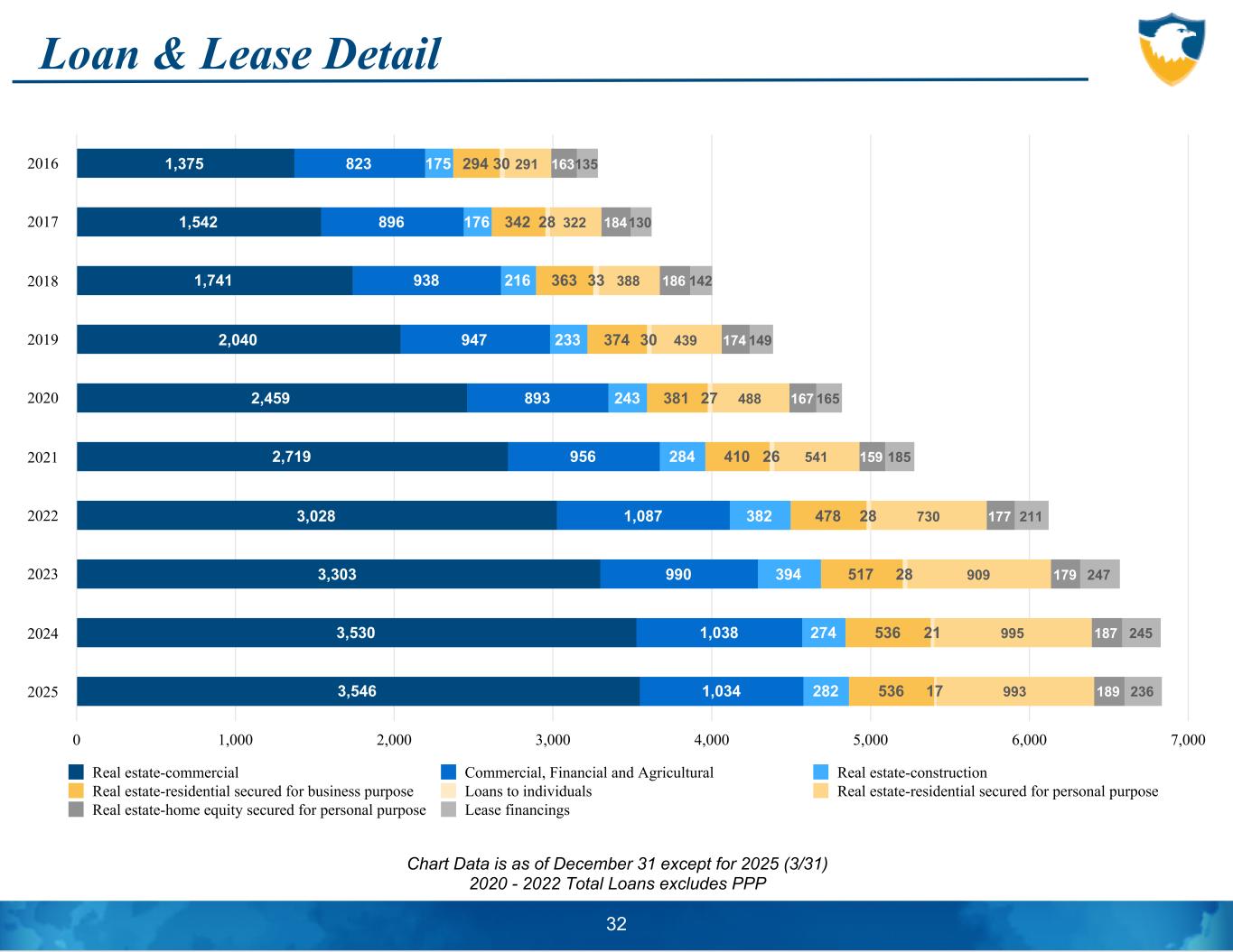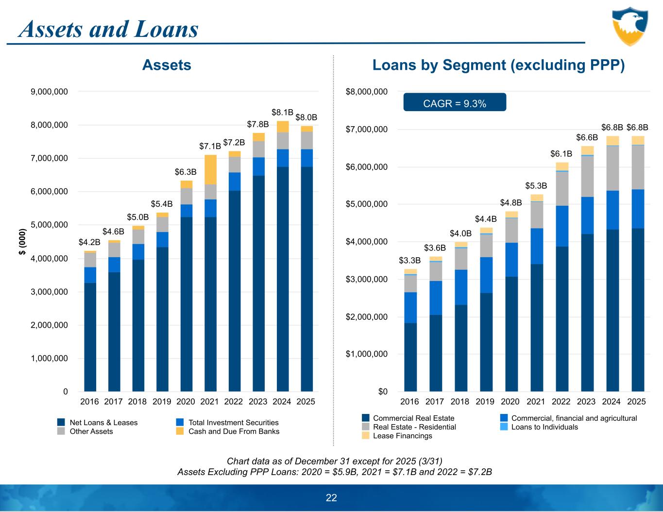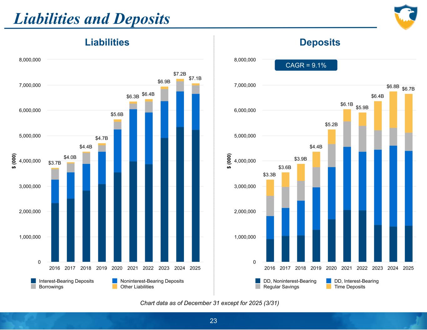 Liabilities and Deposits Chart data as of December 31 except for 2025 (3/31) $ (0 00 ) $3.7B $4.0B $4.4B $4.7B $5.6B $6.3B $6.4B $6.9B $7.2B $7.1B Interest-Bearing Deposits Noninterest-Bearing Deposits Borrowings Other Liabilities 2016 2017 2018 2019 2020 2021 2022 2023 2024 2025 0 1,000,000 2,000,000 3,000,000 4,000,000 5,000,000 6,000,000 7,000,000 8,000,000 $ (0 00 ) $3.3B $3.6B $3.9B $4.4B $5.2B $6.1B $5.9B $6.4B $6.8B $6.7B DD, Noninterest-Bearing DD, Interest-Bearing Regular Savings Time Deposits 2016 2017 2018 2019 2020 2021 2022 2023 2024 2025 0 1,000,000 2,000,000 3,000,000 4,000,000 5,000,000 6,000,000 7,000,000 8,000,000 23 CAGR = 9.1% Liabilities Deposits