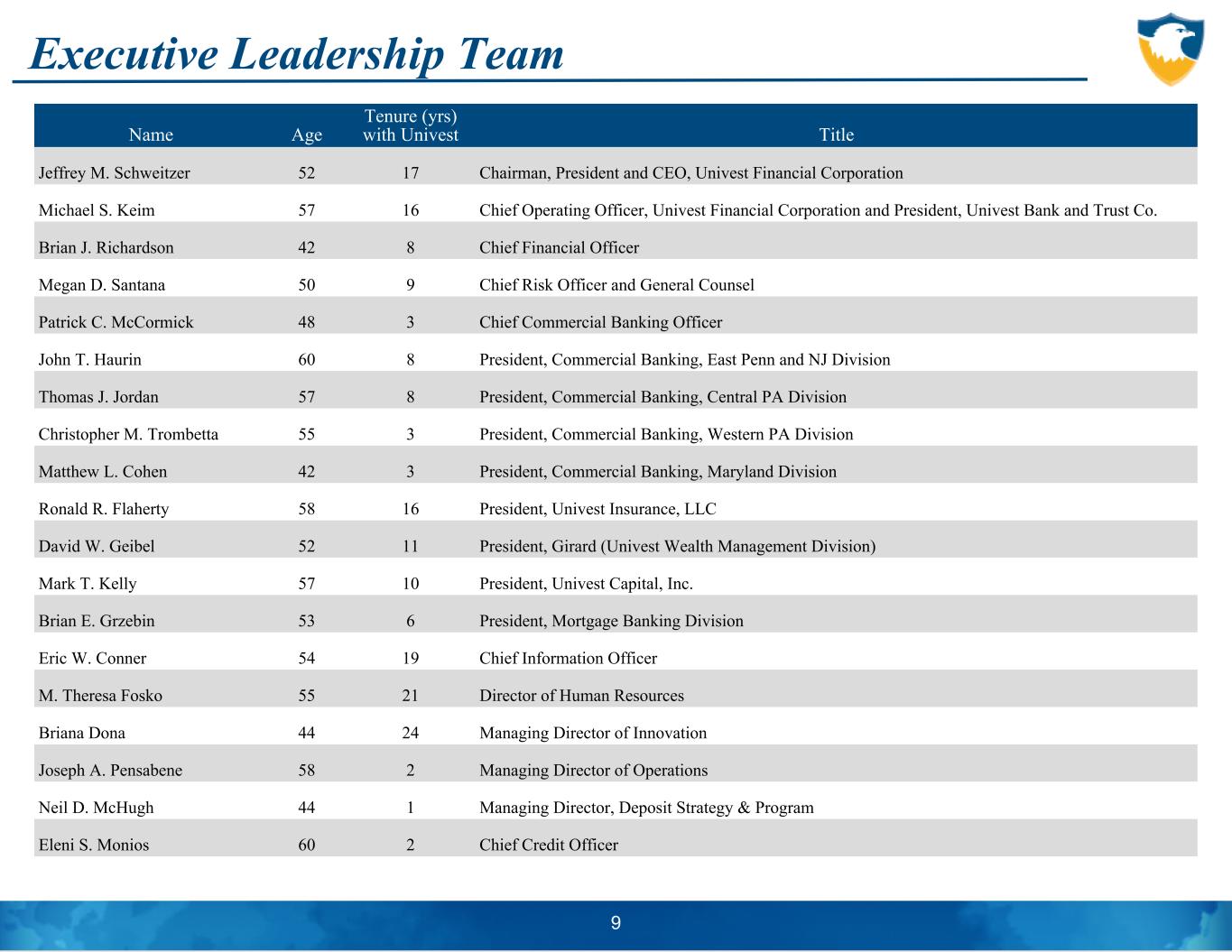 Executive Leadership Team 9 Name Age Tenure (yrs) with Univest Title Jeffrey M. Schweitzer 52 17 Chairman, President and CEO, Univest Financial Corporation Michael S. Keim 57 16 Chief Operating Officer, Univest Financial Corporation and President, Univest Bank and Trust Co. Brian J. Richardson 42 8 Chief Financial Officer Megan D. Santana 50 9 Chief Risk Officer and General Counsel Patrick C. McCormick 48 3 Chief Commercial Banking Officer John T. Haurin 60 8 President, Commercial Banking, East Penn and NJ Division Thomas J. Jordan 57 8 President, Commercial Banking, Central PA Division Christopher M. Trombetta 55 3 President, Commercial Banking, Western PA Division Matthew L. Cohen 42 3 President, Commercial Banking, Maryland Division Ronald R. Flaherty 58 16 President, Univest Insurance, LLC David W. Geibel 52 11 President, Girard (Univest Wealth Management Division) Mark T. Kelly 57 10 President, Univest Capital, Inc. Brian E. Grzebin 53 6 President, Mortgage Banking Division Eric W. Conner 54 19 Chief Information Officer M. Theresa Fosko 55 21 Director of Human Resources Briana Dona 44 24 Managing Director of Innovation Joseph A. Pensabene 58 2 Managing Director of Operations Neil D. McHugh 44 1 Managing Director, Deposit Strategy & Program Eleni S. Monios 60 2 Chief Credit Officer 9