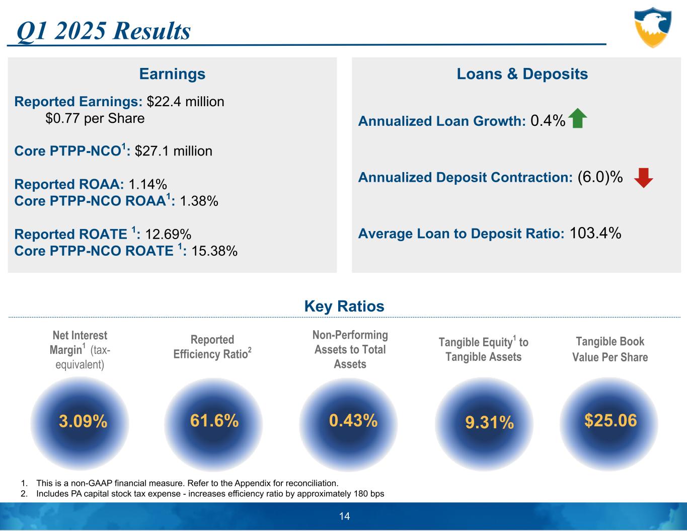 Attractive Investment Opportunity 12 1. This is a non-GAAP financial measure. Refer to the Appendix for reconciliation. 2. Based on price of $29.14 (represents average closing price 6/2/25-6/6/25). 3. Based on analyst average consensus of $2.91 EPS for 2026 (KBW projection of $2.90, Piper Sandler projection of $2.93 and Stephens projection of $2.90). 13.89% 15.38% 1.19% 1.38% 10.94% 12.27% Core PTPP-NCO ROATE Core PTPP-NCO ROAA Core PTPP-NCO ROAE 2024 Q1 2025 —% 10.00% 20.00% 30.00% Strong Earnings Performance1 Dividend Yield 3.02% (2) 10.0x Projected 2026 EPS (2)(3) Attractive Valuation Super-Community Bank Headquartered in attractive Southeastern Pennsylvania market Opportunity and ability to scale and obtain operating leverage Diversified lines of business and revenue streams (i.e. Noninterest Income represents ~25% - 30% of total revenue) 1.2x Tangible Book Value per Share (1)(2)