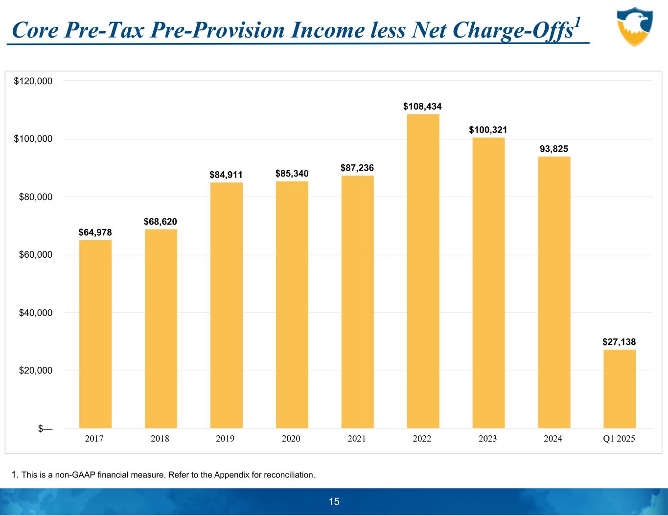 Q1 2025 Results 1. This is a non-GAAP financial measure. Refer to the Appendix for reconciliation. 2. Includes PA capital stock tax expense - increases efficiency ratio by approximately 180 bps 14 Earnings Loans & Deposits Key Ratios Reported Earnings: $22.4 million $0.77 per Share Core PTPP-NCO1: $27.1 million Reported ROAA: 1.14% Core PTPP-NCO ROAA1: 1.38% Reported ROATE 1: 12.69% Core PTPP-NCO ROATE 1: 15.38% Annualized Loan Growth: 0.4% Annualized Deposit Contraction: (6.0)% Average Loan to Deposit Ratio: 103.4% Net Interest Margin1 (tax- equivalent) Reported Efficiency Ratio2 Non-Performing Assets to Total Assets Tangible Equity1 to Tangible Assets Tangible Book Value Per Share 3.09% 61.6% 0.43% 9.31% $25.06