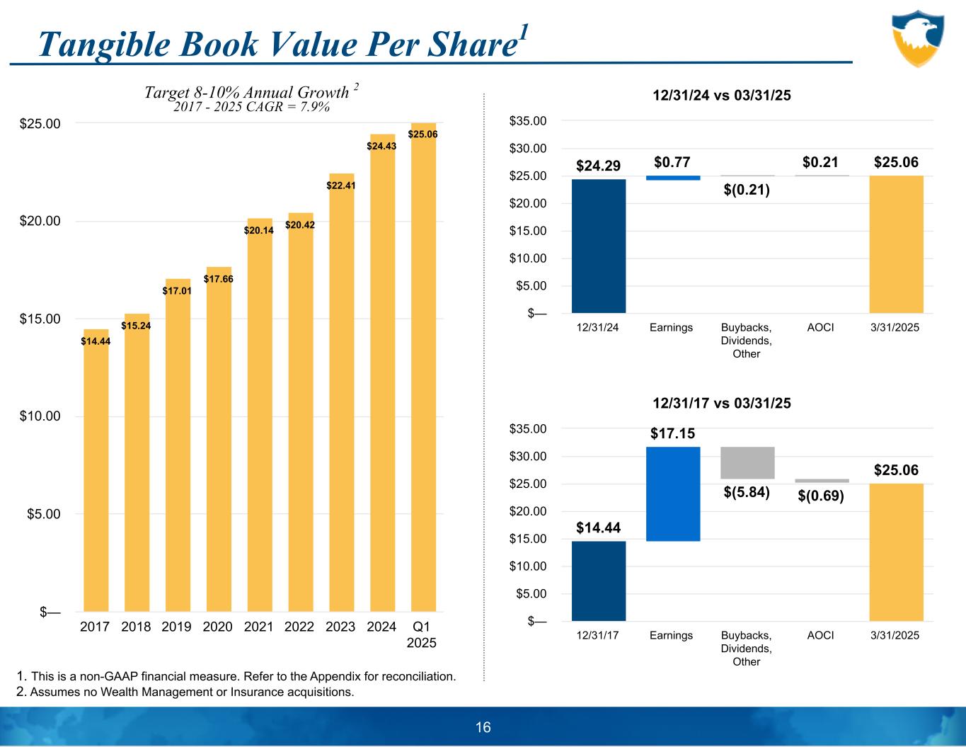 $64,978 $68,620 $84,911 $85,340 $87,236 $108,434 $100,321 93,825 $27,138 2017 2018 2019 2020 2021 2022 2023 2024 Q1 2025 $— $20,000 $40,000 $60,000 $80,000 $100,000 $120,000 Core Pre-Tax Pre-Provision Income less Net Charge-Offs1 1. This is a non-GAAP financial measure. Refer to the Appendix for reconciliation. 15