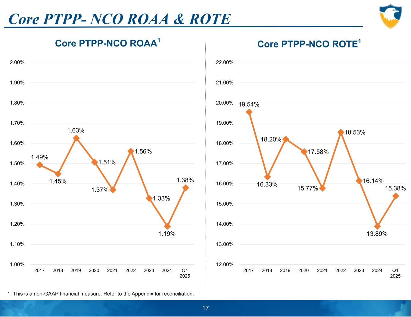 $14.44 $15.24 $17.01 $17.66 $20.14 $20.42 $22.41 $24.43 $25.06 2017 2018 2019 2020 2021 2022 2023 2024 Q1 2025 $— $5.00 $10.00 $15.00 $20.00 $25.00 Tangible Book Value Per Share1 1. This is a non-GAAP financial measure. Refer to the Appendix for reconciliation. 2. Assumes no Wealth Management or Insurance acquisitions. Target 8-10% Annual Growth 2 2017 - 2025 CAGR = 7.9% 16 12/31/24 vs 03/31/25 $24.29 $0.77 $(0.21) $0.21 $25.06 12/31/24 Earnings Buybacks, Dividends, Other AOCI 3/31/2025 $— $5.00 $10.00 $15.00 $20.00 $25.00 $30.00 $35.00 1 12/31/17 vs 03/31/25 $14.44 $17.15 $(5.84) $(0.69) $25.06 12/31/17 Earnings Buybacks, Dividends, Other AOCI 3/31/2025 $— $5.00 $10.00 $15.00 $20.00 $25.00 $30.00 $35.00