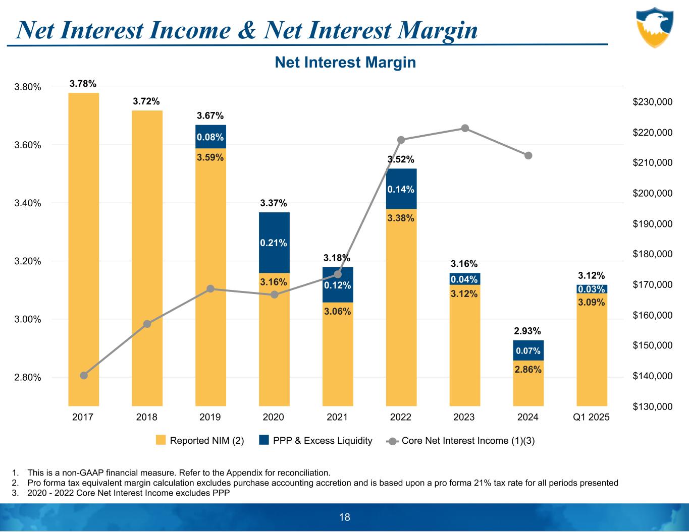 Core PTPP- NCO ROAA & ROTE 1. This is a non-GAAP financial measure. Refer to the Appendix for reconciliation. 1.49% 1.45% 1.63% 1.51% 1.37% 1.56% 1.33% 1.19% 1.38% 2017 2018 2019 2020 2021 2022 2023 2024 Q1 2025 1.00% 1.10% 1.20% 1.30% 1.40% 1.50% 1.60% 1.70% 1.80% 1.90% 2.00% 19.54% 16.33% 18.20% 17.58% 15.77% 18.53% 16.14% 13.89% 15.38% 2017 2018 2019 2020 2021 2022 2023 2024 Q1 2025 12.00% 13.00% 14.00% 15.00% 16.00% 17.00% 18.00% 19.00% 20.00% 21.00% 22.00% 17 Core PTPP-NCO ROAA1 Core PTPP-NCO ROTE1