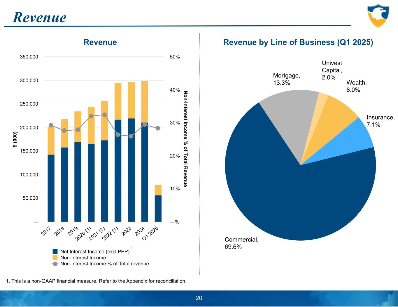 62.5% 61.9% 61.4% 60.6% 60.9% 62.4% 66.0% 65.7% 61.6% 60.8% 60.1% 60.2% 60.7% 63.2% 59.7% 62.0% 64.7% 60.8% Reported Efficiency Ratio (Noninterest Expense/Tax Equivalent Revenue) Efficiency Ratio (Core Noninterest Expense Excluding PA Shares Tax/Core Tax Equivalent Revenue) (1),(2) 2017 2018 2019 2020 2021 2022 2023 2024 Q1 2025 50.0% 52.5% 55.0% 57.5% 60.0% 62.5% 65.0% 67.5% 70.0% 72.5% 75.0% Efficiency Ratio 1. This is a non-GAAP financial measure. Refer to the Appendix for reconciliation. 2. Based upon a pro forma 21% tax rate for all periods presented. UVSP’s effective tax rate would be approximately 400 bps higher if the Bank Shares Tax was included in income tax expense. 19 UVSP pays a Bank Share Tax rather than Bank Income Tax to the Commonwealth of Pennsylvania as a result of our type of charter. This amount is included in noninterest expense and increases our efficiency ratio by approximately 180 bps compared to other banks that do not have this tax. UVSP’s effective tax rate would be approximately 400 bps higher if the Bank Shares Tax was included in income tax expense.