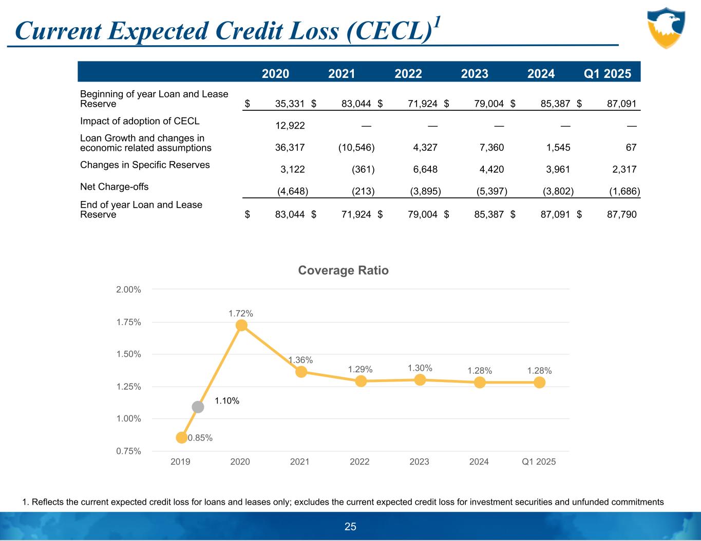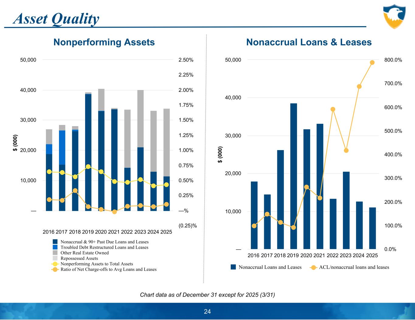 Asset Quality Chart data as of December 31 except for 2025 (3/31) $ (0 00 ) Nonaccrual Loans and Leases ACL/nonaccrual loans and leases 2016 2017 2018 2019 2020 2021 2022 2023 2024 2025 — 10,000 20,000 30,000 40,000 50,000 0.0% 100.0% 200.0% 300.0% 400.0% 500.0% 600.0% 700.0% 800.0% $ (0 00 ) Nonaccrual & 90+ Past Due Loans and Leases Troubled Debt Restructured Loans and Leases Other Real Estate Owned Repossessed Assets Nonperforming Assets to Total Assets Ratio of Net Charge-offs to Avg Loans and Leases 2016 2017 2018 2019 2020 2021 2022 2023 2024 2025 — 10,000 20,000 30,000 40,000 50,000 (0.25)% —% 0.25% 0.50% 0.75% 1.00% 1.25% 1.50% 1.75% 2.00% 2.25% 2.50% 24 Nonperforming Assets Nonaccrual Loans & Leases