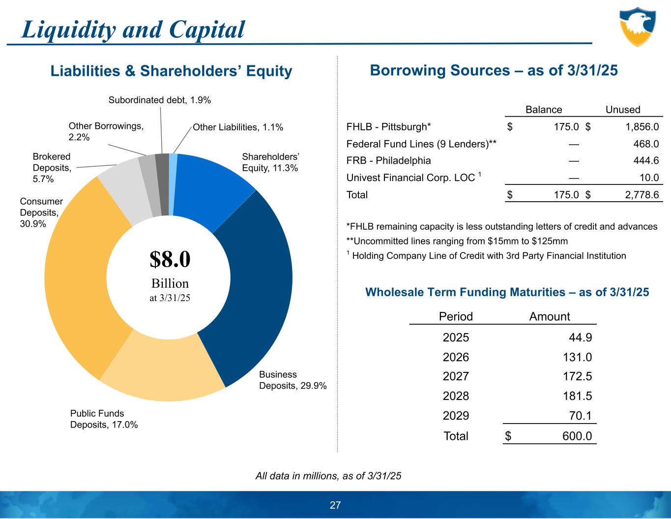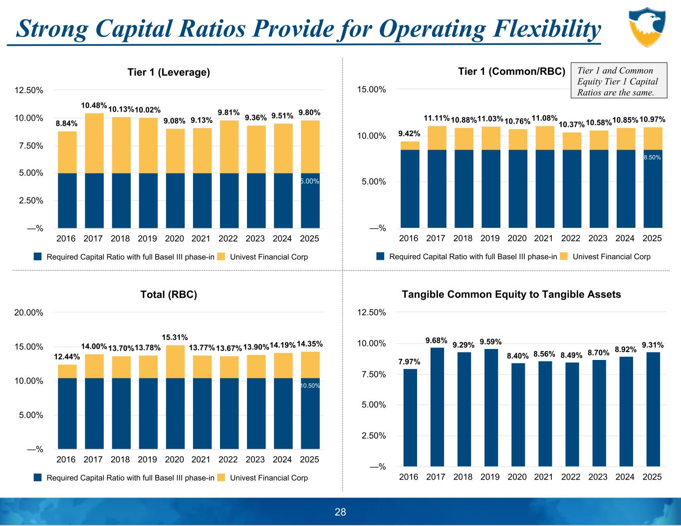 Liquidity and Capital All data in millions, as of 3/31/25 Balance Unused FHLB - Pittsburgh* $ 175.0 $ 1,856.0 Federal Fund Lines (9 Lenders)** — 468.0 FRB - Philadelphia — 444.6 Univest Financial Corp. LOC 1 — 10.0 Total $ 175.0 $ 2,778.6 *FHLB remaining capacity is less outstanding letters of credit and advances **Uncommitted lines ranging from $15mm to $125mm 1 Holding Company Line of Credit with 3rd Party Financial Institution Period Amount 2025 44.9 2026 131.0 2027 172.5 2028 181.5 2029 70.1 Total $ 600.0 27 Liabilities & Shareholders’ Equity Borrowing Sources – as of 3/31/25 Wholesale Term Funding Maturities – as of 3/31/25 Business Deposits, 29.9% Public Funds Deposits, 17.0% Consumer Deposits, 30.9% Brokered Deposits, 5.7% Other Borrowings, 2.2% Subordinated debt, 1.9% Other Liabilities, 1.1% Shareholders’ Equity, 11.3% $8.0 Billion at 3/31/25