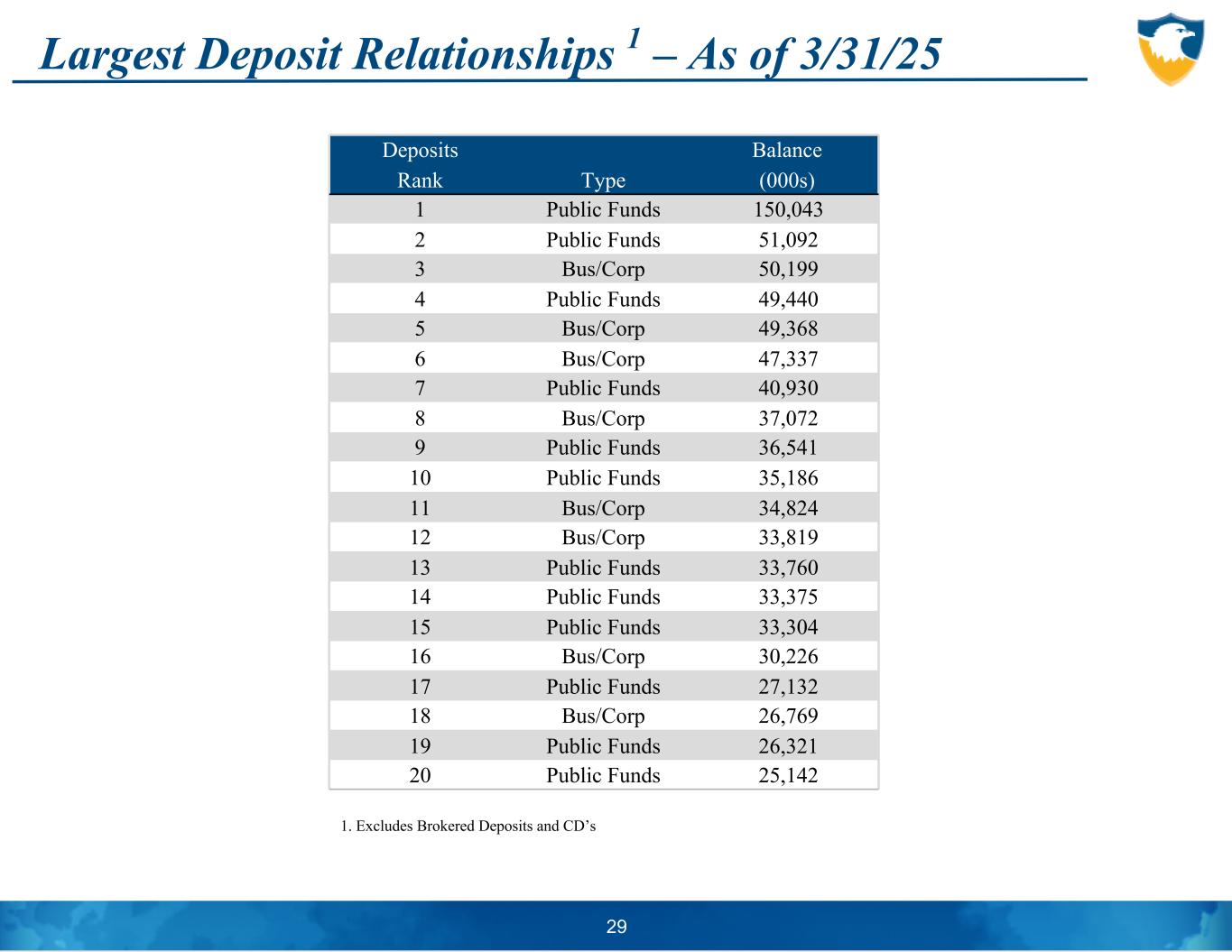 Largest Deposit Relationships 1 – As of 3/31/25 29 Deposits Balance Rank Type (000s) 1 Public Funds 150,043 2 Public Funds 51,092 3 Bus/Corp 50,199 4 Public Funds 49,440 5 Bus/Corp 49,368 6 Bus/Corp 47,337 7 Public Funds 40,930 8 Bus/Corp 37,072 9 Public Funds 36,541 10 Public Funds 35,186 11 Bus/Corp 34,824 12 Bus/Corp 33,819 13 Public Funds 33,760 14 Public Funds 33,375 15 Public Funds 33,304 16 Bus/Corp 30,226 17 Public Funds 27,132 18 Bus/Corp 26,769 19 Public Funds 26,321 20 Public Funds 25,142 1. Excludes Brokered Deposits and CD’s