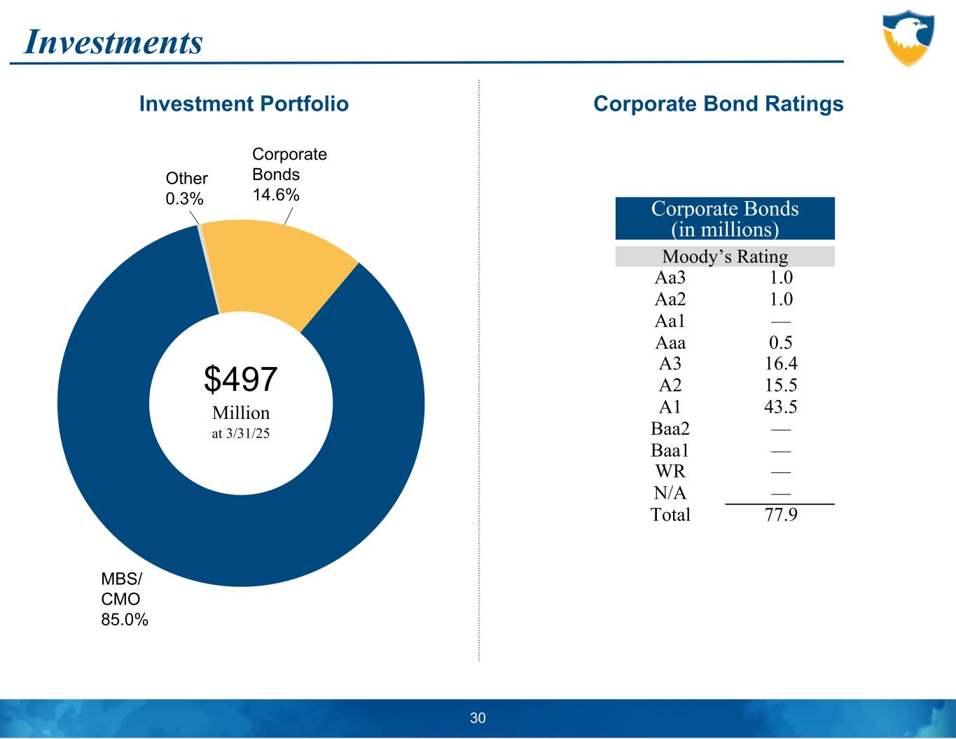 Investments Corporate Bonds (in millions) Moody’s Rating Aa3 1.0 Aa2 1.0 Aa1 — Aaa 0.5 A3 16.4 A2 15.5 A1 43.5 Baa2 — Baa1 — WR — N/A — Total 77.9 30 MBS/ CMO 85.0% Other 0.3% Corporate Bonds 14.6% $497 Million at 3/31/25 Investment Portfolio Corporate Bond Ratings