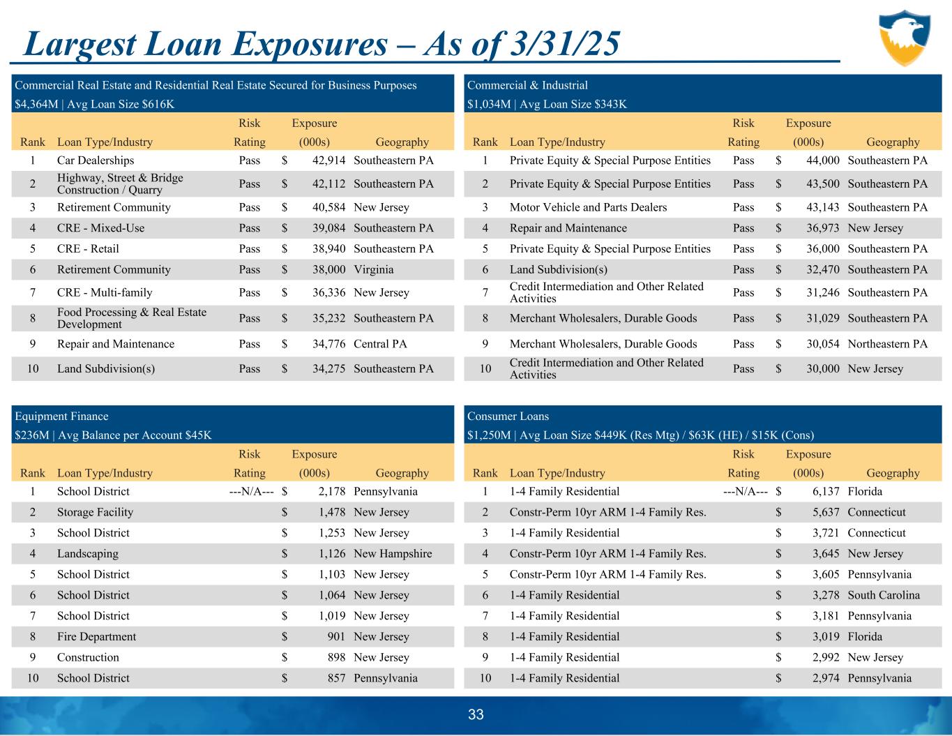 Largest Loan Exposures – As of 3/31/25 33 Commercial Real Estate and Residential Real Estate Secured for Business Purposes Commercial & Industrial $4,364M | Avg Loan Size $616K $1,034M | Avg Loan Size $343K Risk Exposure Risk Exposure Rank Loan Type/Industry Rating (000s) Geography Rank Loan Type/Industry Rating (000s) Geography 1 Car Dealerships Pass $ 42,914 Southeastern PA 1 Private Equity & Special Purpose Entities Pass $ 44,000 Southeastern PA 2 Highway, Street & Bridge Construction / Quarry Pass $ 42,112 Southeastern PA 2 Private Equity & Special Purpose Entities Pass $ 43,500 Southeastern PA 3 Retirement Community Pass $ 40,584 New Jersey 3 Motor Vehicle and Parts Dealers Pass $ 43,143 Southeastern PA 4 CRE - Mixed-Use Pass $ 39,084 Southeastern PA 4 Repair and Maintenance Pass $ 36,973 New Jersey 5 CRE - Retail Pass $ 38,940 Southeastern PA 5 Private Equity & Special Purpose Entities Pass $ 36,000 Southeastern PA 6 Retirement Community Pass $ 38,000 Virginia 6 Land Subdivision(s) Pass $ 32,470 Southeastern PA 7 CRE - Multi-family Pass $ 36,336 New Jersey 7 Credit Intermediation and Other Related Activities Pass $ 31,246 Southeastern PA 8 Food Processing & Real Estate Development Pass $ 35,232 Southeastern PA 8 Merchant Wholesalers, Durable Goods Pass $ 31,029 Southeastern PA 9 Repair and Maintenance Pass $ 34,776 Central PA 9 Merchant Wholesalers, Durable Goods Pass $ 30,054 Northeastern PA 10 Land Subdivision(s) Pass $ 34,275 Southeastern PA 10 Credit Intermediation and Other Related Activities Pass $ 30,000 New Jersey Equipment Finance Consumer Loans $236M | Avg Balance per Account $45K $1,250M | Avg Loan Size $449K (Res Mtg) / $63K (HE) / $15K (Cons) Risk Exposure Risk Exposure Rank Loan Type/Industry Rating (000s) Geography Rank Loan Type/Industry Rating (000s) Geography 1 School District ‘---N/A--- $ 2,178 Pennsylvania 1 1-4 Family Residential ‘---N/A--- $ 6,137 Florida 2 Storage Facility $ 1,478 New Jersey 2 Constr-Perm 10yr ARM 1-4 Family Res. $ 5,637 Connecticut 3 School District $ 1,253 New Jersey 3 1-4 Family Residential $ 3,721 Connecticut 4 Landscaping $ 1,126 New Hampshire 4 Constr-Perm 10yr ARM 1-4 Family Res. $ 3,645 New Jersey 5 School District $ 1,103 New Jersey 5 Constr-Perm 10yr ARM 1-4 Family Res. $ 3,605 Pennsylvania 6 School District $ 1,064 New Jersey 6 1-4 Family Residential $ 3,278 South Carolina 7 School District $ 1,019 New Jersey 7 1-4 Family Residential $ 3,181 Pennsylvania 8 Fire Department $ 901 New Jersey 8 1-4 Family Residential $ 3,019 Florida 9 Construction $ 898 New Jersey 9 1-4 Family Residential $ 2,992 New Jersey 10 School District $ 857 Pennsylvania 10 1-4 Family Residential $ 2,974 Pennsylvania