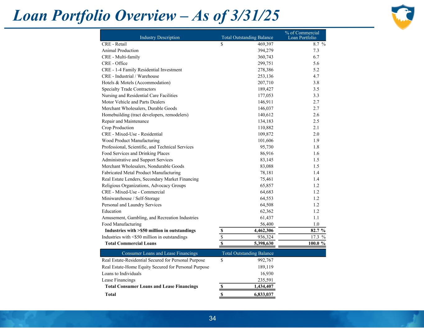 Loan Portfolio Overview – As of 3/31/25 34 Industry Description Total Outstanding Balance % of Commercial Loan Portfolio CRE - Retail $ 469,397 8.7 % Animal Production 394,279 7.3 CRE - Multi-family 360,743 6.7 CRE - Office 299,751 5.6 CRE - 1-4 Family Residential Investment 278,386 5.2 CRE - Industrial / Warehouse 253,136 4.7 Hotels & Motels (Accommodation) 207,710 3.8 Specialty Trade Contractors 189,427 3.5 Nursing and Residential Care Facilities 177,053 3.3 Motor Vehicle and Parts Dealers 146,911 2.7 Merchant Wholesalers, Durable Goods 146,037 2.7 Homebuilding (tract developers, remodelers) 140,612 2.6 Repair and Maintenance 134,183 2.5 Crop Production 110,882 2.1 CRE - Mixed-Use - Residential 109,872 2.0 Wood Product Manufacturing 101,606 1.9 Professional, Scientific, and Technical Services 95,730 1.8 Food Services and Drinking Places 86,916 1.6 Administrative and Support Services 83,145 1.5 Merchant Wholesalers, Nondurable Goods 83,088 1.5 Fabricated Metal Product Manufacturing 78,181 1.4 Real Estate Lenders, Secondary Market Financing 75,461 1.4 Religious Organizations, Advocacy Groups 65,857 1.2 CRE - Mixed-Use - Commercial 64,683 1.2 Miniwarehouse / Self-Storage 64,553 1.2 Personal and Laundry Services 64,508 1.2 Education 62,362 1.2 Amusement, Gambling, and Recreation Industries 61,437 1.1 Food Manufacturing 56,400 1.0 Industries with >$50 million in outstandings $ 4,462,306 82.7 % Industries with <$50 million in outstandings $ 936,324 17.3 % Total Commercial Loans $ 5,398,630 100.0 % Consumer Loans and Lease Financings Total Outstanding Balance Real Estate-Residential Secured for Personal Purpose $ 992,767 Real Estate-Home Equity Secured for Personal Purpose 189,119 Loans to Individuals 16,930 Lease Financings 235,591 Total Consumer Loans and Lease Financings $ 1,434,407 Total $ 6,833,037