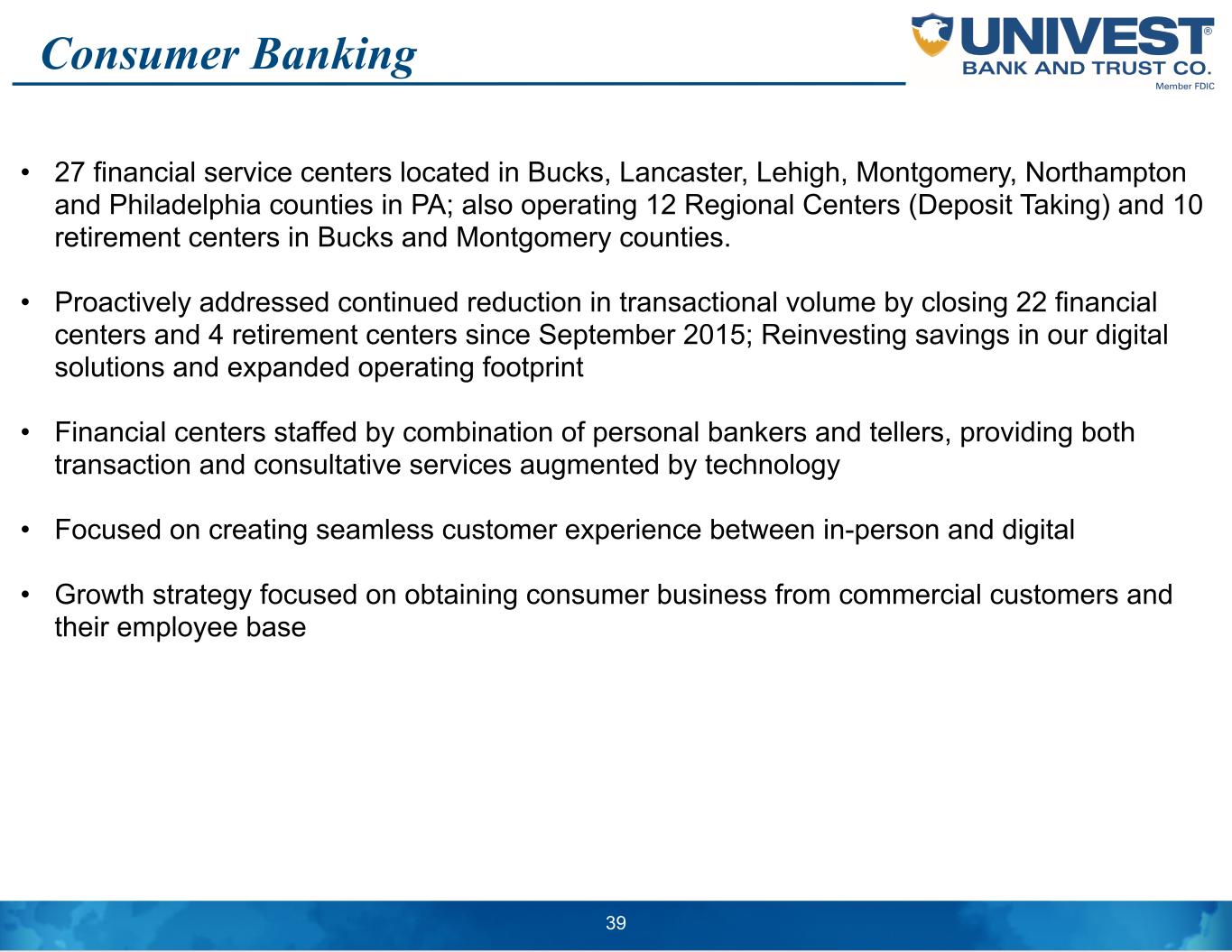Consumer Banking • 27 financial service centers located in Bucks, Lancaster, Lehigh, Montgomery, Northampton and Philadelphia counties in PA; also operating 12 Regional Centers (Deposit Taking) and 10 retirement centers in Bucks and Montgomery counties. • Proactively addressed continued reduction in transactional volume by closing 22 financial centers and 4 retirement centers since September 2015; Reinvesting savings in our digital solutions and expanded operating footprint • Financial centers staffed by combination of personal bankers and tellers, providing both transaction and consultative services augmented by technology • Focused on creating seamless customer experience between in-person and digital • Growth strategy focused on obtaining consumer business from commercial customers and their employee base 39